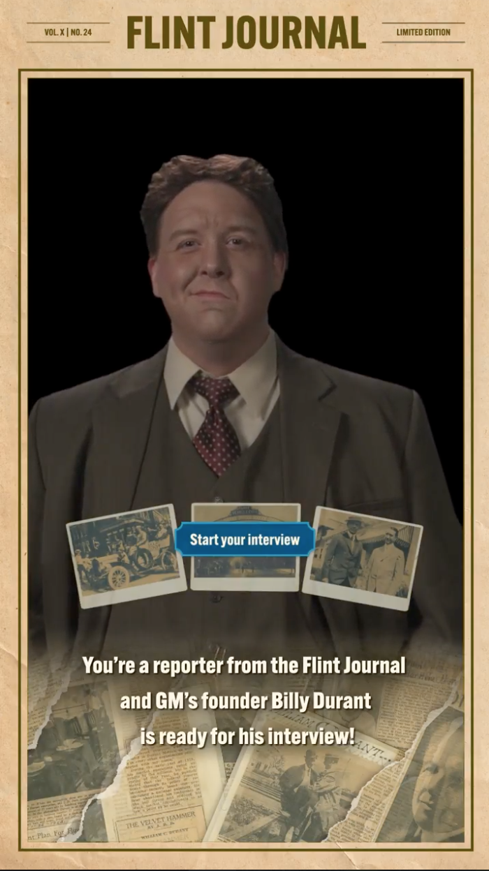 General Motors founder Billy Durant helped put Flint on the map as the birthplace of the automotive industry. In this augmented reality experience, visitors step into the role of a Flint Journal reporter to interview Durant for a first-person account of this transformative time.
