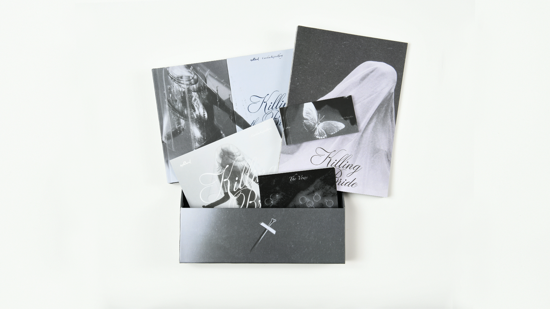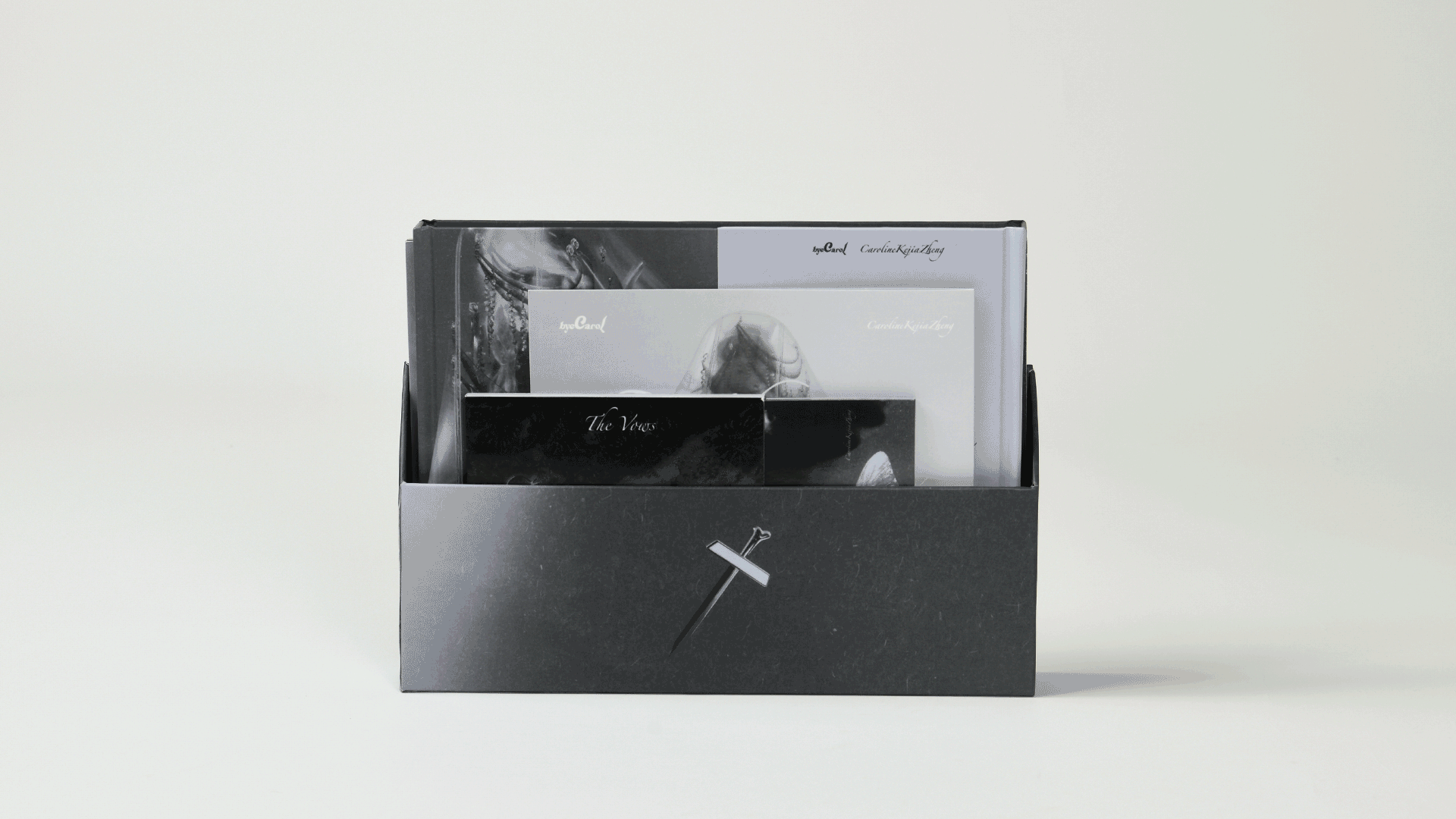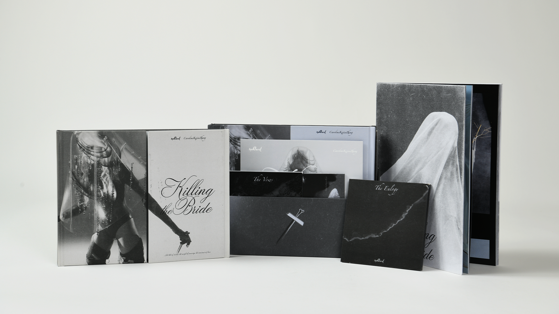 All five volumes use Coptic binding to expose the spine and open fully, then nest in a custom, die-cut “grave box.” A unified black-and-white palette and elegant serif typography reinforce the collection’s stark, resistant aesthetic. Together, these publications form an immersive artifact that challenges tradition, spotlights craftsmanship, and amplifies byeCarol’s call to reexamine the rituals of love and commitment.