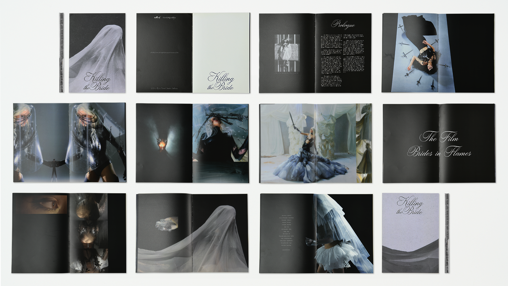 Wedding or Funeral (Lookbook): Open-book spreads lie flat, inviting tactile engagement as each page reveals dramatic editorial imagery.