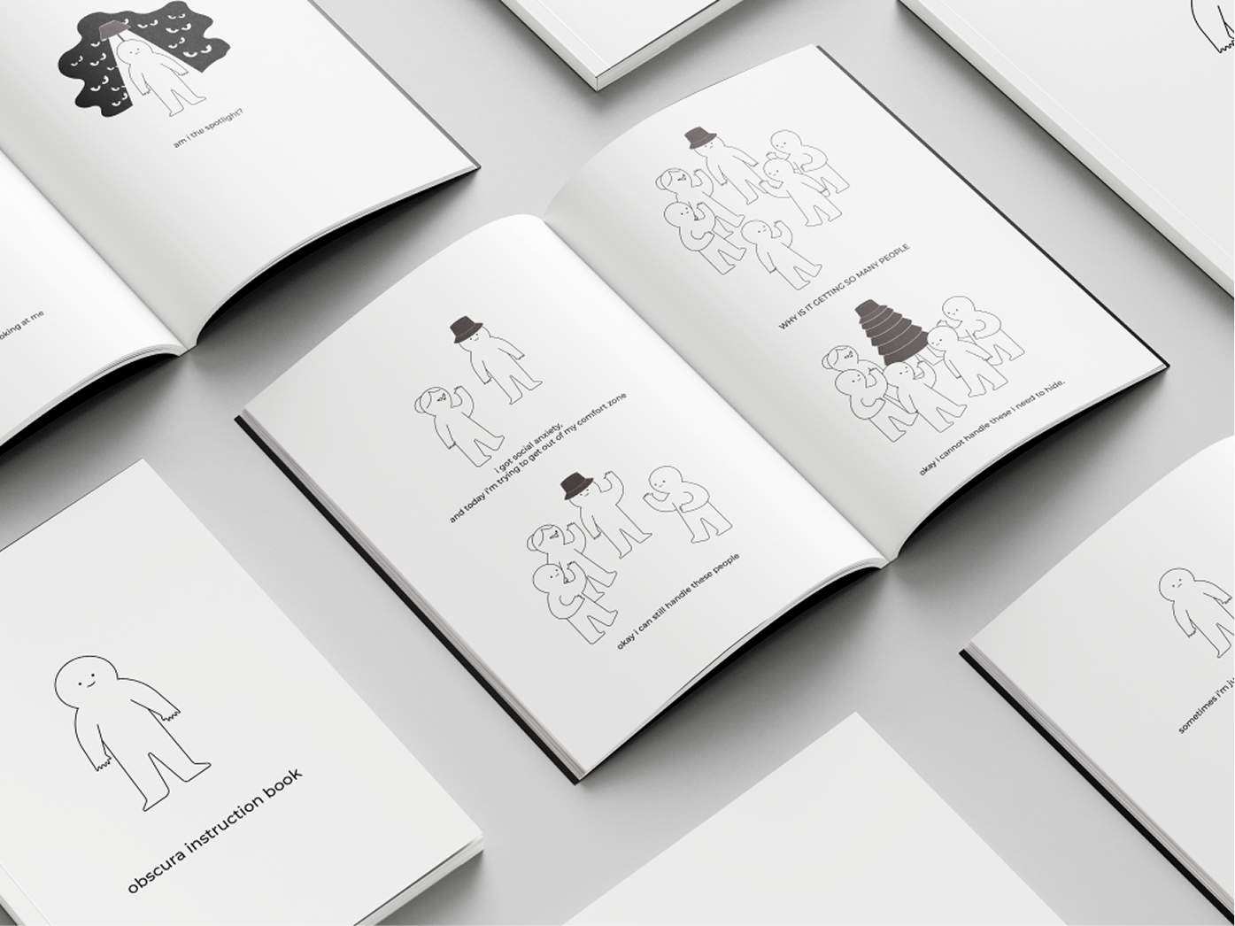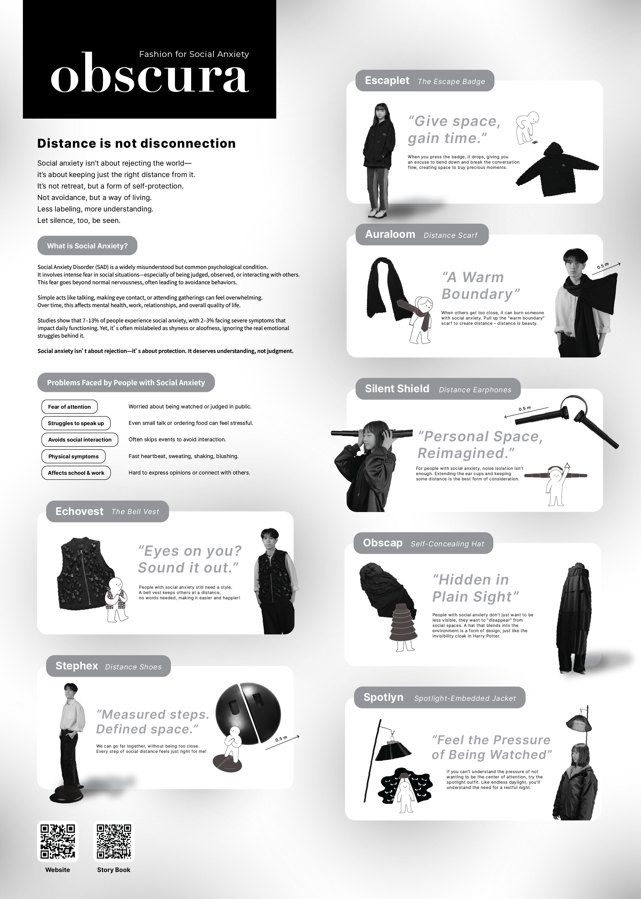 The project also includes supporting elements like product manuals, a fashion magazine, and an interactive website featuring a social anxiety self-test. Together, these components create an ecosystem of understanding—where design, psychology, and storytelling converge.