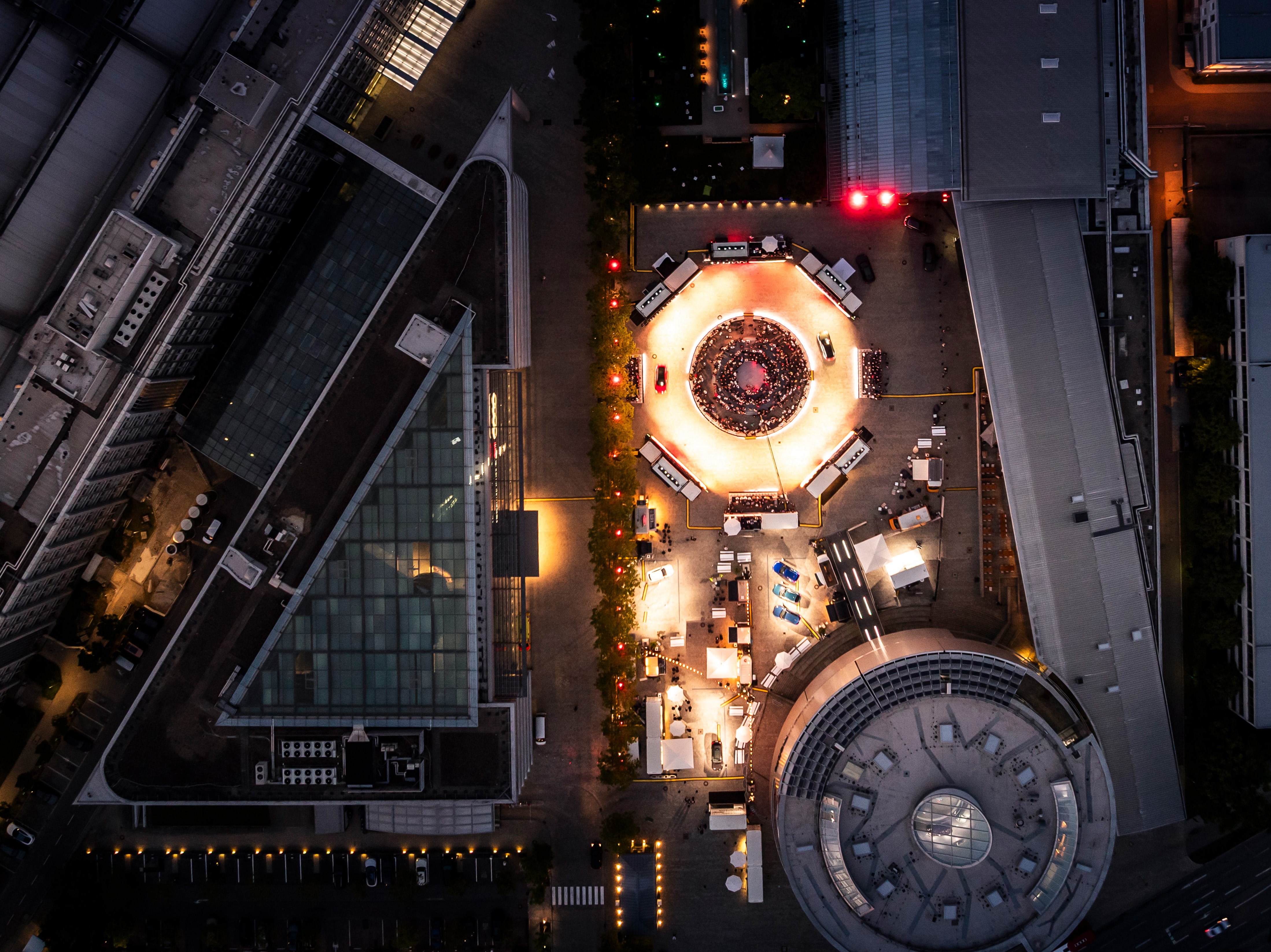 Guests explored the production site and test-drove the current Audi fleet. Then, as night fell, the transformation began. The container village became a colosseum. In the circular arena, 18 vehicles from seven product lines opened the show with precise choreographed driving, setting the stage for the dramatic arrival of the Q3. With the audience surrounding the centre on stepped grandstands, CEO Gernot Döllner stood amongst the crowd, sharing the moment with them.