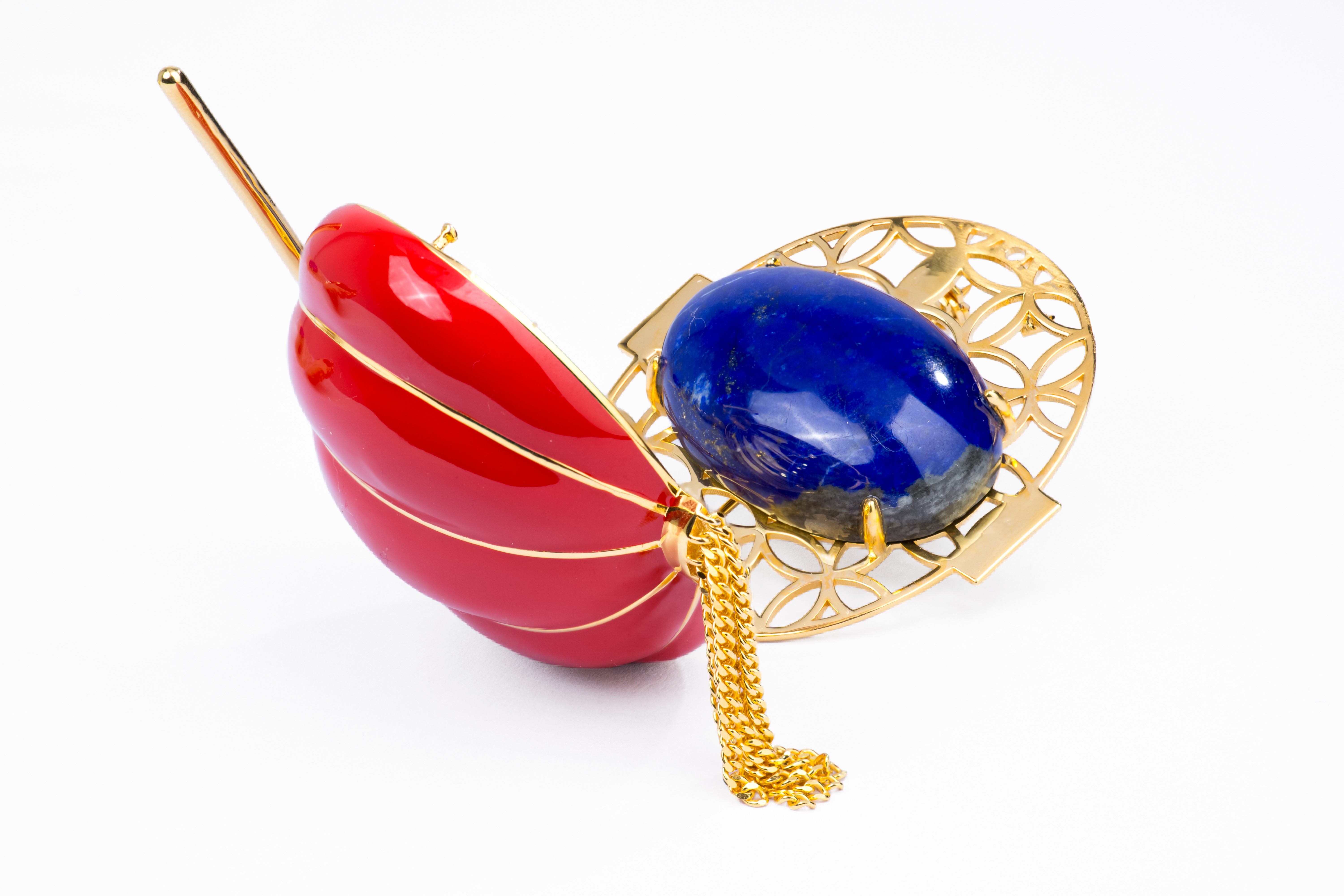 When the brooch is opened, it is like opening a door to a secret realm of Eastern aesthetics. The interior features a golden frame in the shape of a flower window, with exquisite hollowed-out patterns that exude classical elegance. The lapis lazuli inlaid in the frame, with its deep and deep blue color, forms a sharp and harmonious contrast with the gold. By drawing on the classical aesthetics contained in the stained glass Windows and the mysterious depth of lapis lazuli, a richly layered visual experience is created, achieving a dialogue between tradition and modernity - traditional elements are the foundation, and modern craftsmanship endows them with new forms of presentation. It also achieves a blend of appearance and essence - on the outside, it is the festive image of Chinese lanterns, and on the inside, it is the profound accumulation of Eastern culture.