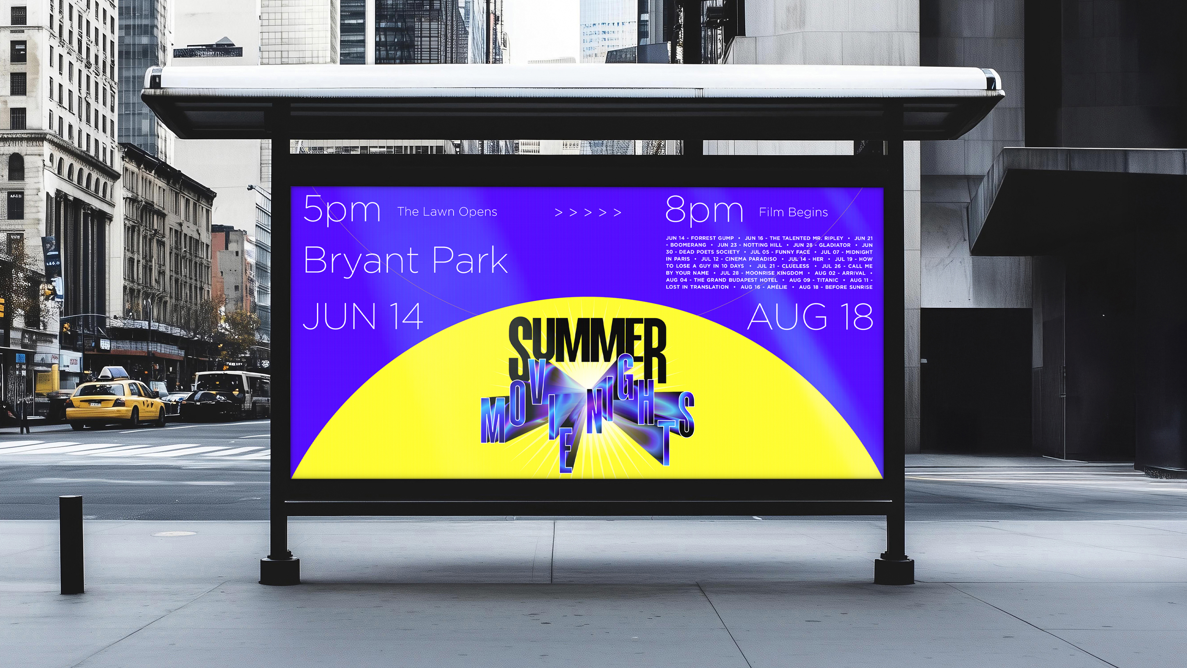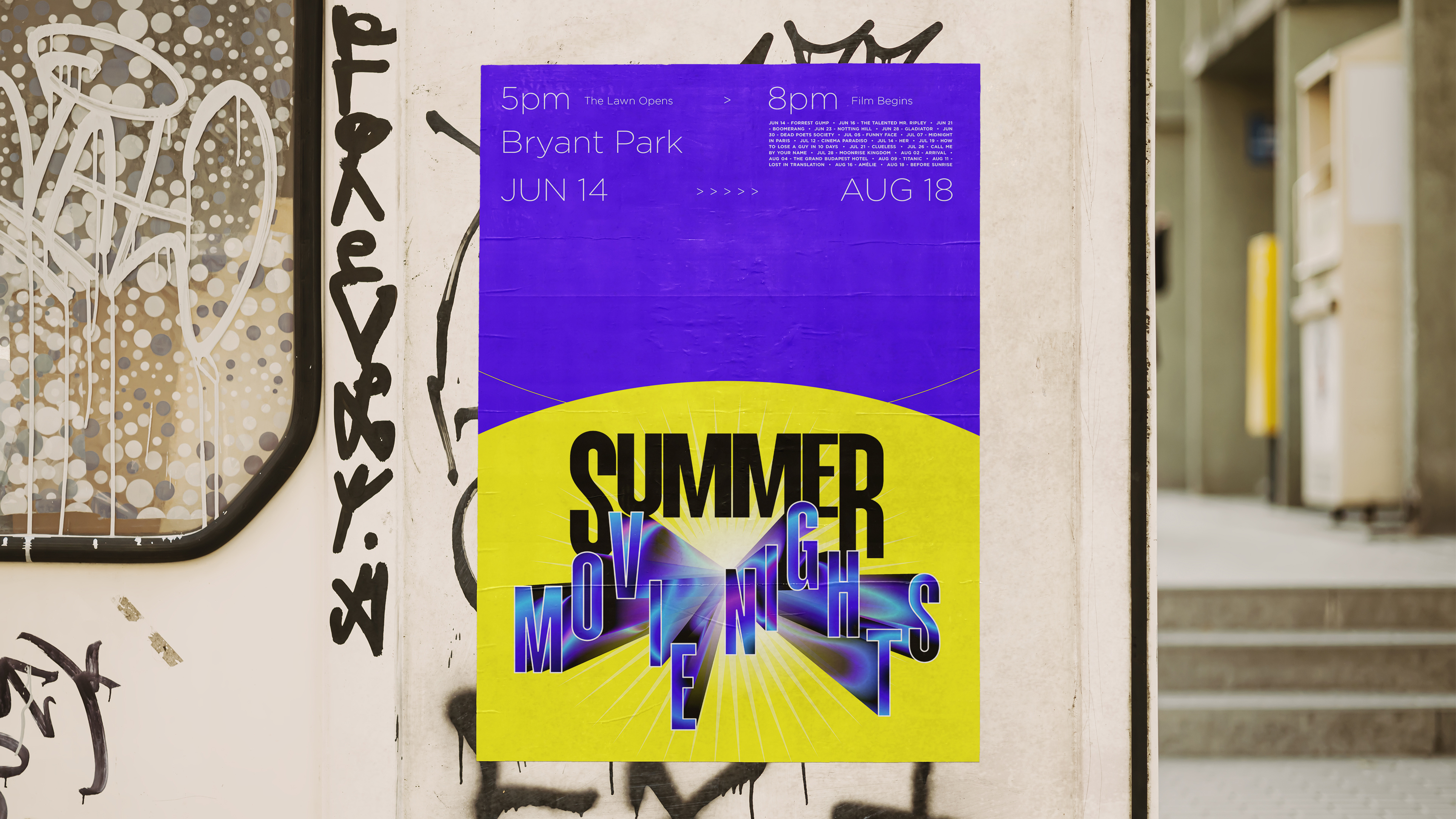 The visual for Summer Movie Nights uses typography to carry the energy and atmosphere of the event. The title “SUMMER” is set in a bold, upright sans serif that anchors the composition and creates a strong visual foundation, while “MOVIE NIGHTS” is treated with flowing, light infused letterforms in blue and purple gradients and dynamic blurring, evoking the glow of film projectors and the shimmer of city neon at night. This contrast is not only about weight and form but also about the rhythm between the anticipation before the screening and the radiance when the film begins.