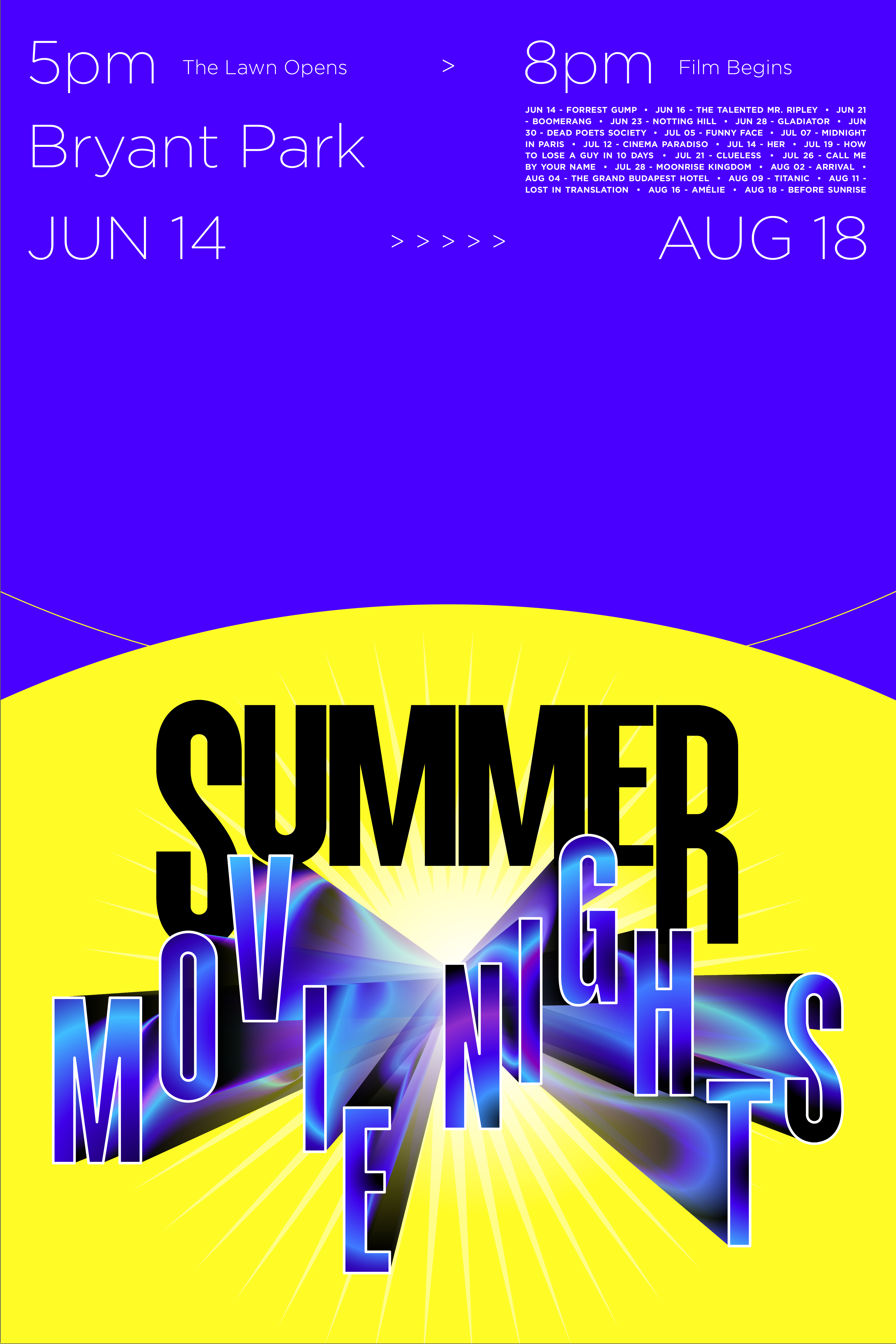 Typography is not just a vessel for information but the main character of the visual. The bright yet night inspired background pushes the letters toward the viewer, making them the first thing to catch the eye and instantly conveying the liveliness and joy of the event. The layout intentionally shifts and radiates certain letters to create a sense of sound and light in motion, like the feeling of sitting on the lawn, waiting for the screen to light up.