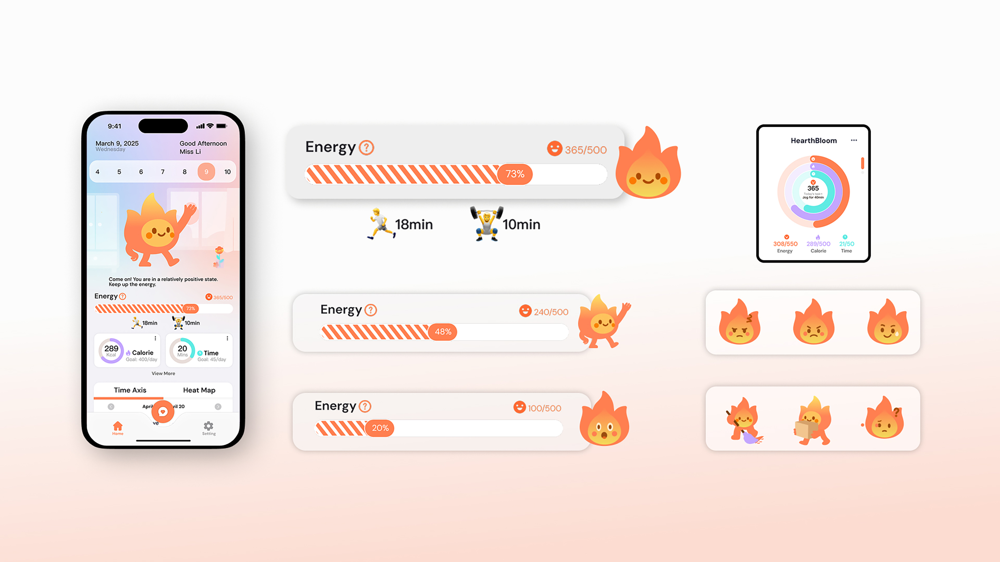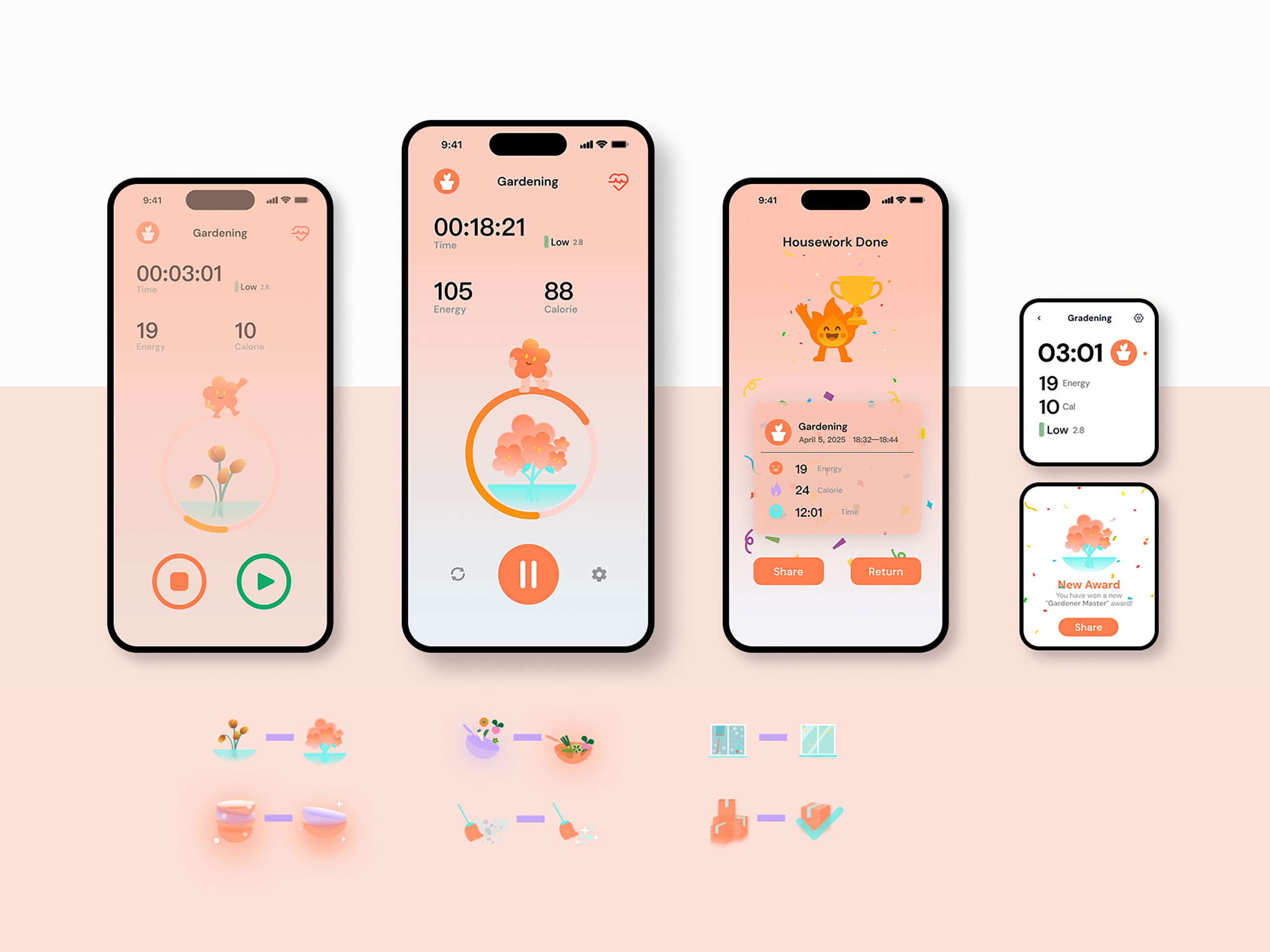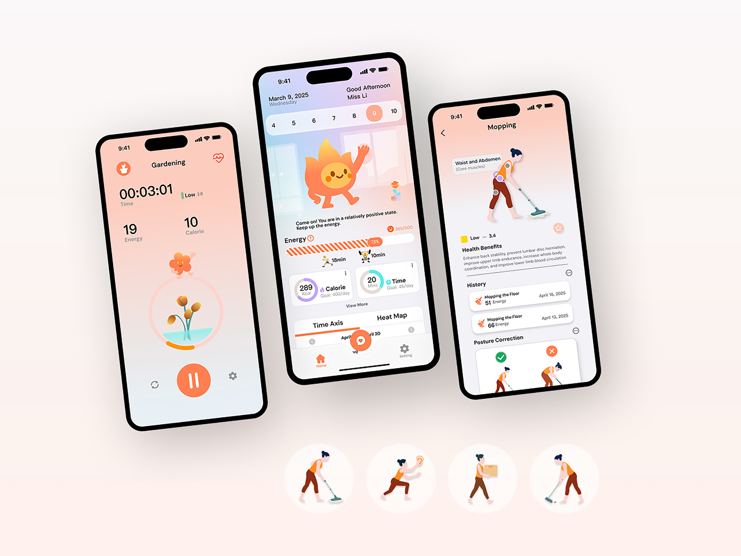 The system introduces a "Vitality Score" metric based on Metabolic Equivalents, translating chores like mopping, cooking, and laundry into quantifiable health achievements. It also tracks supplementary data like "Chore Duration" and "Calories Burned." Through an intuitive visual representation featuring the growth of an IP character and a progress bar of energy levels, users can clearly perceive the health benefits and personal value derived from their household activities.