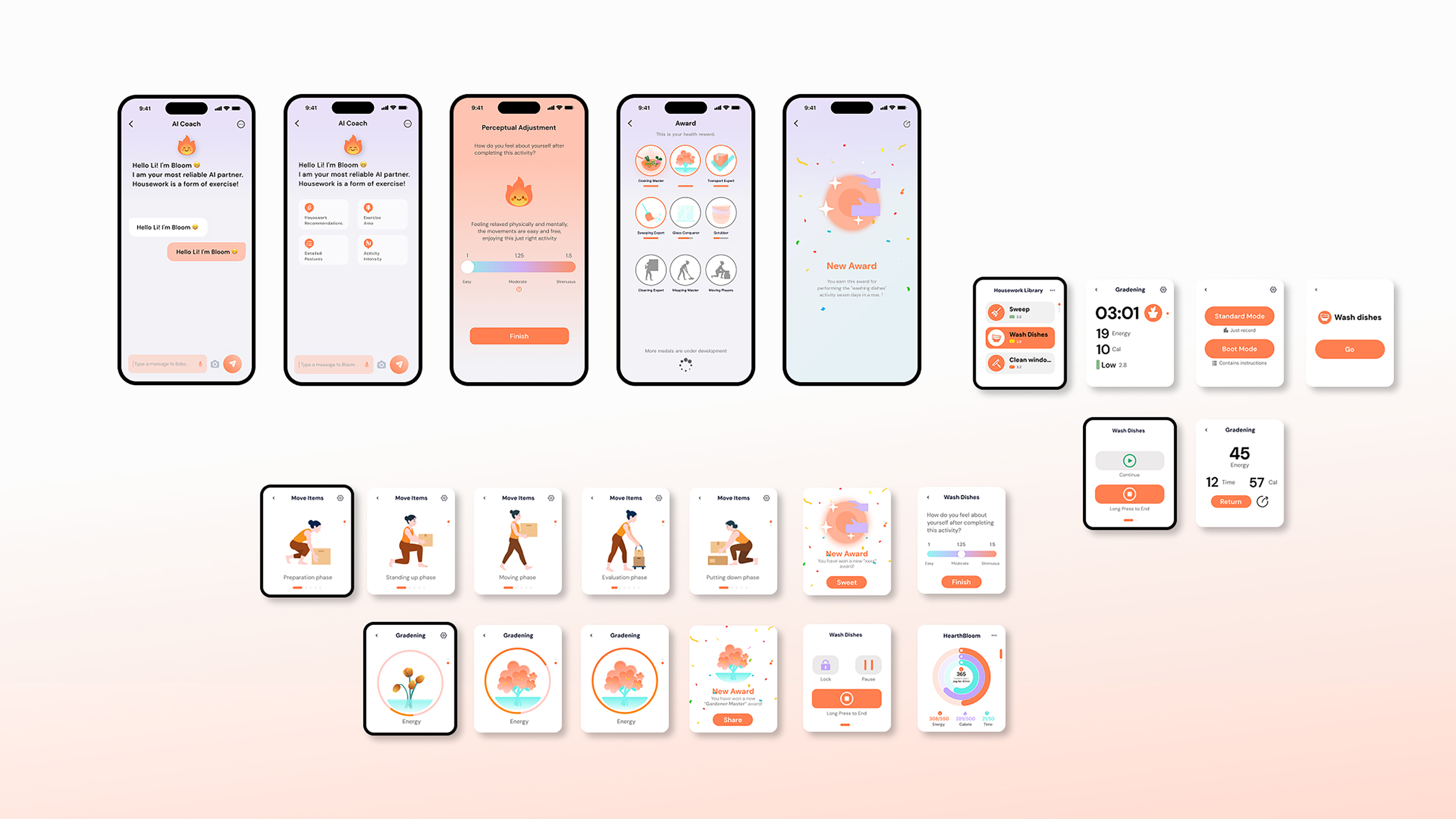 HealthBloom integrates AI-powered posture recognition with real-time animated feedback, offering standardized breakdowns and error alerts for 12 types of household movements. It offers users two modes to quickly start activity tracking via the app or smartwatch. Standard Mode focuses on data recording, using engaging visual elements—like blooming flowers, dirty dishes transforming from grimy to sparkling clean, and floors gradually shining from dusty to spotless—to deliver playful, real-time progress feedback. Guided Mode enhances training with step-by-step action breakdowns, voice cues, and vibration alerts to refine movements and reduce injury risks.