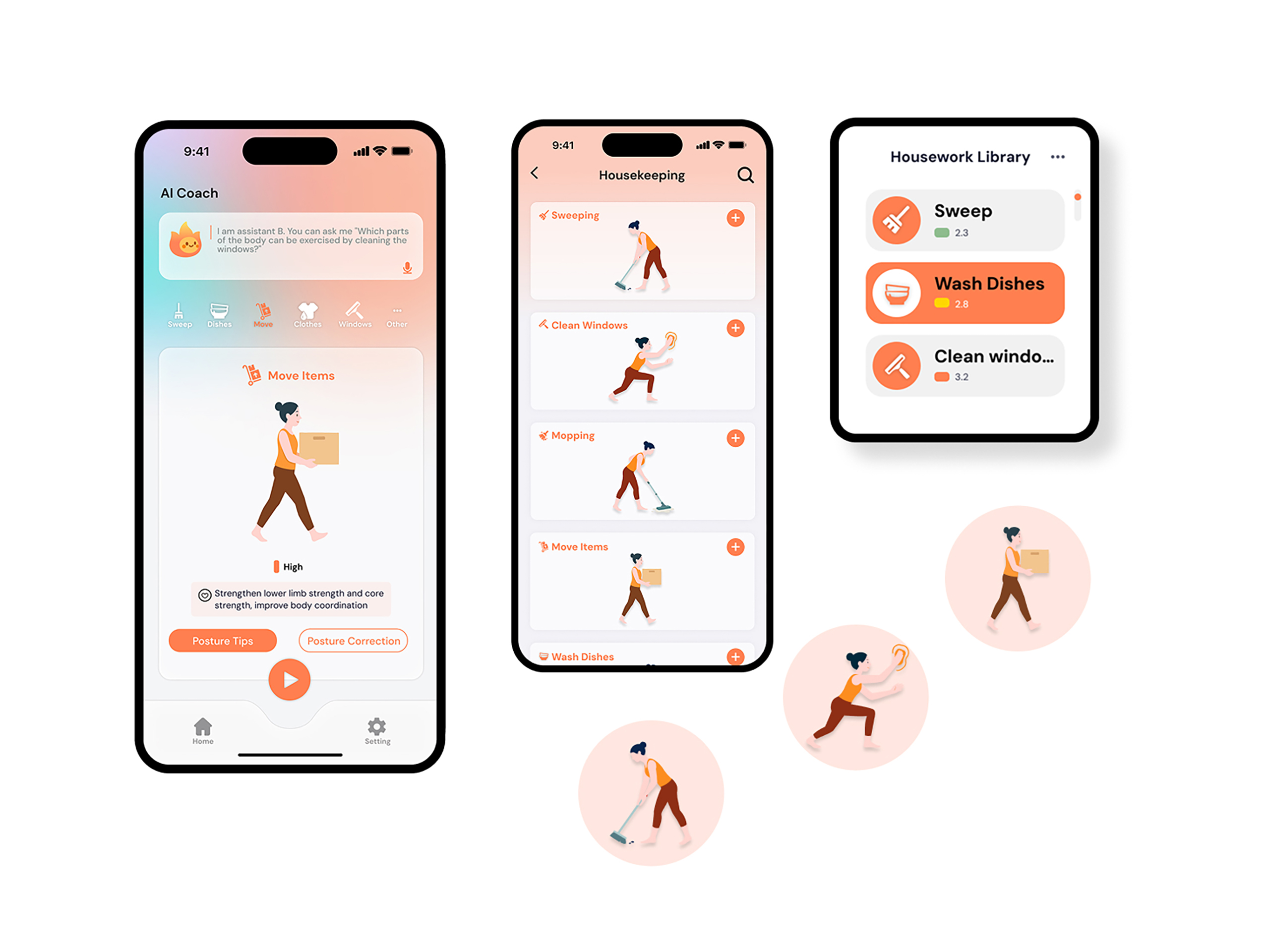 The system features a unique "Household Exercise Library", categorizing tasks by intensity and muscle groups, complete with comparative motion diagrams and key posture analysis to help users plan workouts scientifically. The AI coach offers personalized recommendations based on time availability and fitness goals, enabling "smart chore workout planning."