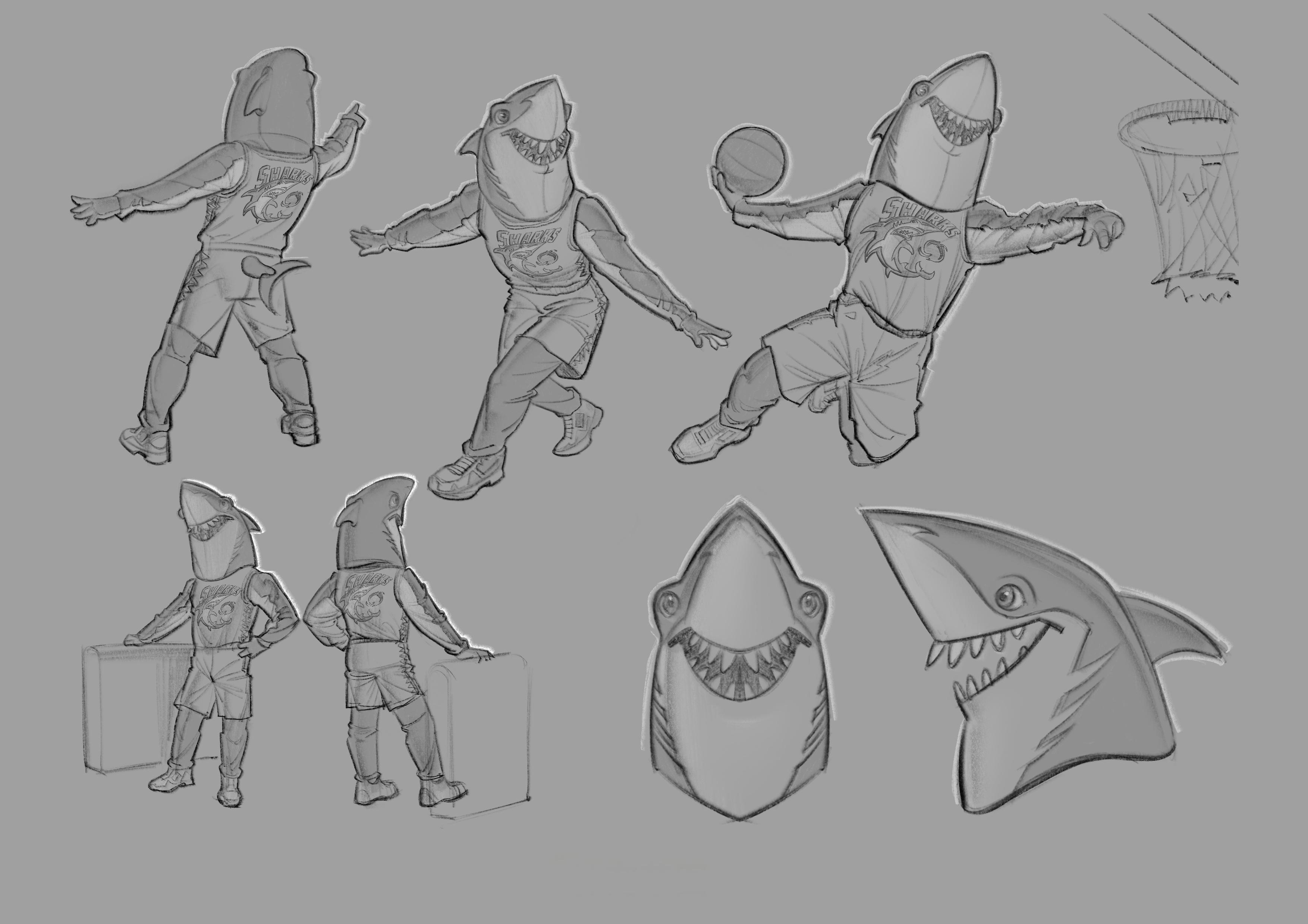 The overall design inspiration for “Steel Shark” comes from the shark’s unique contrast in nature—an endearing, almost playful appearance paired with a swift and fierce demeanor. This duality gives the character a distinctive personality and symbolizes the way athletes combine fun and power on the court. Our goal was to create a mascot that not only ignites fan enthusiasm but also brings a sense of lightheartedness and joy to the game atmosphere. Visually, the color palette inherits the classic orange and royal blue of the Shanghai Sharks’ previous CBA mascot, using the striking contrast to convey passion and vitality, echoing the team’s “Unstoppable Shark” spirit. The jagged pattern along the sides of the jersey is inspired by the shark’s sharp teeth, reinforcing both the theme and the sense of strength. The head design is simple yet bold, retaining the iconic silhouette of the great white shark, while subtle facial expressions strike a balance between charm and ferocity. The colors and forms are fully aligned with the team’s visual identity, making it easy to extend the design into merchandise, animated shorts, and fan engagement activities—boosting brand recognition and communication power. The biggest challenge during the design process was the client’s lack of a clear direction for facial expression. To address this, I prepared a wide range of head shape sketches early on, paired with various facial expressions and action poses for presentation. After multiple rounds of discussions and refinements, we arrived at a final design that satisfied all parties. In production, I employed an efficient workflow that blended traditional drawing with modern 3D technology: sculpting the head and structure in ZBrush, simulating fabrics in Marvelous Designer, creating textures and materials in Substance Painter, and finalizing lighting and rendering in Blender. This approach not only ensured strong expressiveness and accurate fidelity to the concept but also greatly improved efficiency and control at each stage. The key highlight of “Steel Shark” lies in its successful fusion of the shark’s playful and fierce traits, creating a powerful visual contrast that is both approachable and full of strength.