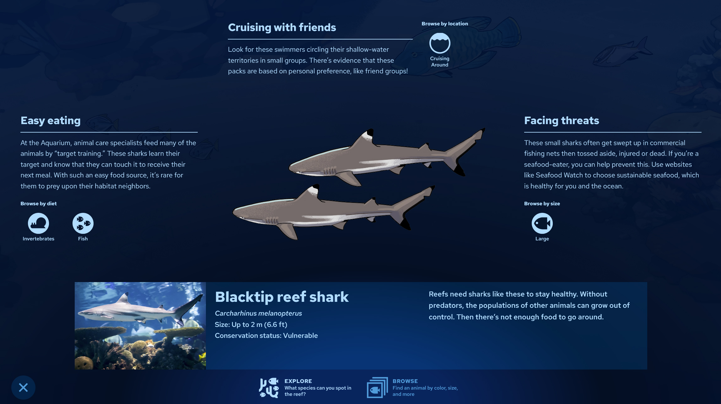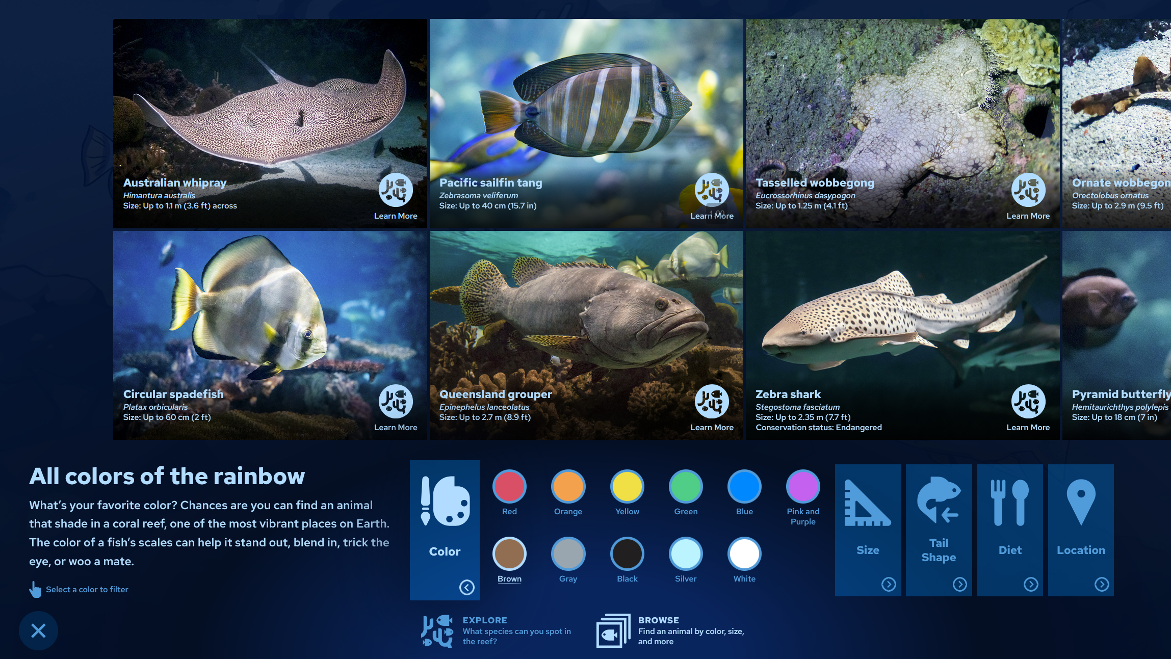 Both the Topside and Underwater interactives include a browsable ID mode, where visitors can filter Blacktip Reef’s species by traits such as color, size, or tail shape to quickly locate and learn about them. The digital display is integrated with the aquarium’s content management system, allowing staff to keep the touchscreen in sync with the actual animals in the tank.