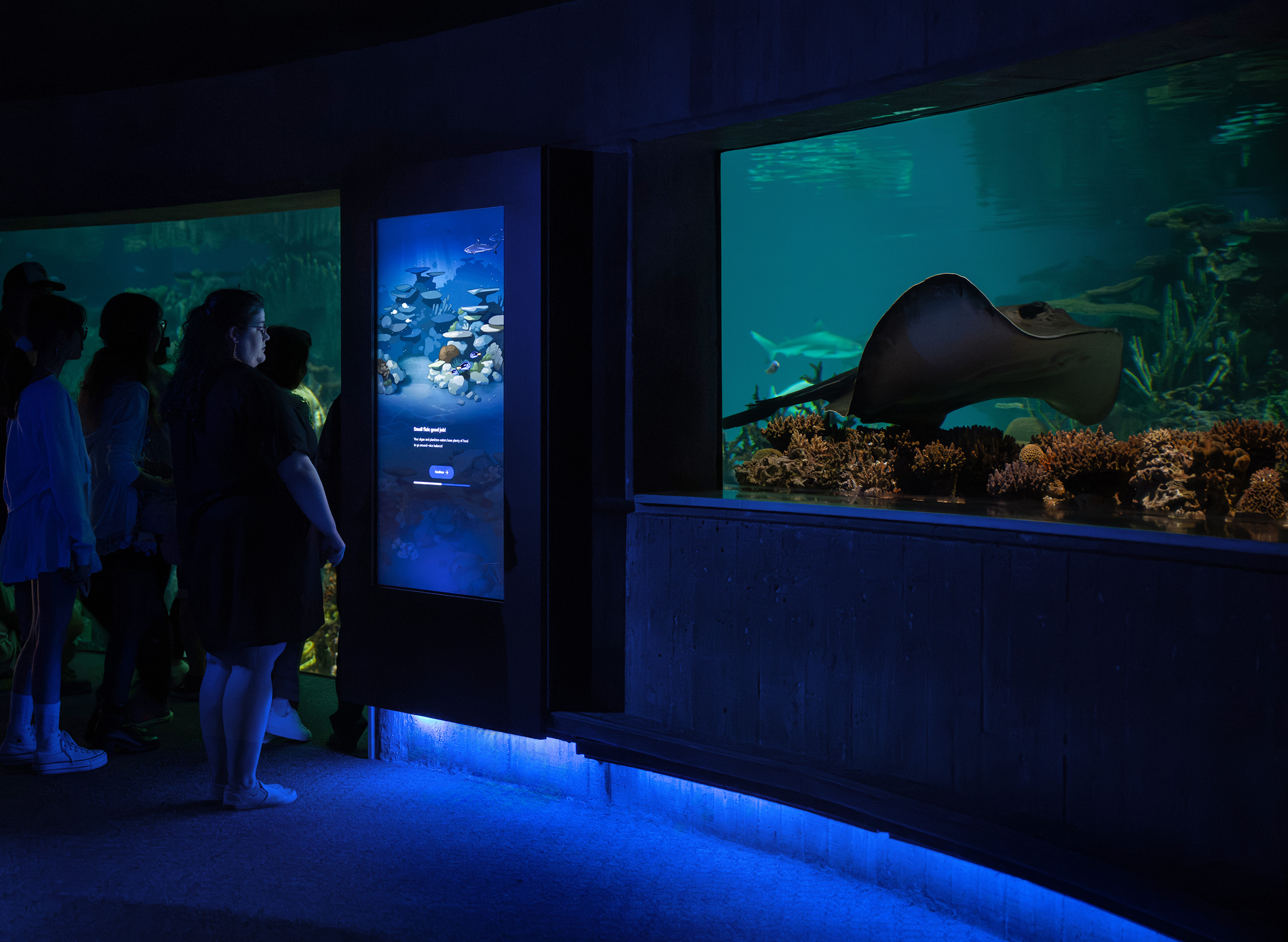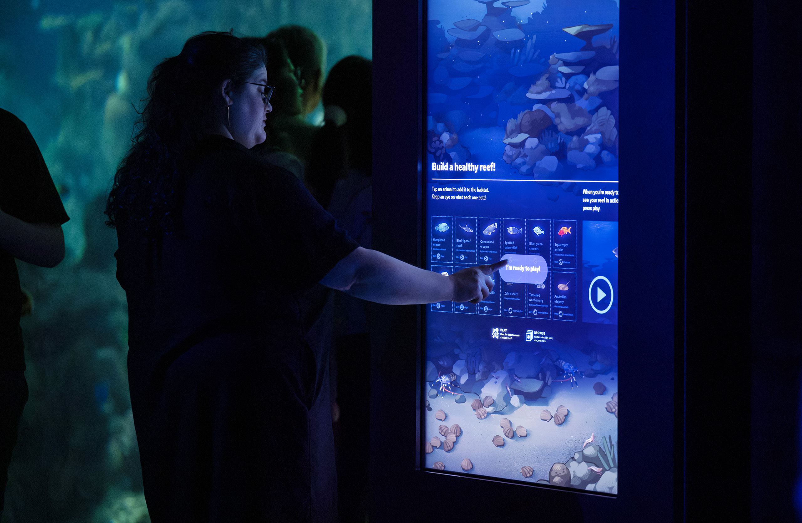 In the Underwater Viewing Gallery, we installed a reef ecosystem simulation game on two large vertical touchscreens. This experience invites visitors to add different combinations of species to the digital reef to create and maintain a healthy, biodiverse environment.