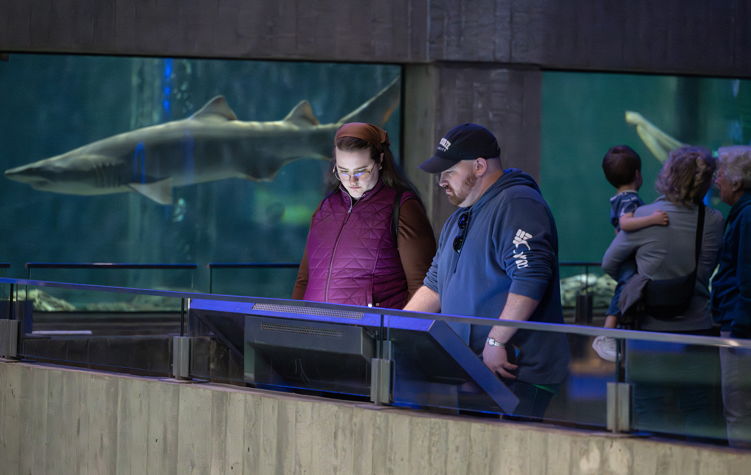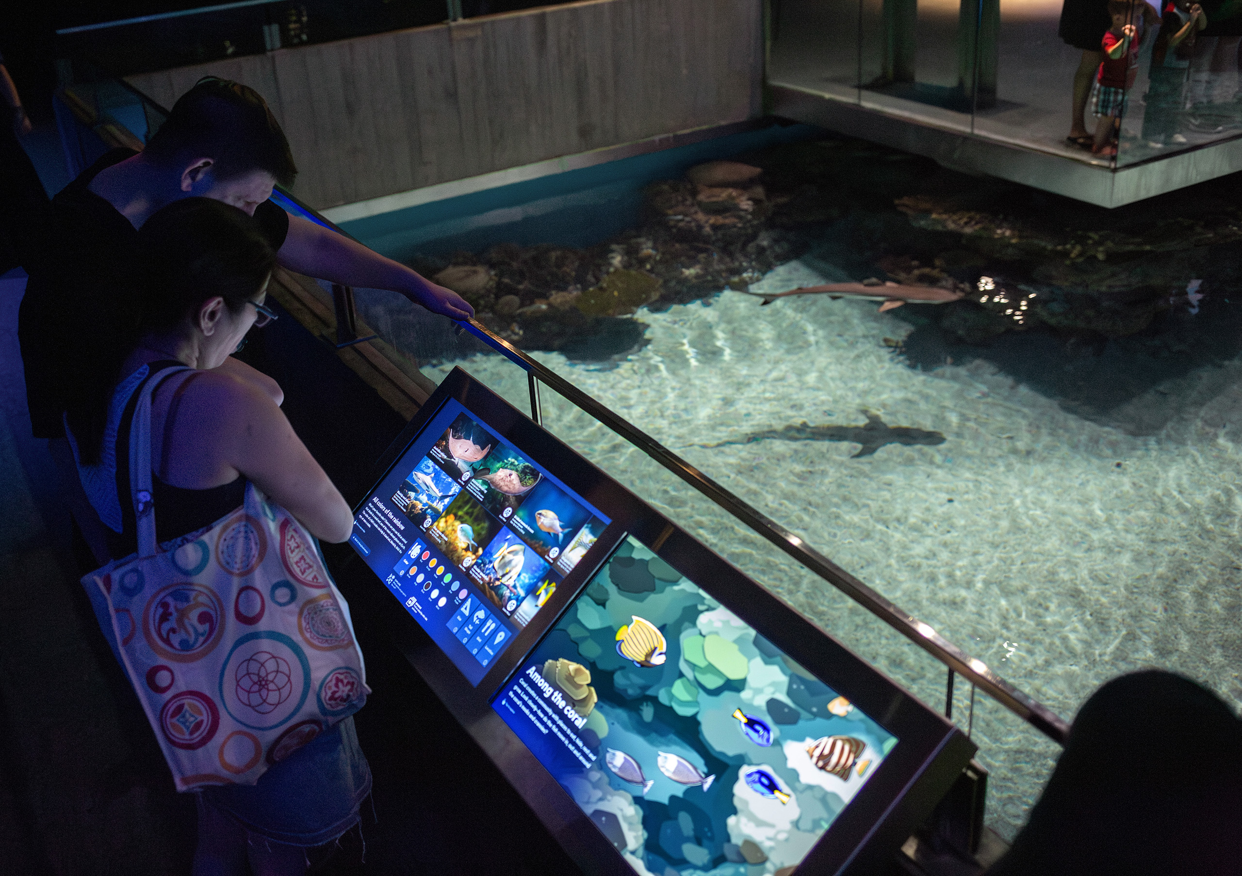In the Topside Viewing Gallery, visitors gaze down into the aquarium’s 270,000-gallon habitat. Here, they can explore the first digital interactive, which presents an ultra-wide, richly illustrated mural of the reef environment installed on six touchscreen kiosks throughout the gallery. With intuitive pinch-and-zoom navigation, guests can find 23 of Blacktip Reef’s inhabitants, then look up from the screen and spot those same animals swimming just feet away.