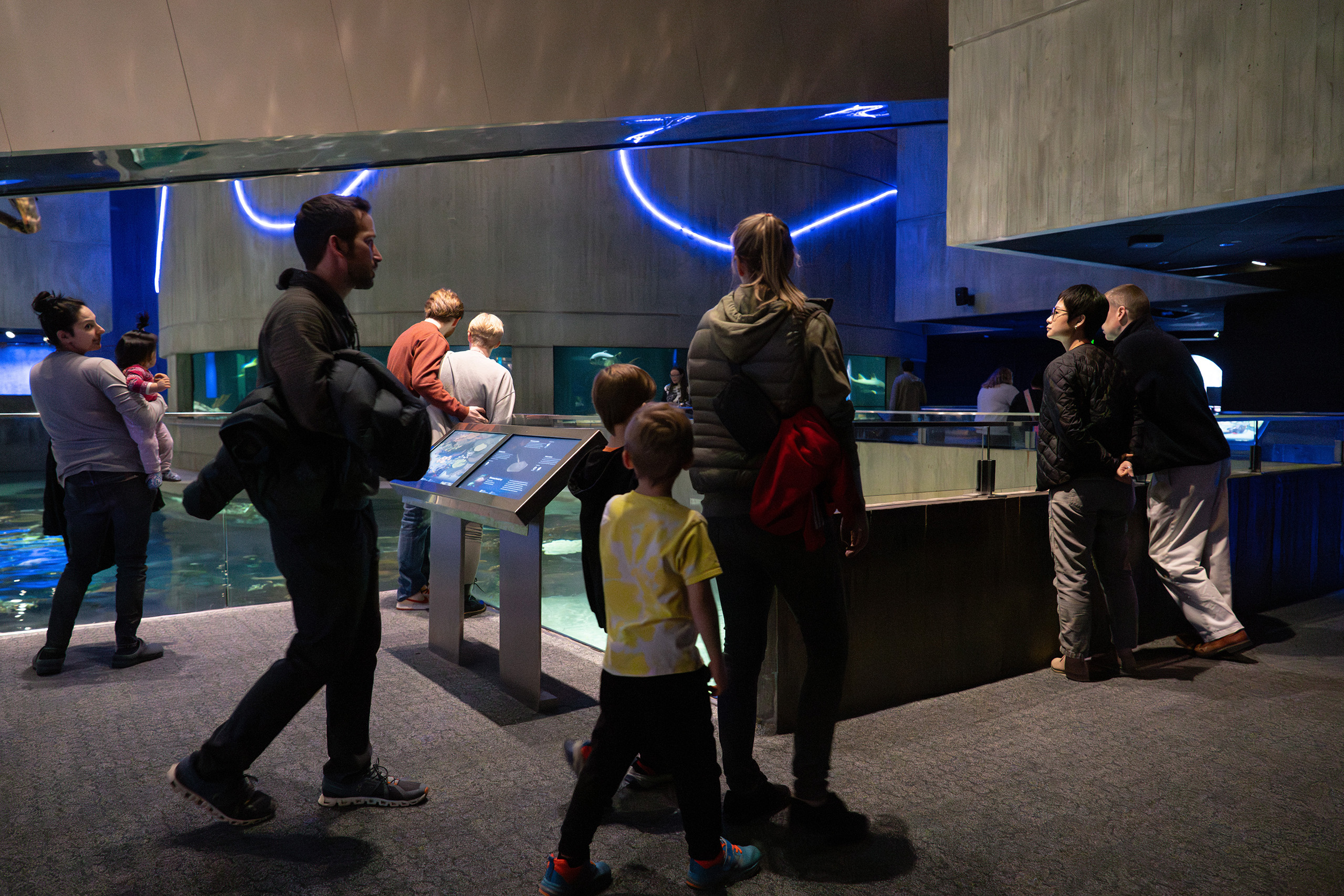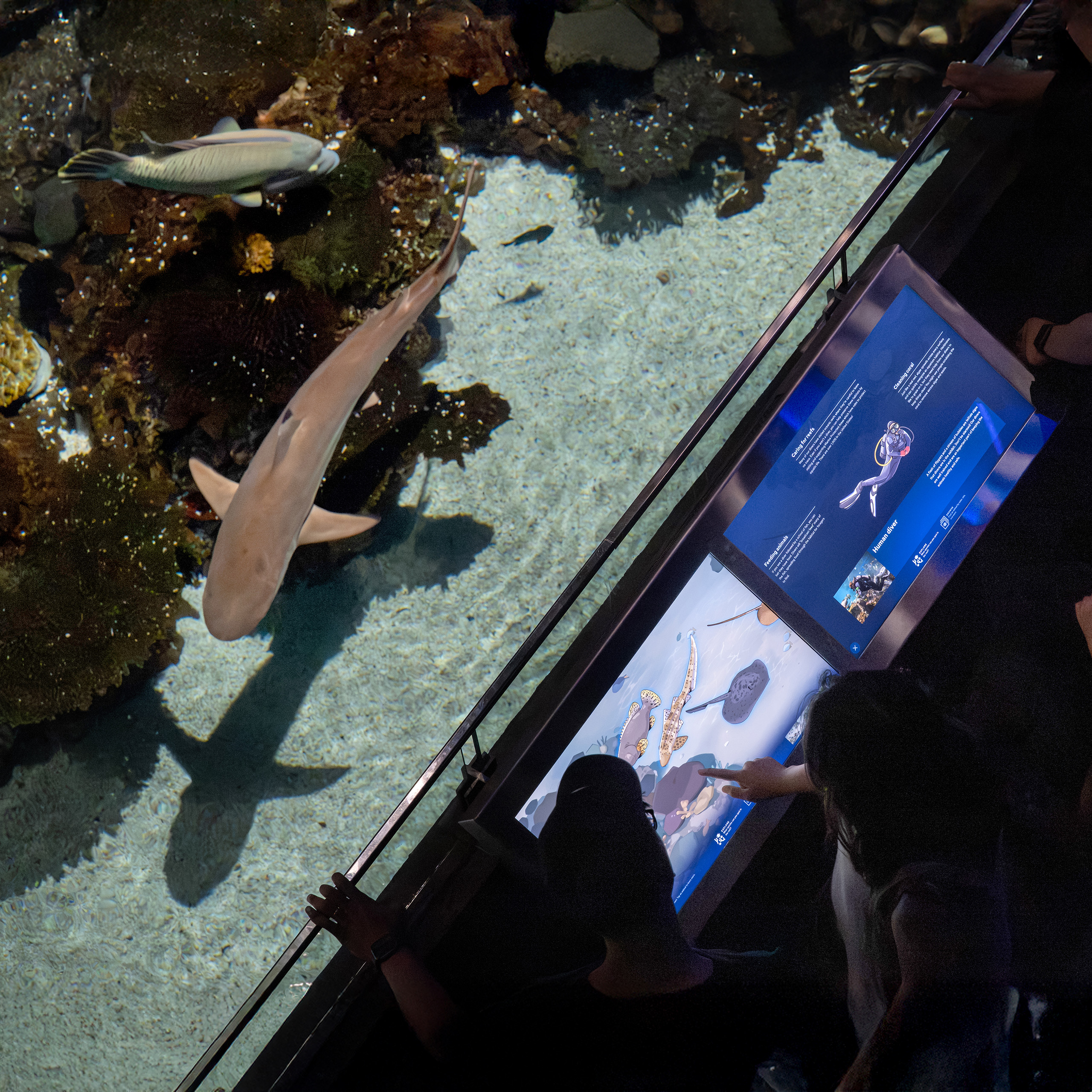Working together with the Aquarium’s marine life experts and exhibit designers, we designed and installed digital interactives in two of their high traffic viewing areas: the Topside Viewing Gallery and the Underwater Viewing Gallery. These large touchscreens invite visitors to get to know the animals gliding, dashing, and lounging right in front of them, while also highlighting how the species fit into broader stories of conservation.