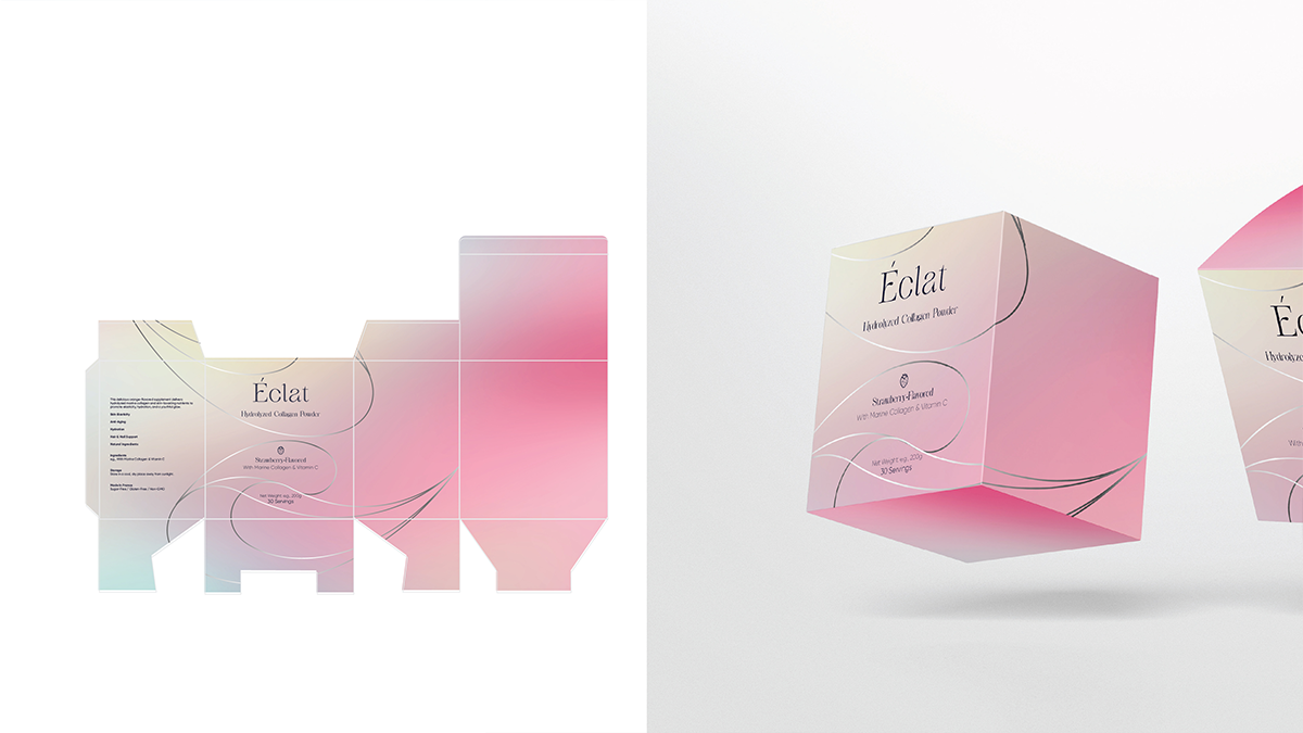 The name “Éclat,” meaning “radiance” in French, captures the essence of the brand, inner and outer beauty revealed. The visual identity draws from the structural elegance of collagen fibers and the fluidity of hydration, expressed as wave-like motifs symbolizing renewal. A sophisticated palette of ivory, warm peach, and champagne gold reflects purity, vitality, and luxury. Minimalist typography and precise negative space echo French design discipline, ensuring cohesion across both product lines.