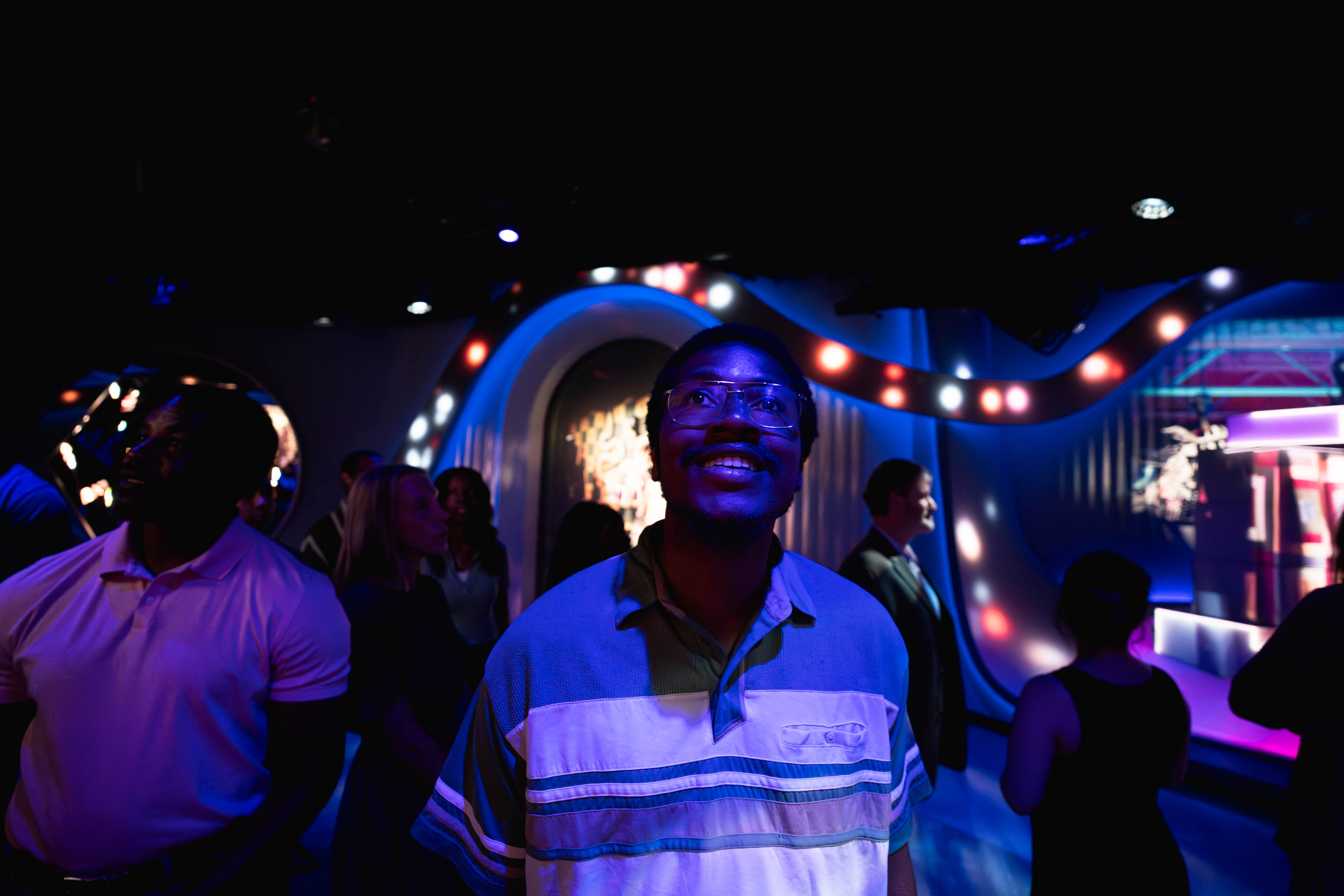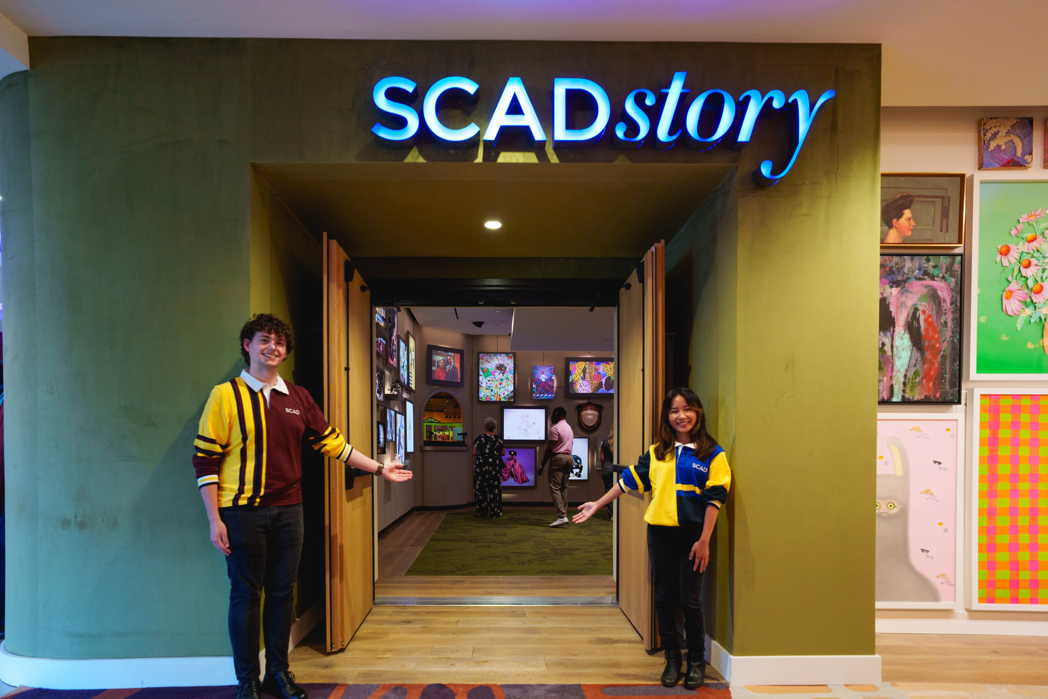 Guests step into a gallery alive with the talent of SCAD students, showcasing work from more than two dozen degree programs. Then, the walls awaken—projection-mapped imagery ripples across the space, lights dance, and an animated Paula Wallace, SCAD co-founder and president, appears. With warmth and wit, she invites visitors on an intimate journey—from her first days as a young teacher with a daring dream to the bold leap that created a university where creatives have every resource to flourish.