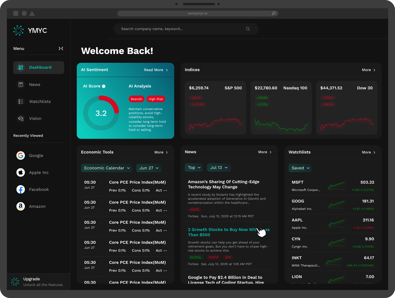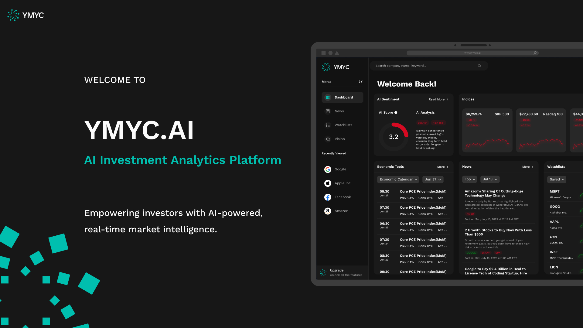 YMYC.AI is an AI-powered financial intelligence SaaS platform designed to transform complex market data into clear, actionable insights. Aimed at empowering both professional and retail investors, the platform delivers real-time market monitoring, macroeconomic signal analysis, industry trend tracking, and personalized AI agent tools — all without facilitating trading transactions.