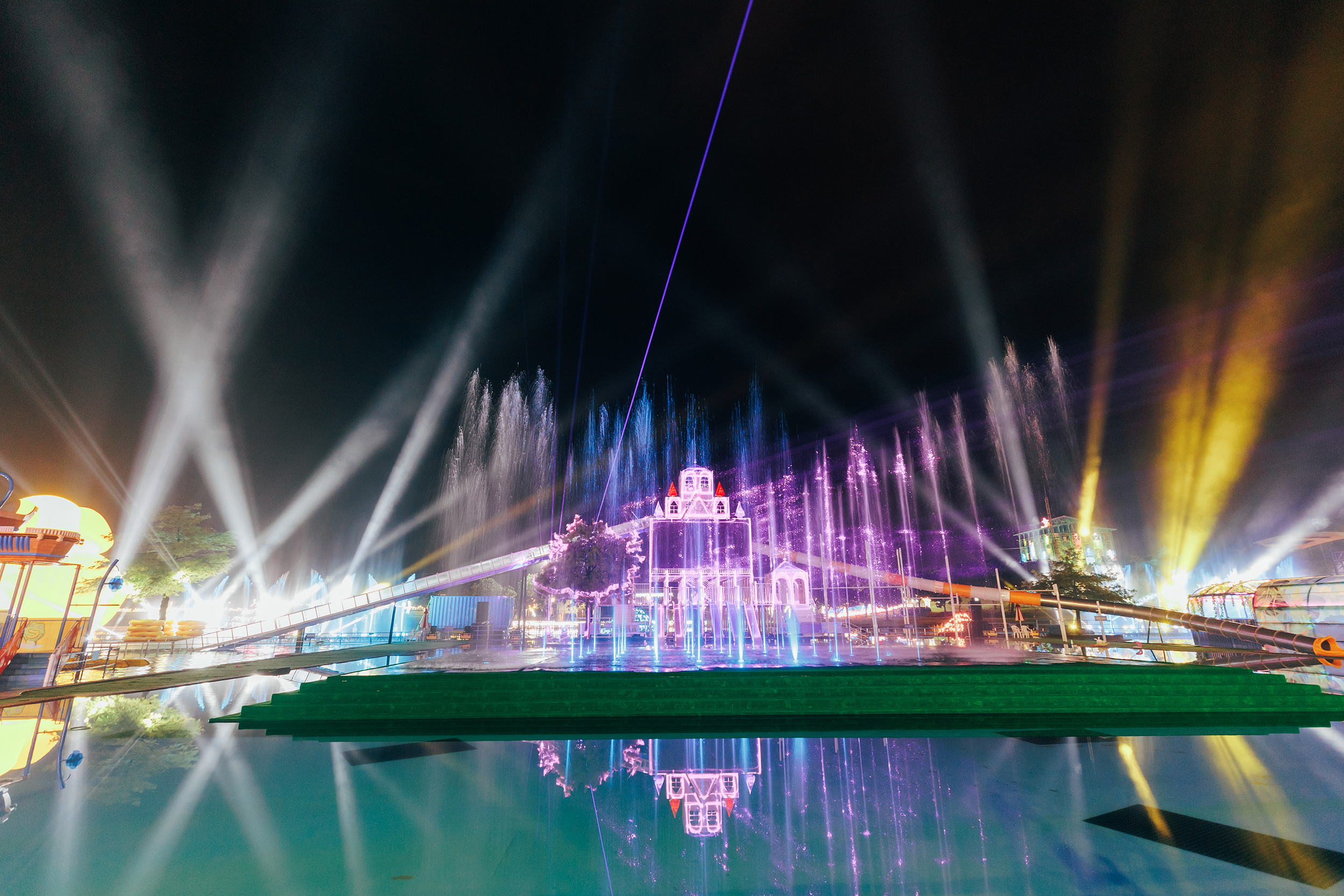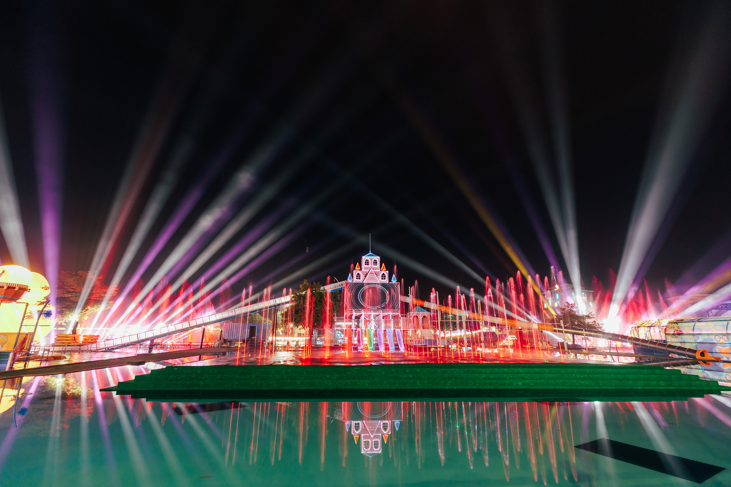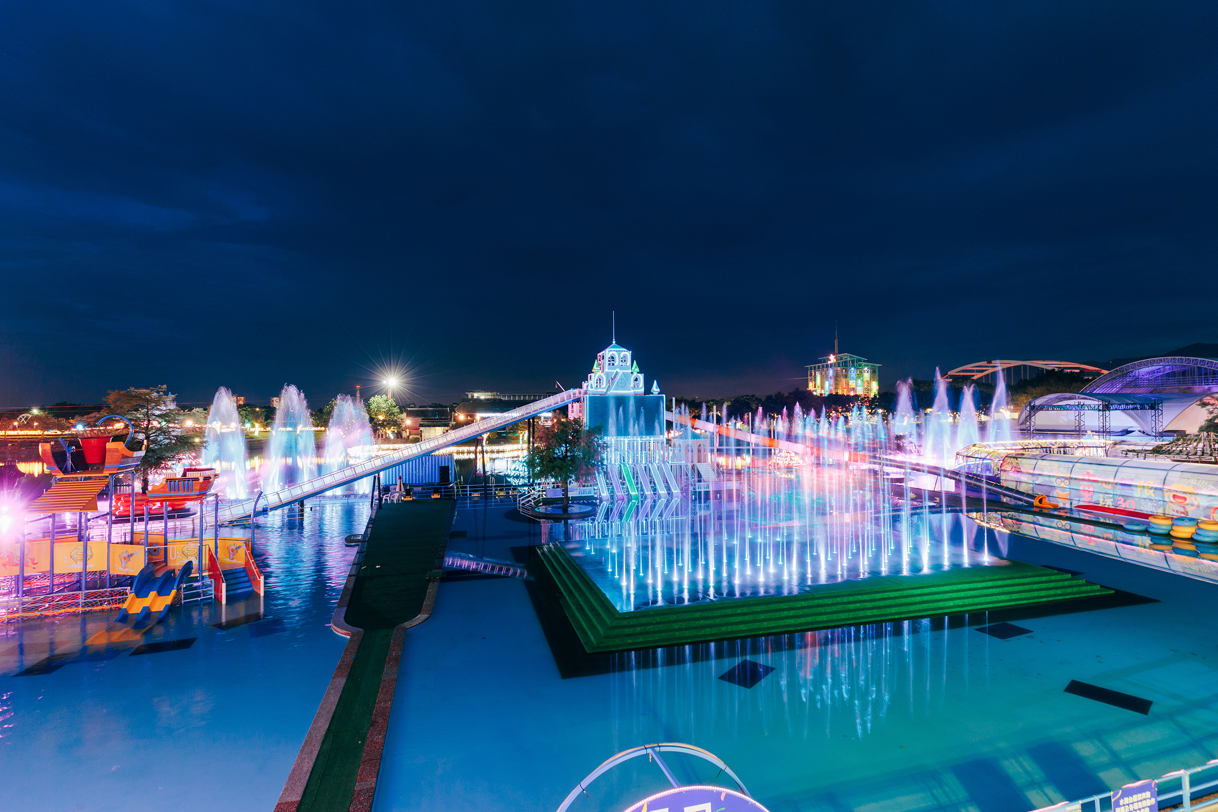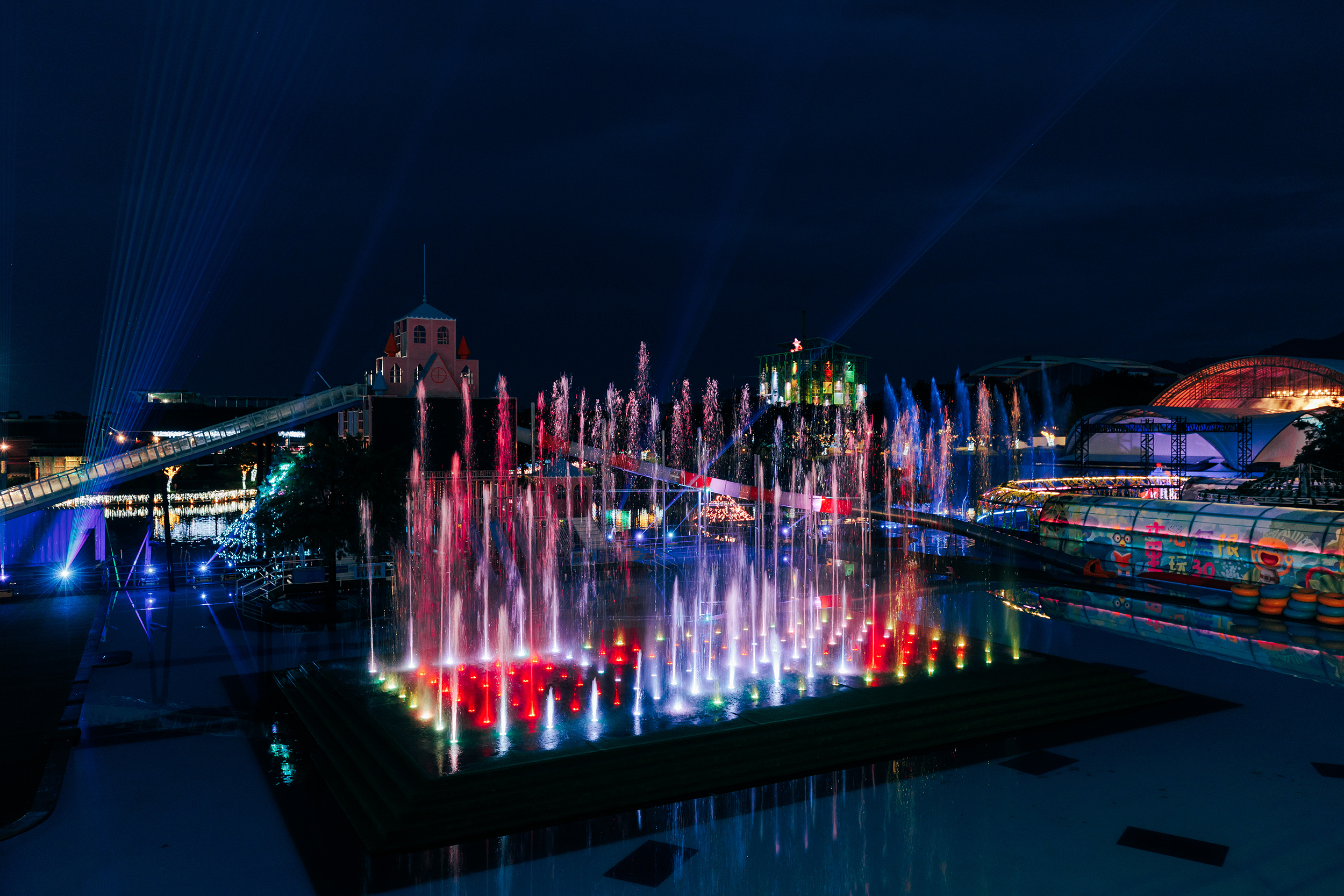 The design is anchored by four major highlights that set the stage’s immersive atmosphere. First, the fountain stage has been extended by 80 meters, forming a monumental water curtain at night that unfolds as the grand backdrop to the castle. Second, the festival incorporates Yilan’s famous natural marvel of “Water and Fire from the Same Source,” recreating the awe-inspiring coexistence of water and fire through technology, seamlessly blending natural legend with live ambience. Third, Taiwan’s first rotating floral-basket nozzles were introduced; as water jets spin, they bloom like petals in midair, crafting poetic, flowing imagery. Finally, a symphony of multi-type lighting and laser technology frames the castle in luminous brilliance, synchronizing with music to present dynamic matrix transformations. Together, water, light, and fire intertwine to compose a magnificent nocturnal performance. This year’s festival transcends the notion of a mere amusement park; it has evolved into a theatrical spectacle of the senses, inviting families and visitors to witness the advancement of Taiwan’s lighting and fountain show design.
