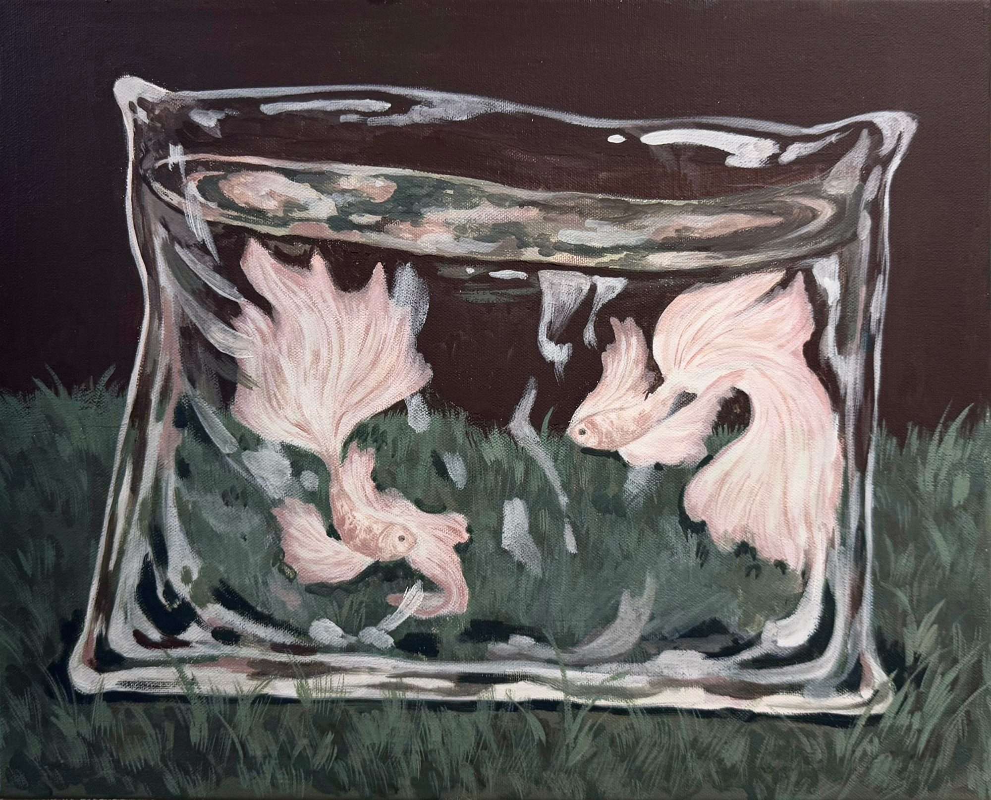 In this series, I worked with gouache on canvas in a 40 x 50 cm format, depicting three pillows in distinct forms and styles. The first is a pillow pressed beneath a heavy stone, symbolizing the overwhelming pressures of contemporary society, as immovable as a boulder. The second is patterned in the style of traditional patchwork fabrics, representing the weight and restrictions imposed by family. The third takes on a surreal quality: a transparent pillow resembling a fish tank, containing confined goldfish, a metaphor for the invisible constraints and norms of society.