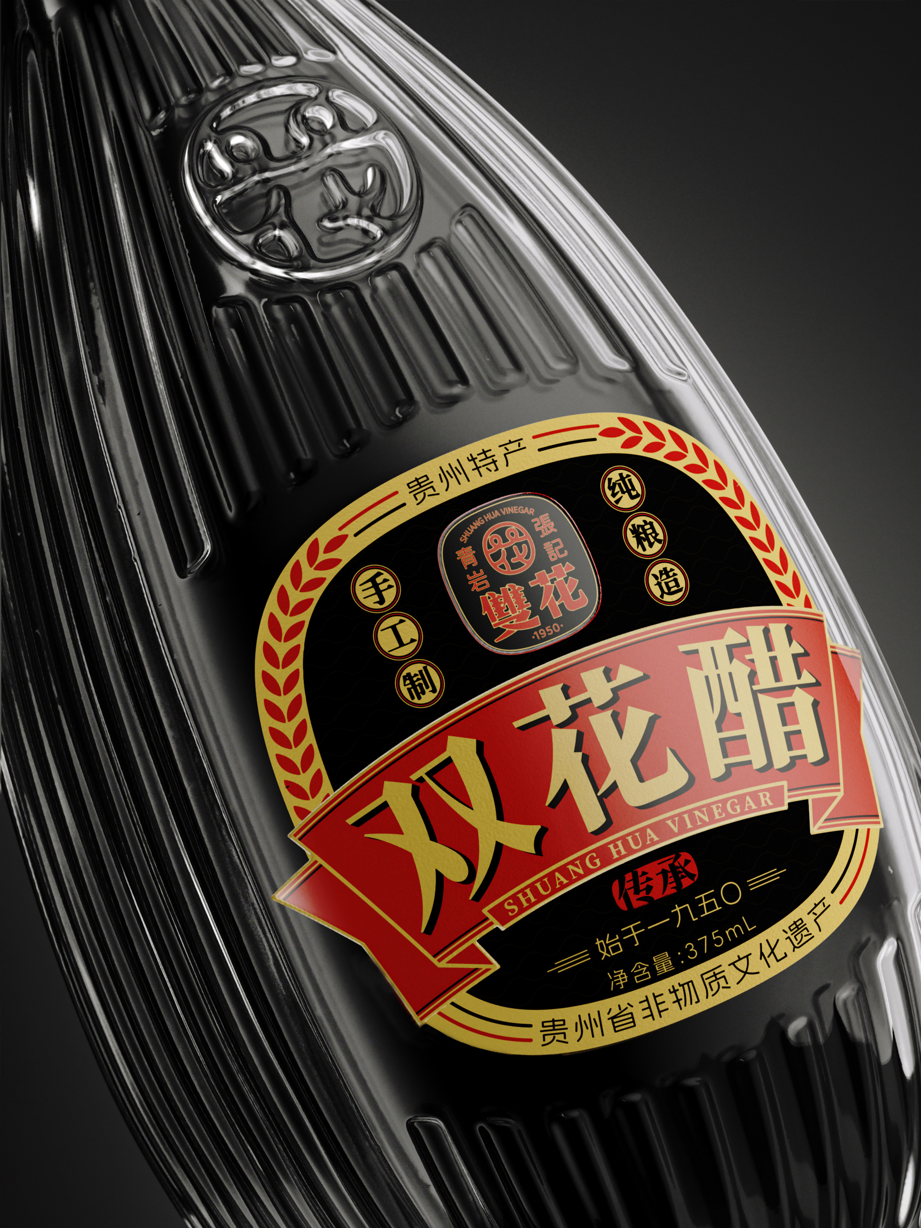 The visual strategy draws directly from the fermentation process, adopting the “vinegar bubble” as a key motif, abstracted into the core logo. The bottle features a round top and a square base—a form echoing the traditional Chinese cosmology of the round heaven and square earth—creating a distinctive brand icon. The vertical ribbing is designed to create a dynamic interplay of light and shadow, serving as a visual metaphor for the dense viscosity of the premium vinegar within.