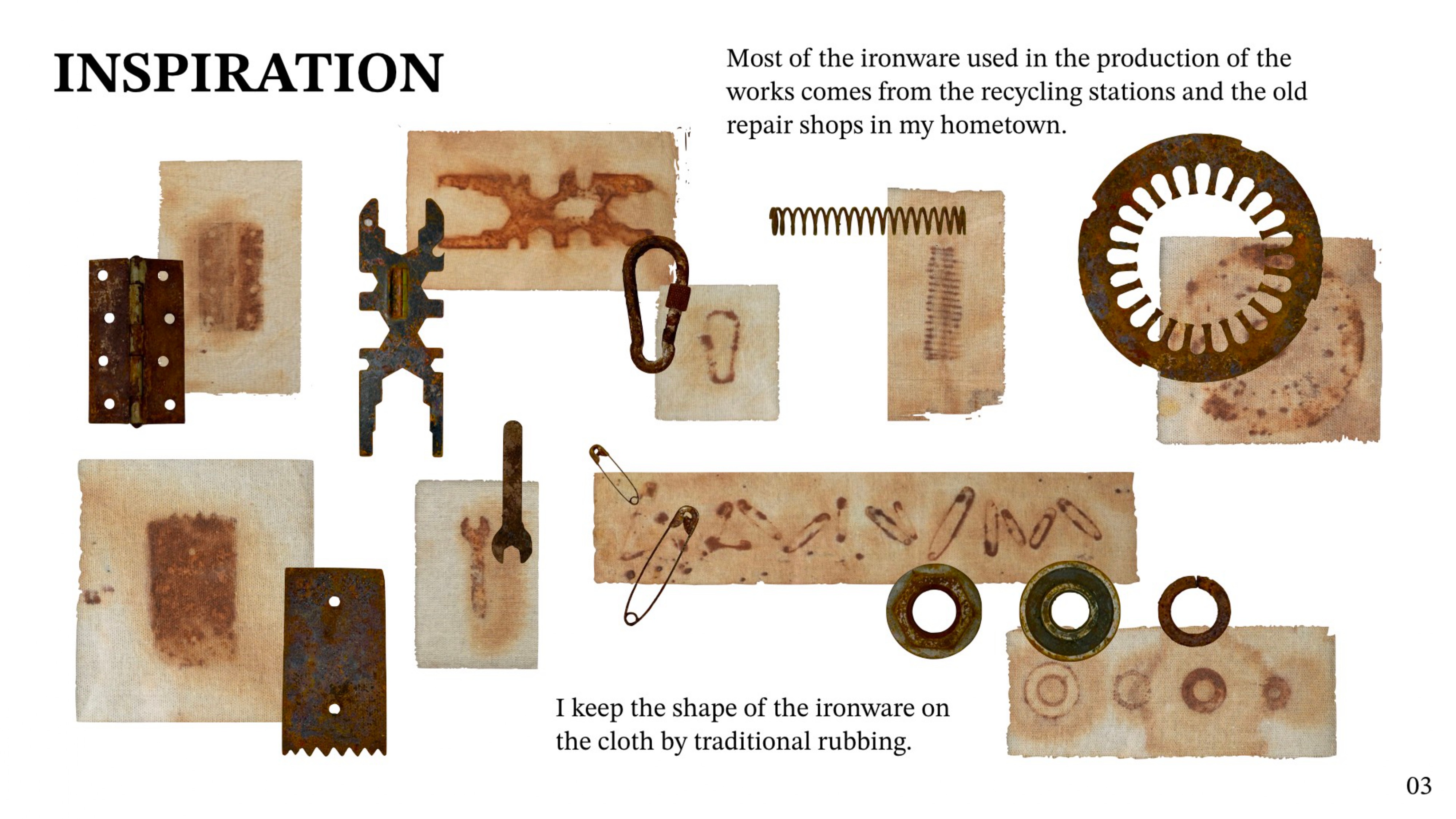 This piece employs a rubbing technique to transfer the shapes of antique ironware onto fabric, examining the evolving historical significance of the "Iron Age."