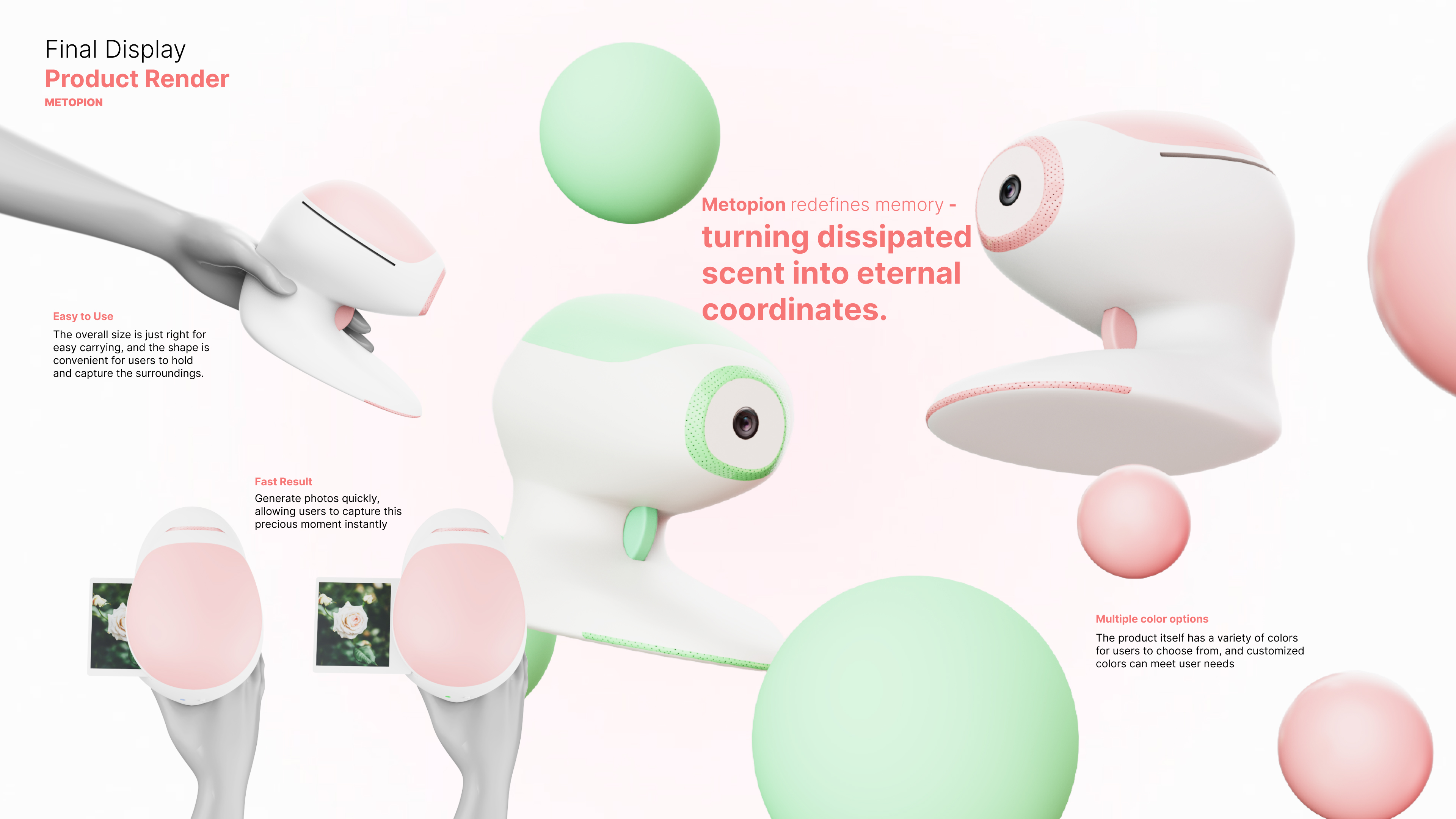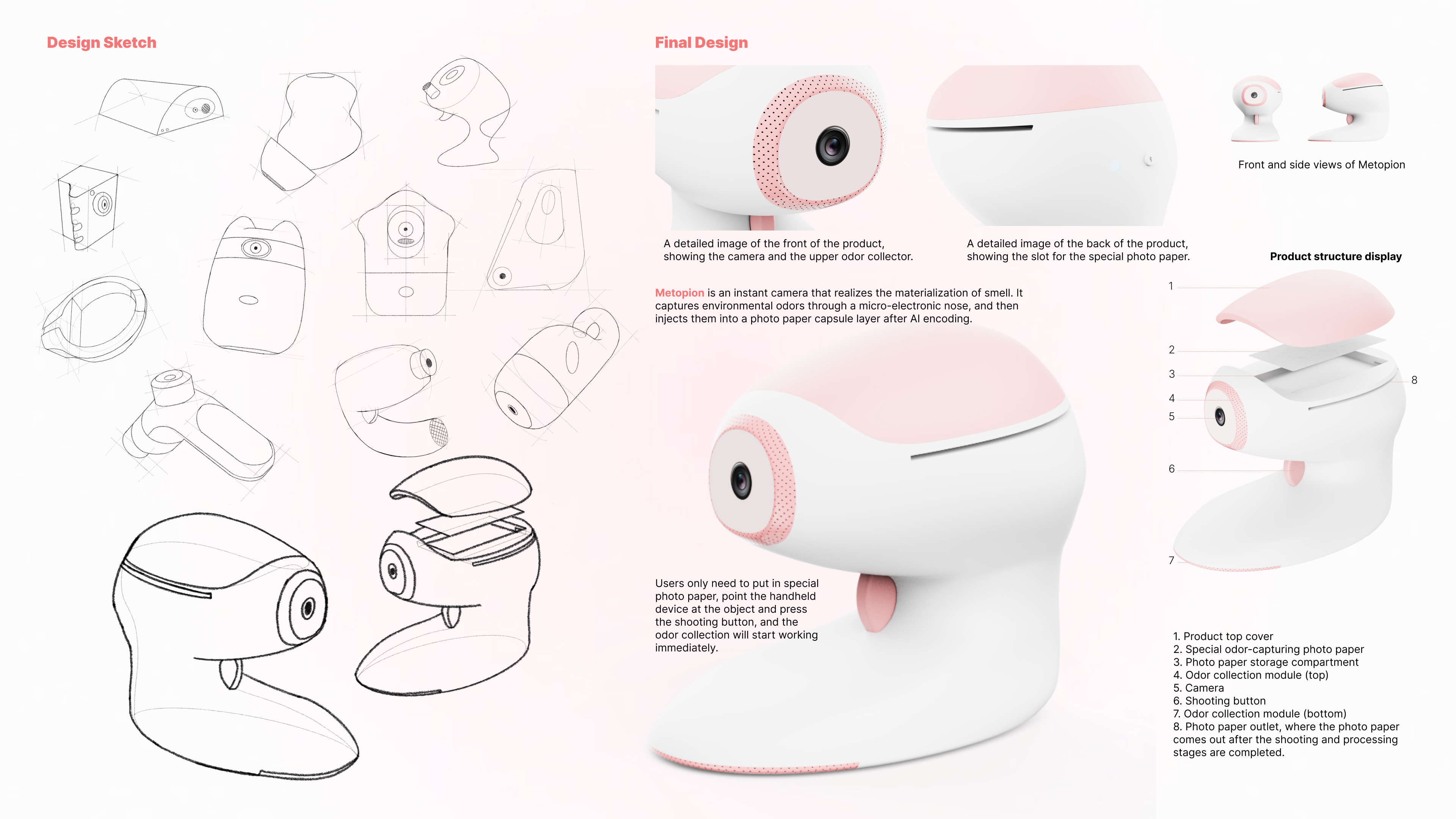 Metopion is an innovative industrial design project that redefines photography by capturing not just images but also the emotional atmosphere of a moment. Through integrated scent-release technology, it transforms fleeting aromas into lasting, tangible memories, enabling users to relive experiences with both sight and smell.