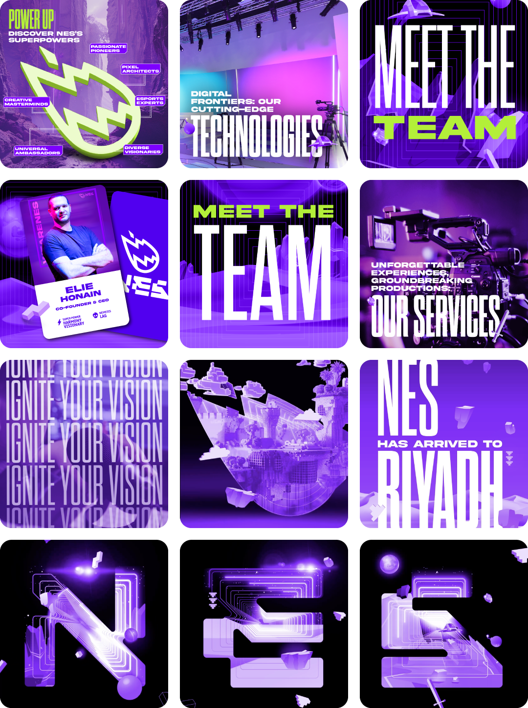 As a privately owned Gaming & eSports production studio entering the market, NES needed more than a launch — they needed a world. Our strategy was to immerse audiences in a 3D-inspired universe that showcased their talent, vision, and services with the same cinematic depth and symbolism gamers know and love, but elevated with subtle Saudi cultural motifs. The result was a universe that felt at once mythical, futuristic, and unmistakably homegrown.