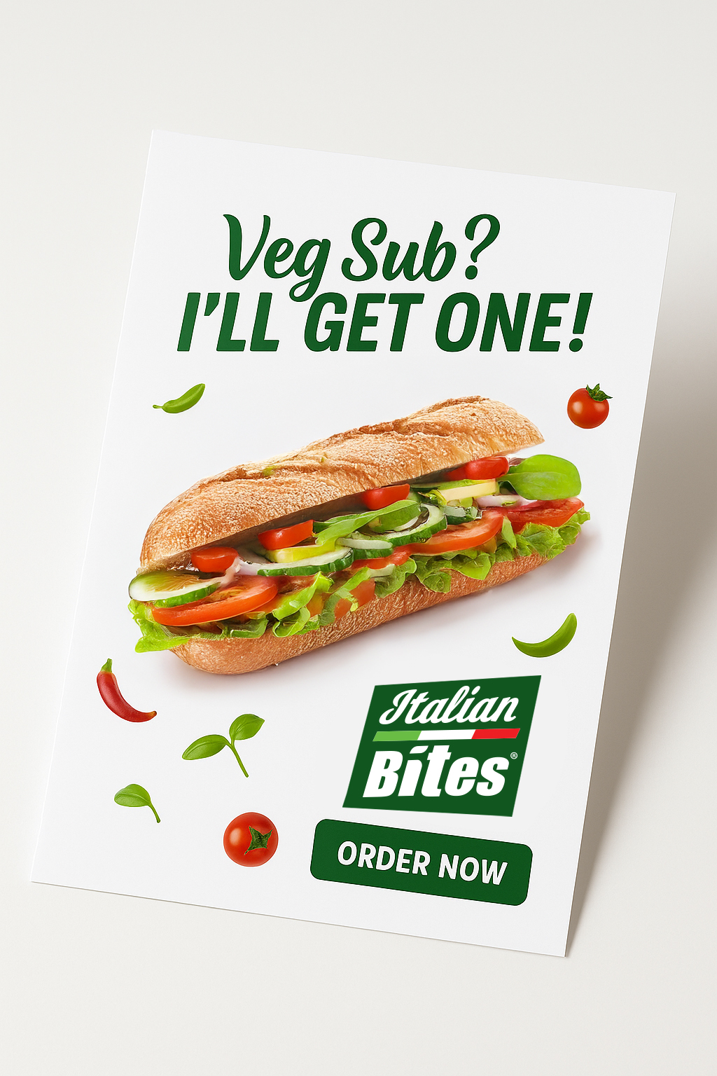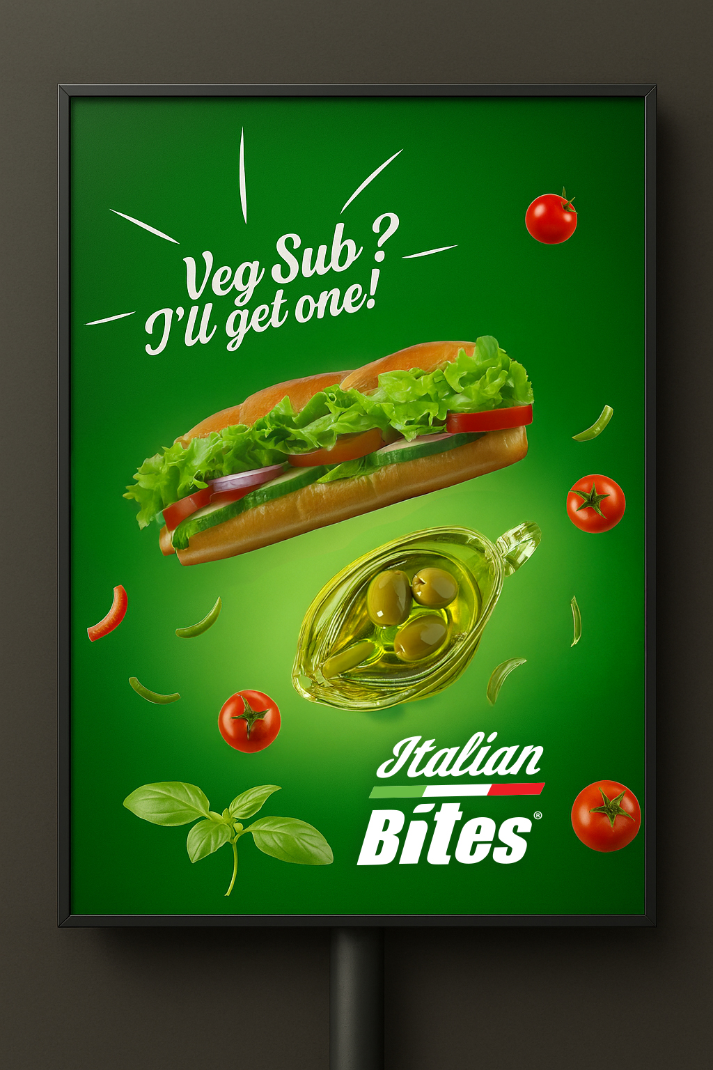 Italian Bites is a fresh take on comfort. The Veggie Subs identity celebrates crisp greens, ripe tomatoes, and bakery texture with a lively composition of floating ingredients that feels light and delicious. The curved green field and peel-away corner suggest freshness you can open right now. The heart seal says made with love. The wordmark stacks “Italian” and “Bites” for quick recognition and a bright, appetizing read at shelf and on screen.