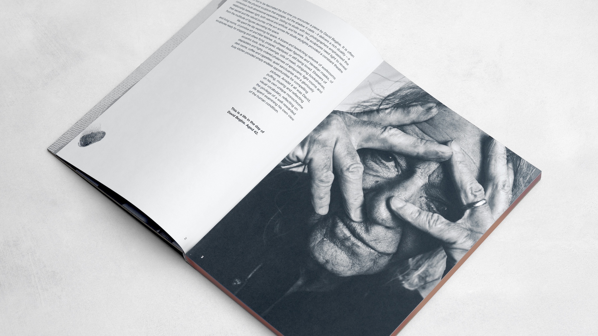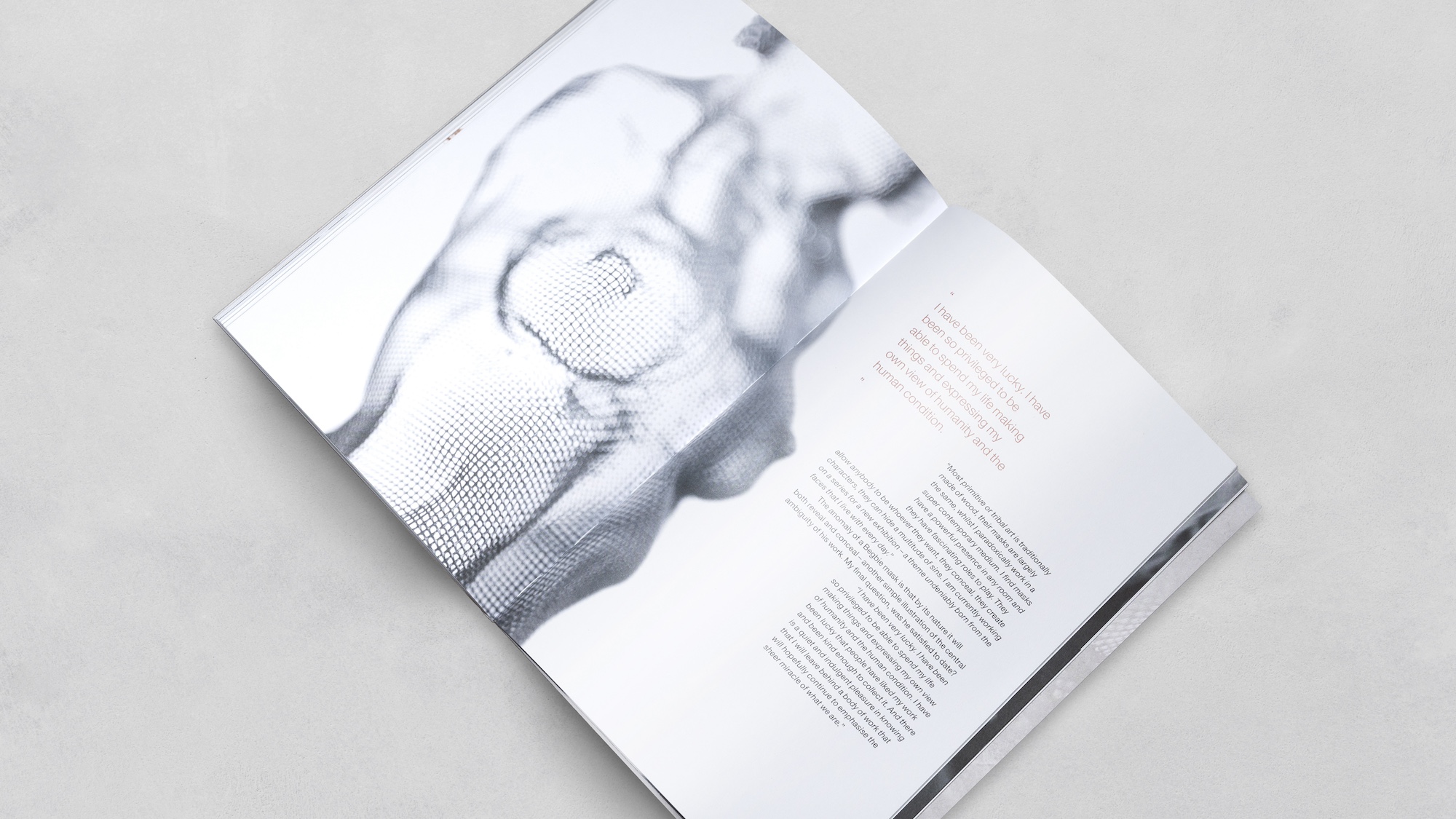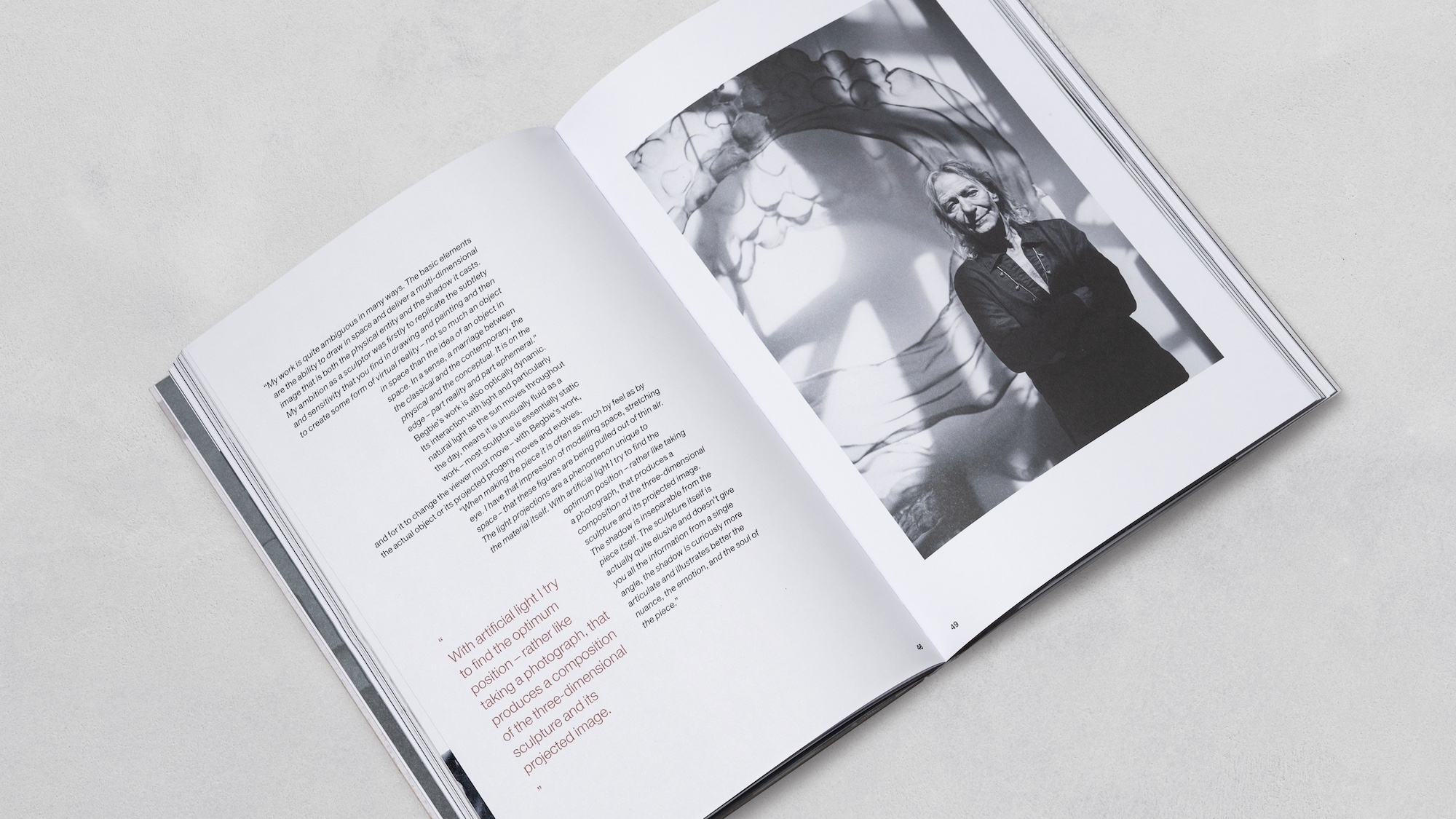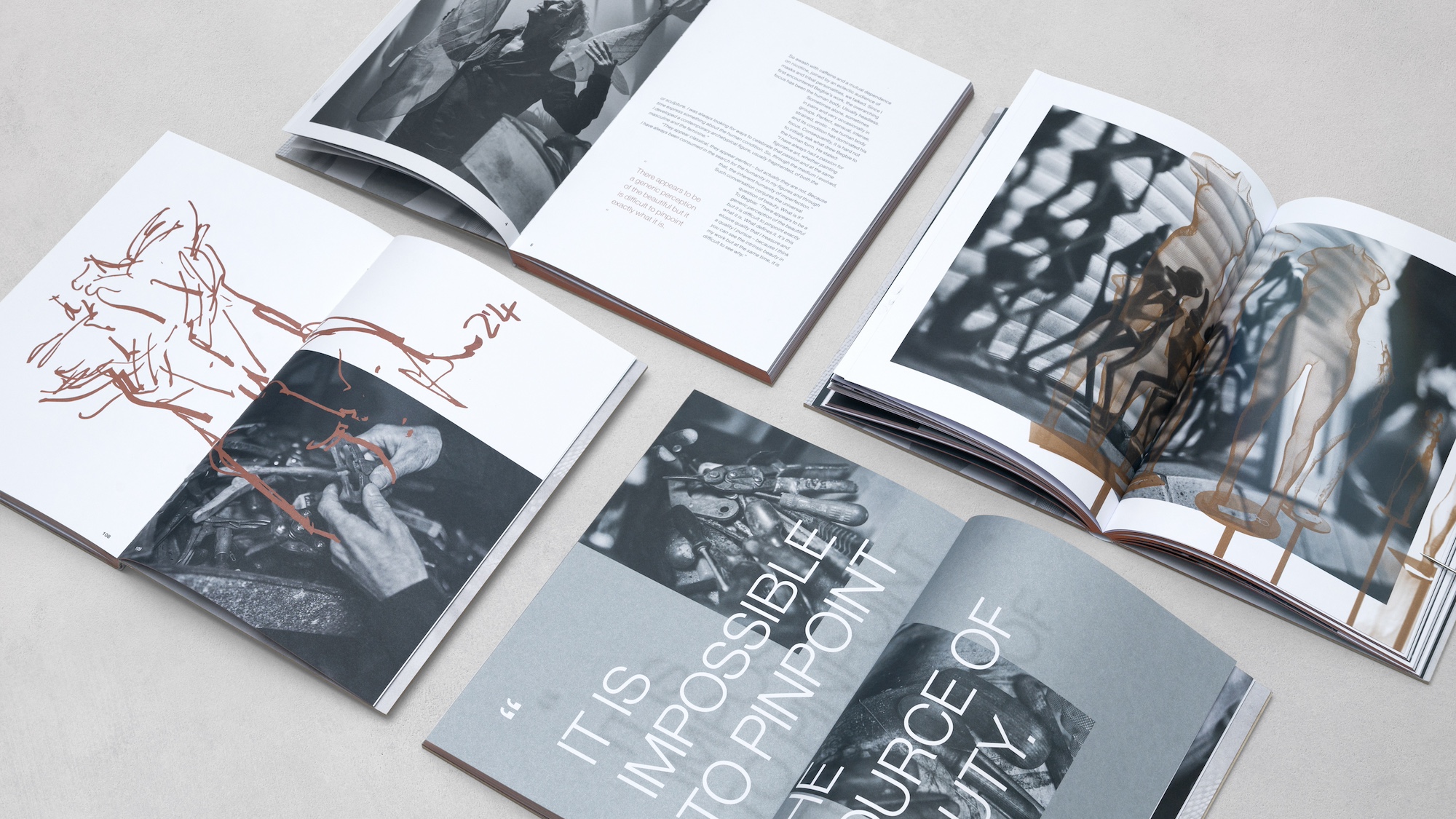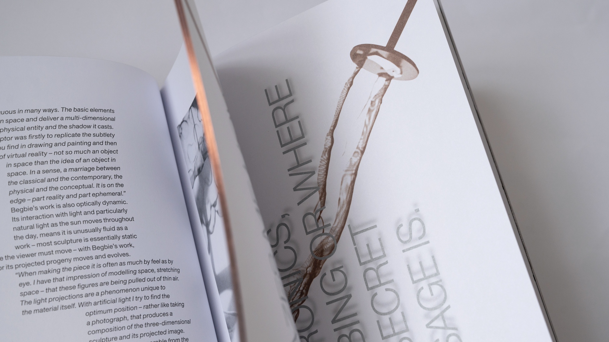 Specialising in figurative work from steel mesh, the challenge was to celebrate Begbie’s juxtaposition of industrial materials and the inherently fragile nature of the human form. Embracing the integral importance of light and shadow through commissioned black and white photography, layered assets, stylised typography, and copper accents that reflect not only the dimensional nature of his work, but also the exceptional attention to detail in every piece. All encased within a bespoke dust jacket that mimics the patterns and tactility of Begbie’s material of choice.