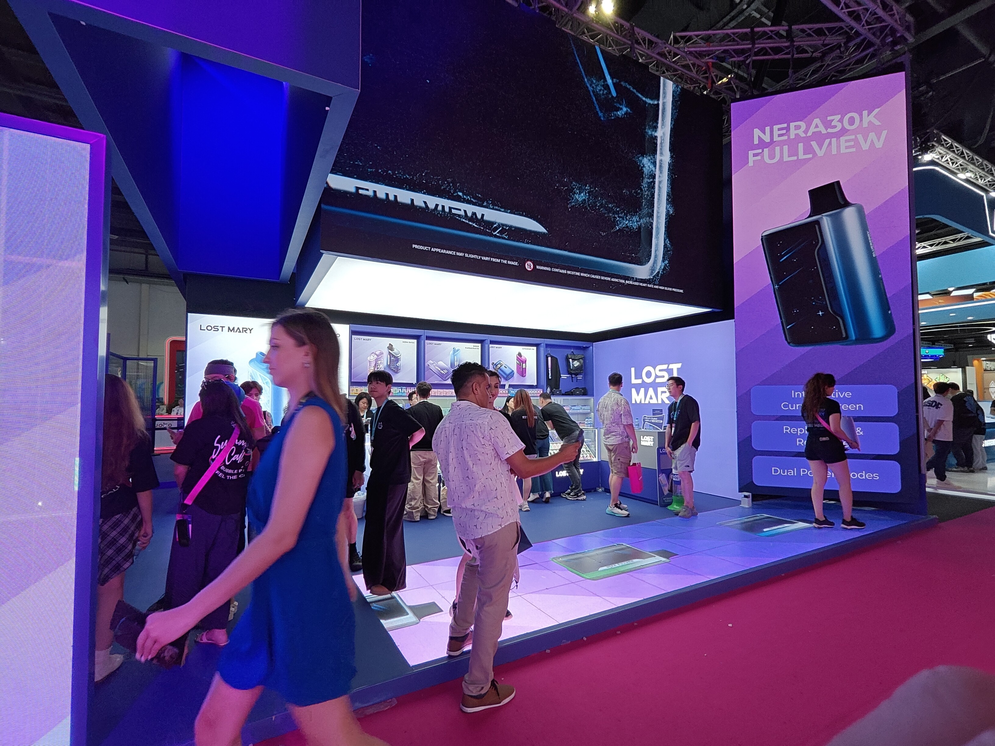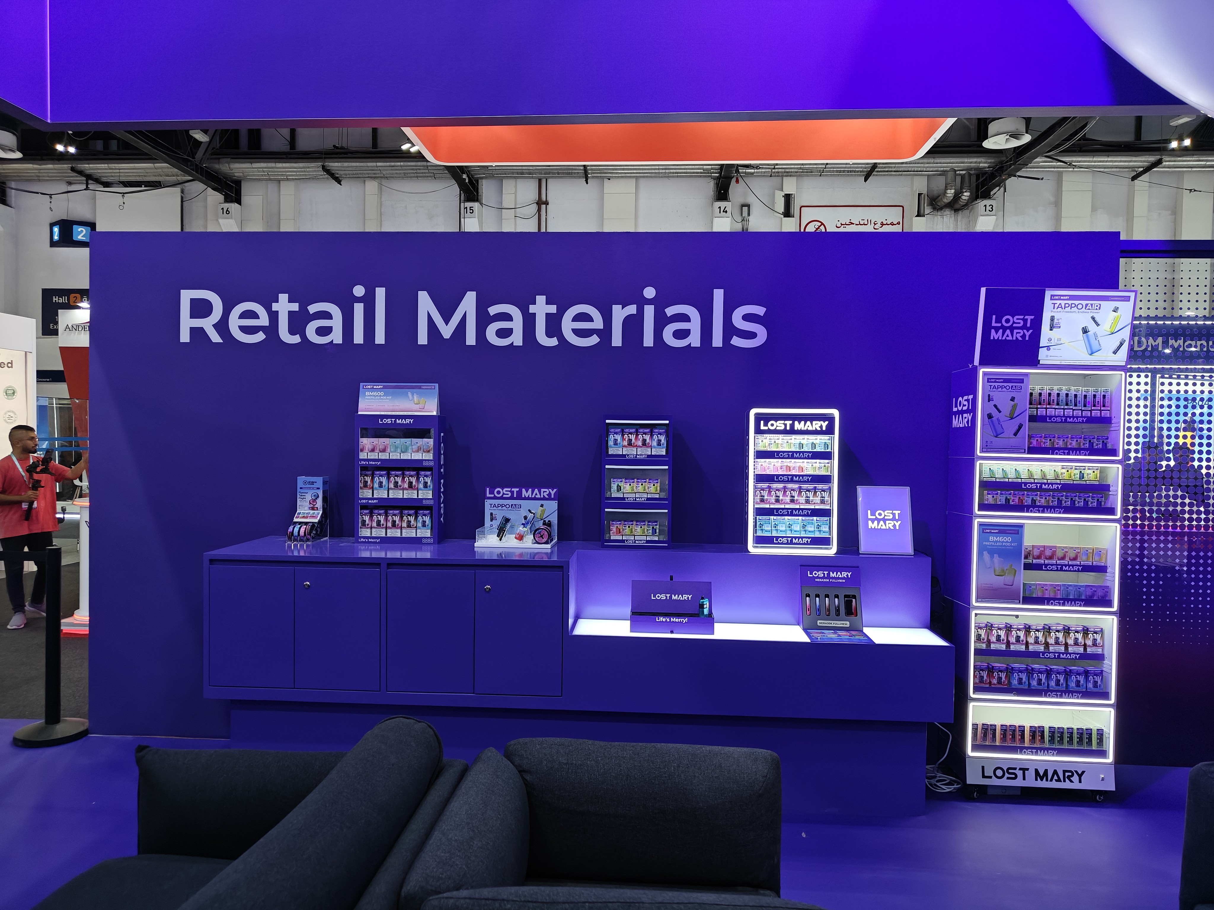 In terms of technological innovation, the transparent screens were utilized to dynamically display product content, providing a comprehensive presentation of key advantages; with an optimized structure, they supported rapid setup within just four hours, highlighting the brands’ technological prowess and innovative capabilities. The innovative infrared radar interactive floor — making its debut at the World Vape Show Dubai 2025 — offered guests a cutting-edge interactive experience, and maintained high sensitivity and precision even after three days of intensive use. To enhance the reception and negotiation experience, a private independent negotiation area was available, complemented by the novel sofa modules which broke away from the typical, unappealing plastic furnishings often seen at exhibitions, transforming the brands' identity into an expressive spatial experience.
