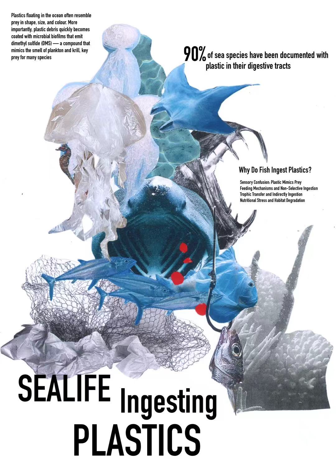 As plastics break down into microscopic particles, they are ingested by fish, shellfish, and other marine animals - and eventually consumed by humans through seafood. This project explores the colsed-loop cycle of plastic: from ocean waste, to the food chain, and ultimately into our bodies, where its invisible presense raises urgent public health concer