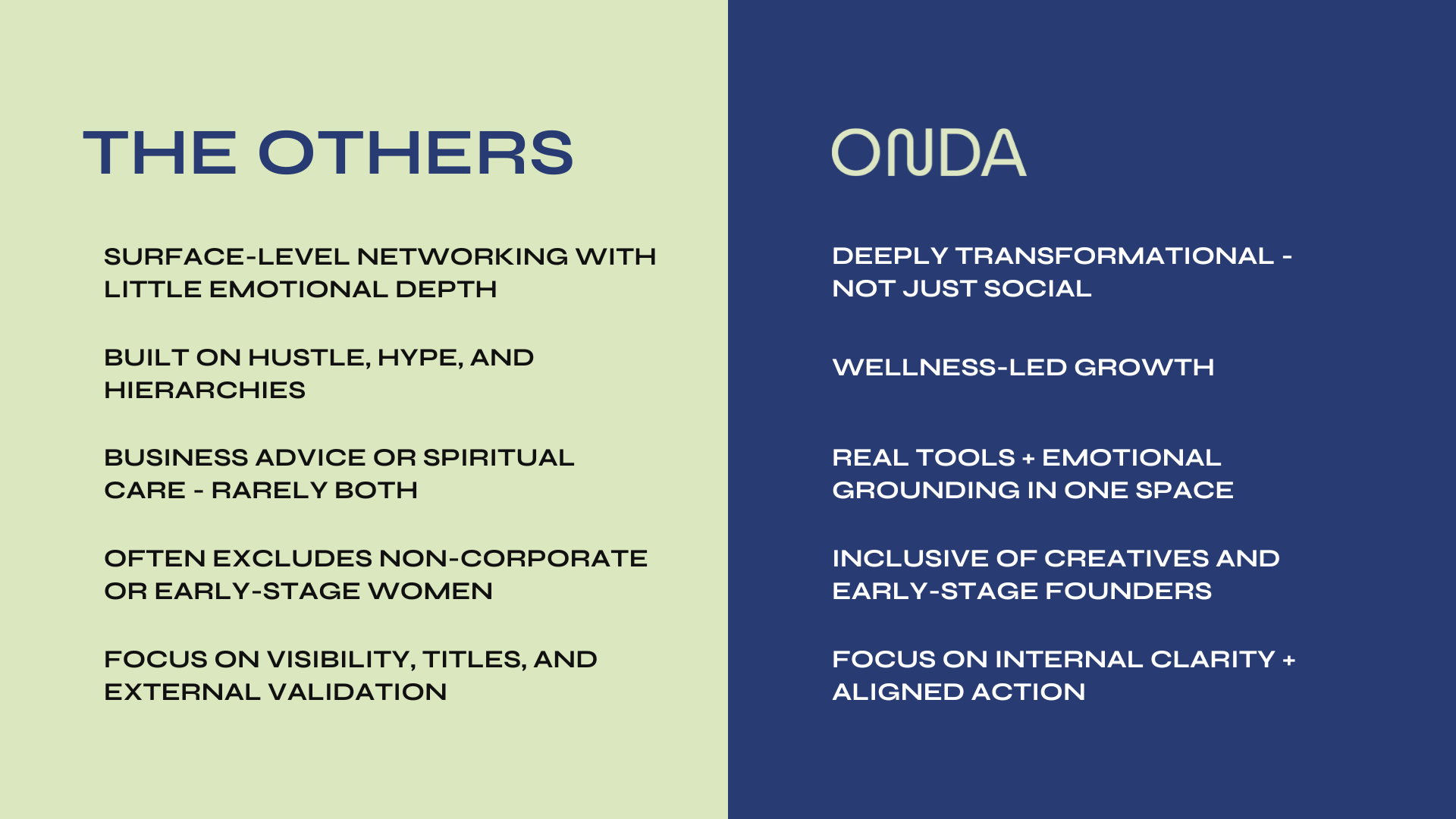ONDA was founded with a powerful mission: to design transformative experiences for visionary women by guiding them through life’s pivotal moments with strategy and inner work. ONDA exists because women are done with surface-level fixes, they need spaces for meaningful transformation, grounded in actionable tools that work.