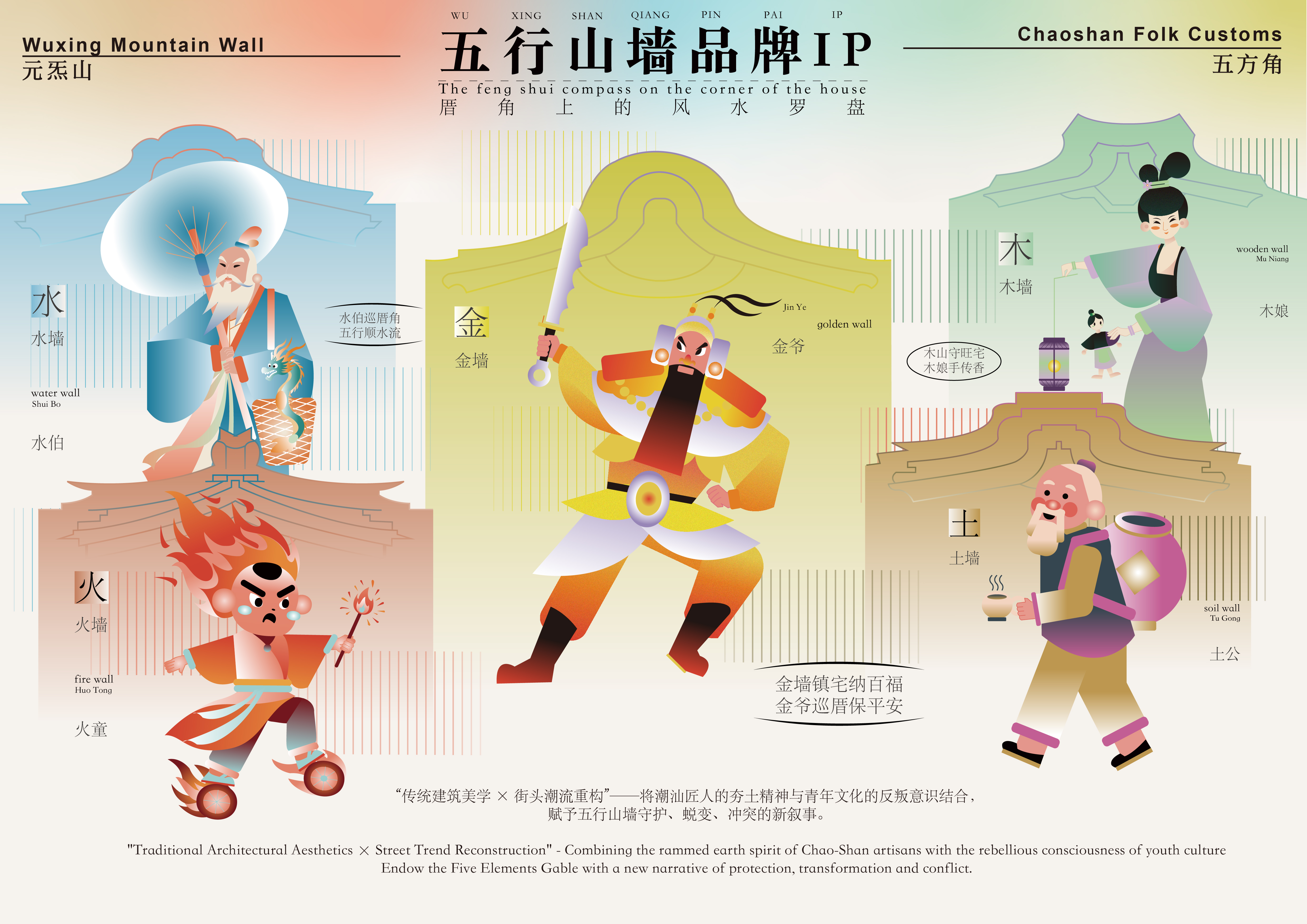 This project reimagines Chaoshan’s traditional architecture through a modern cultural lens. The title Wuxing Gable Guardians draws from “Wuxing” (五行) — the ancient Chinese theory of the Five Elements (Metal, Wood, Water, Fire, Earth) — and “Gable Walls,” distinctive architectural features found on Chaoshan rooftops. Traditionally, these walls symbolize balance, protection, and harmony. In this brand IP, they are brought to life as five vivid guardians, each embodying one element through a unique personality.