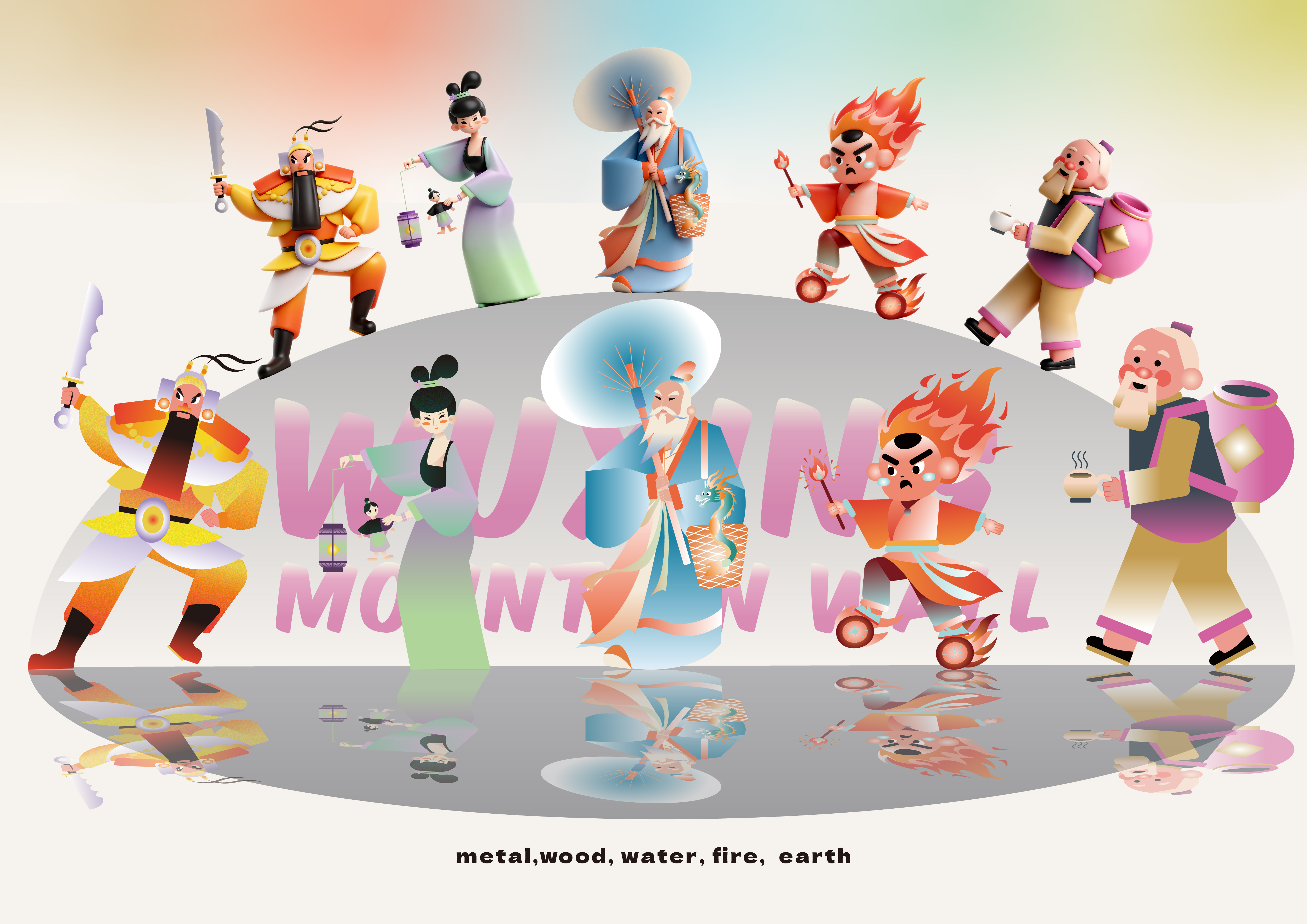 Jin Ye (Metal) is sharp and resolute; Mu Niang (Wood) is nurturing and graceful; Shui Bo (Water) flows with quiet wisdom; Huo Tong (Fire) burns with energy; Tu Gong (Earth) stands strong and grounding. Together, they form a vibrant mythology that connects ancient cosmology with contemporary youth culture.
