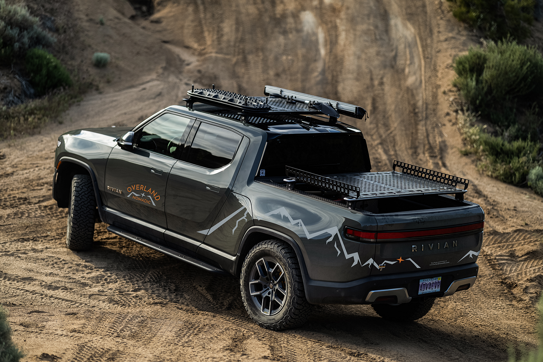 The Overland Nomadic logo shows a rugged mountain landscape with a compass needle at the center — simple, outdoorsy, and built to feel like it belongs on the trail.
