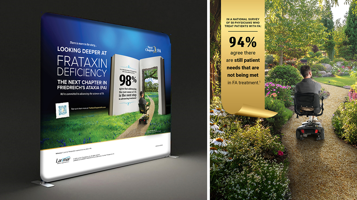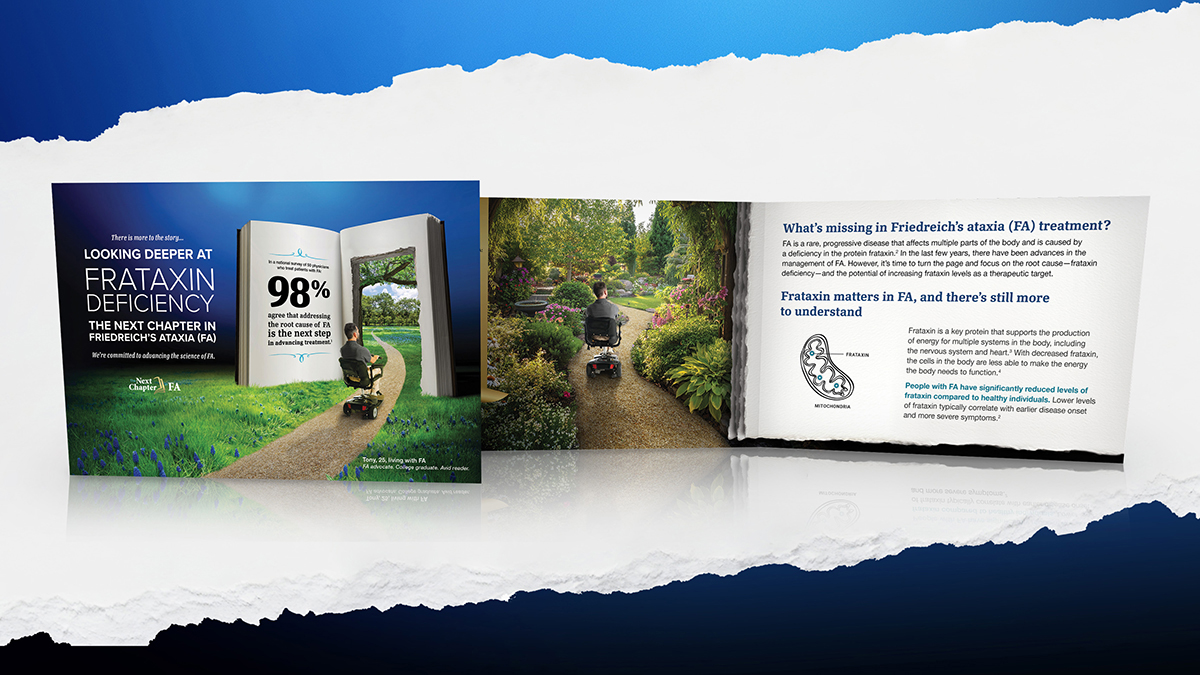 Larimar Therapeutics partnered with Elevate to create an unbranded disease awareness campaign that would inspire both clinicians and the FA community to “look deeper” into the science of frataxin deficiency. Anchored by the line “There is more to the story…”, the campaign invites audiences to turn the page on FA understanding.