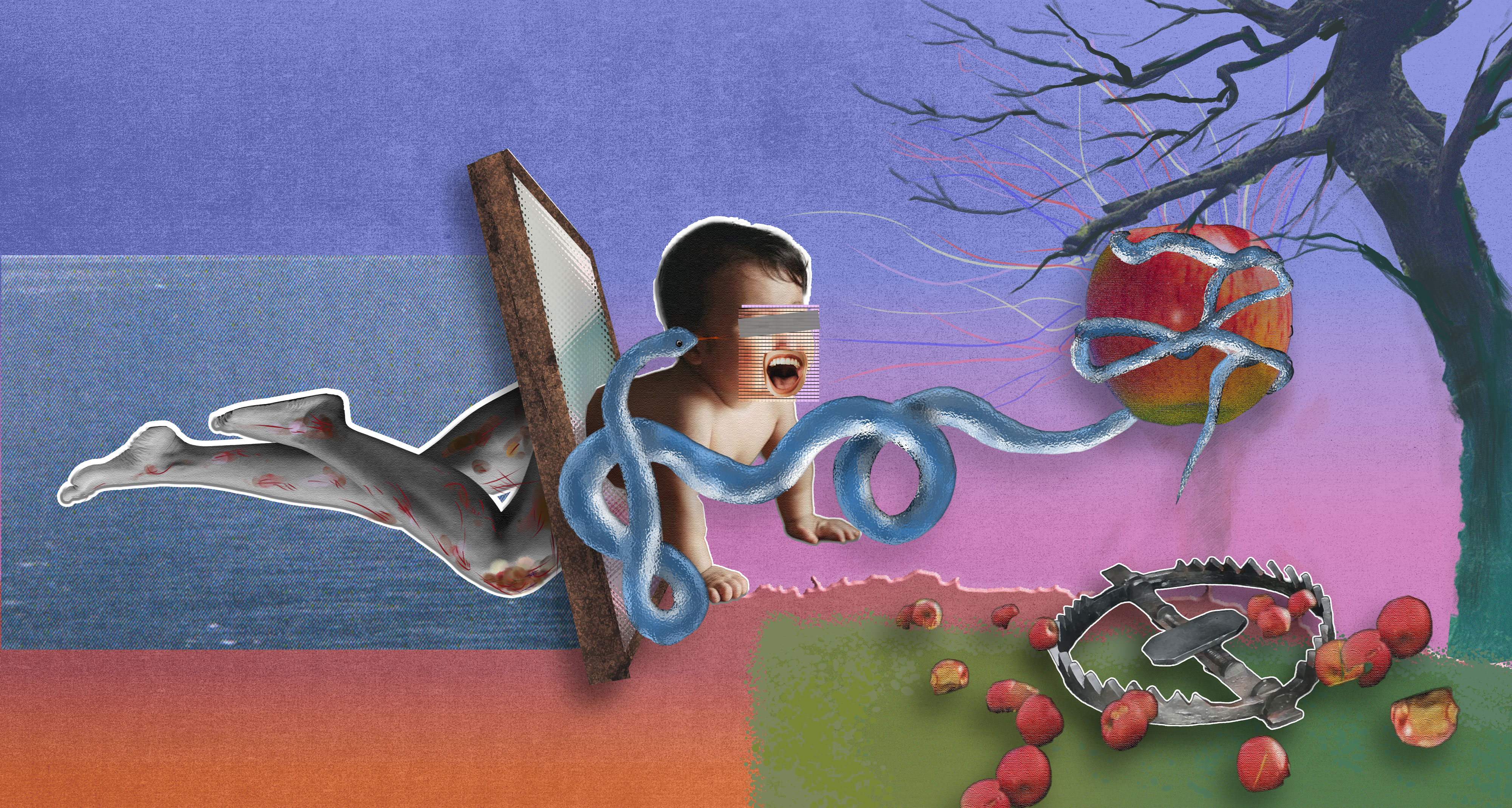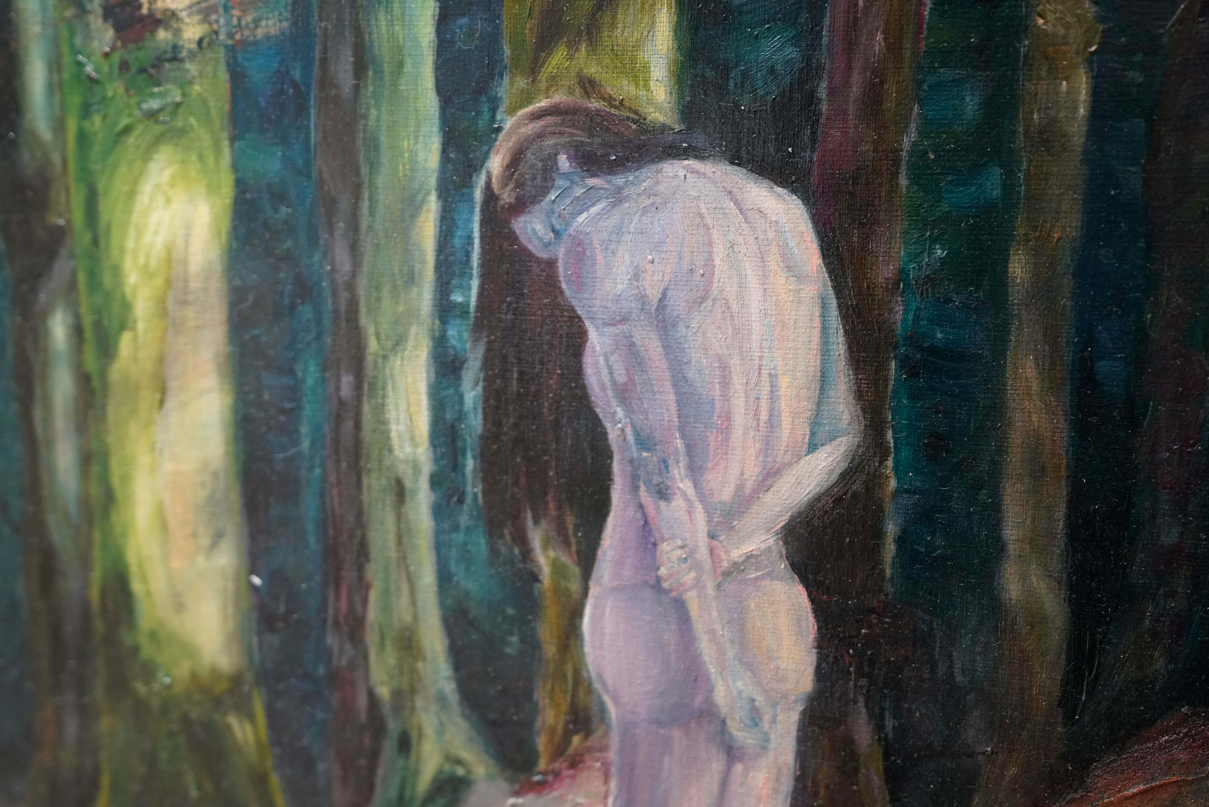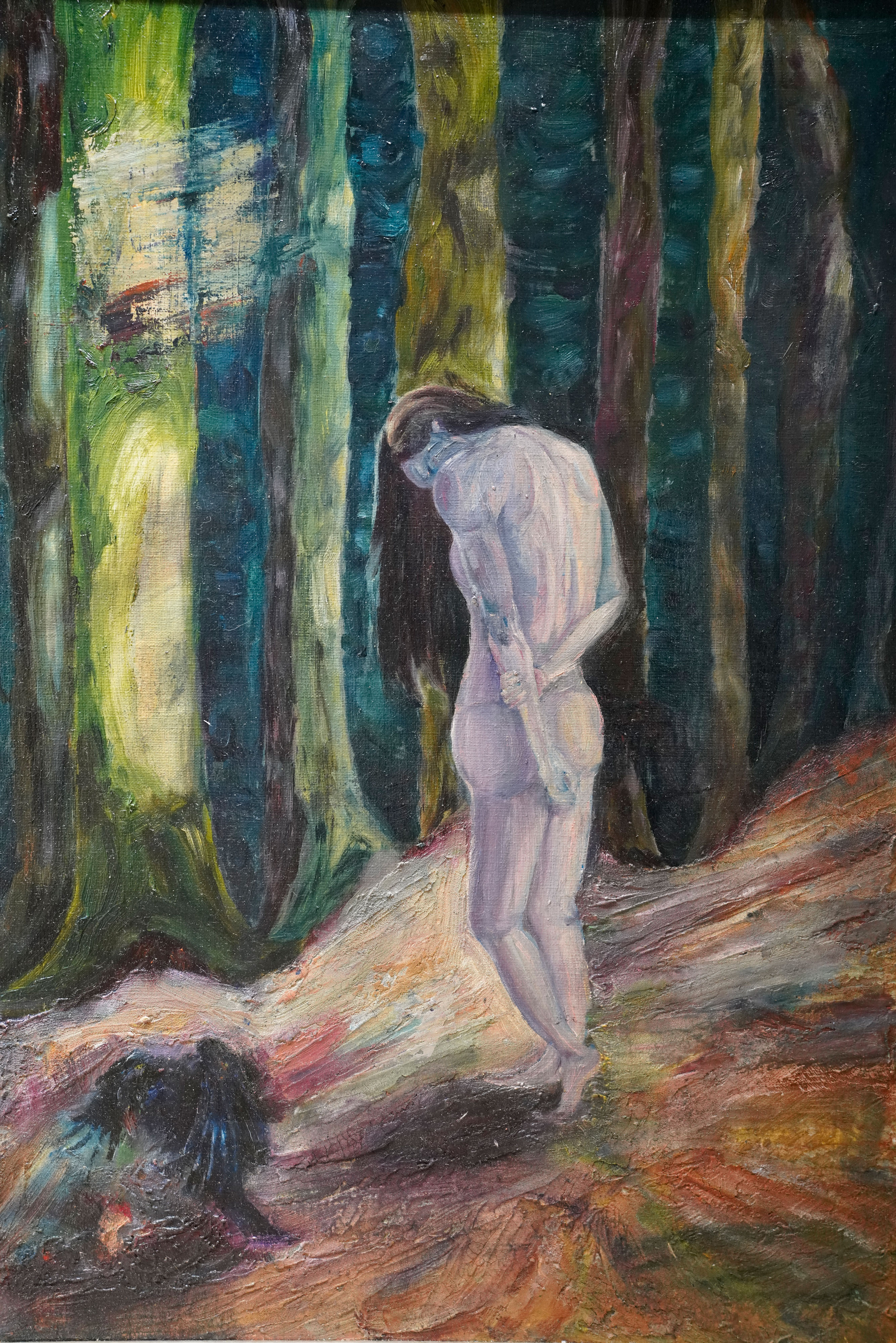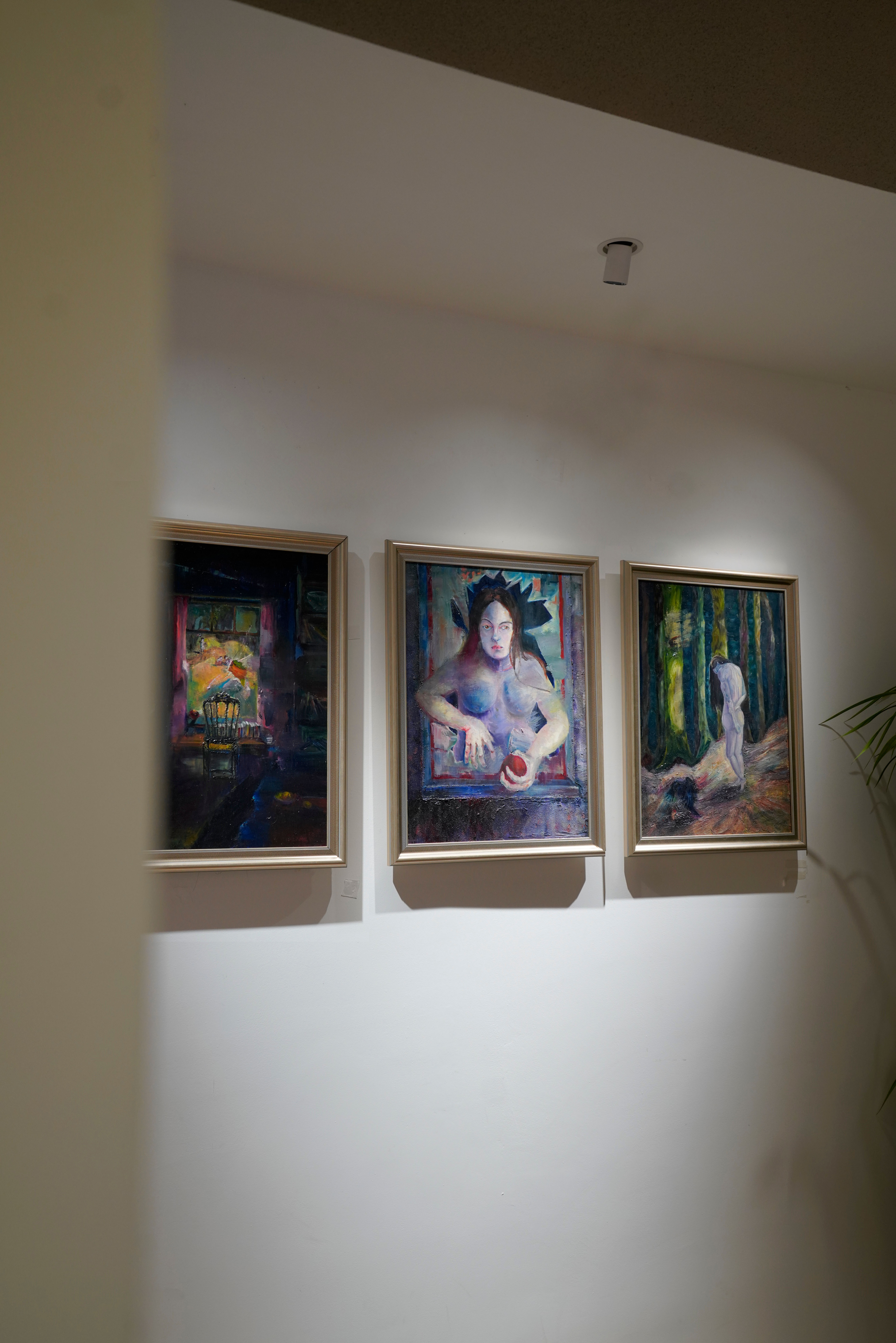 In the first painting, the contrast between the dim interior and the bright exterior conveys tension between safety and danger. The blurred interior elements symbolize the figures’ flickering, candle-like inner world. In the second painting, apples carry layered cultural meanings—blessing, temptation, or desire for life. Grasping an apple signifies the character’s pursuit of vitality, while the overlapping color blocks metaphorically indicate stepping out of the safe, enclosed inner sanctuary into a vibrant and complex new chapter of life. In the third painting, the forest seems to be watched by countless eyes, juxtaposing sacredness and lurking danger. Crows, representing wisdom in Norse mythology and harbingers of death in Western religious culture, alongside discarded apple cores and trees, create layers of ambiguous symbolic meaning. These elements shift continuously before the narrative concludes, illustrating that the outcome of this unfolding drama is determined by the character’s own choices.