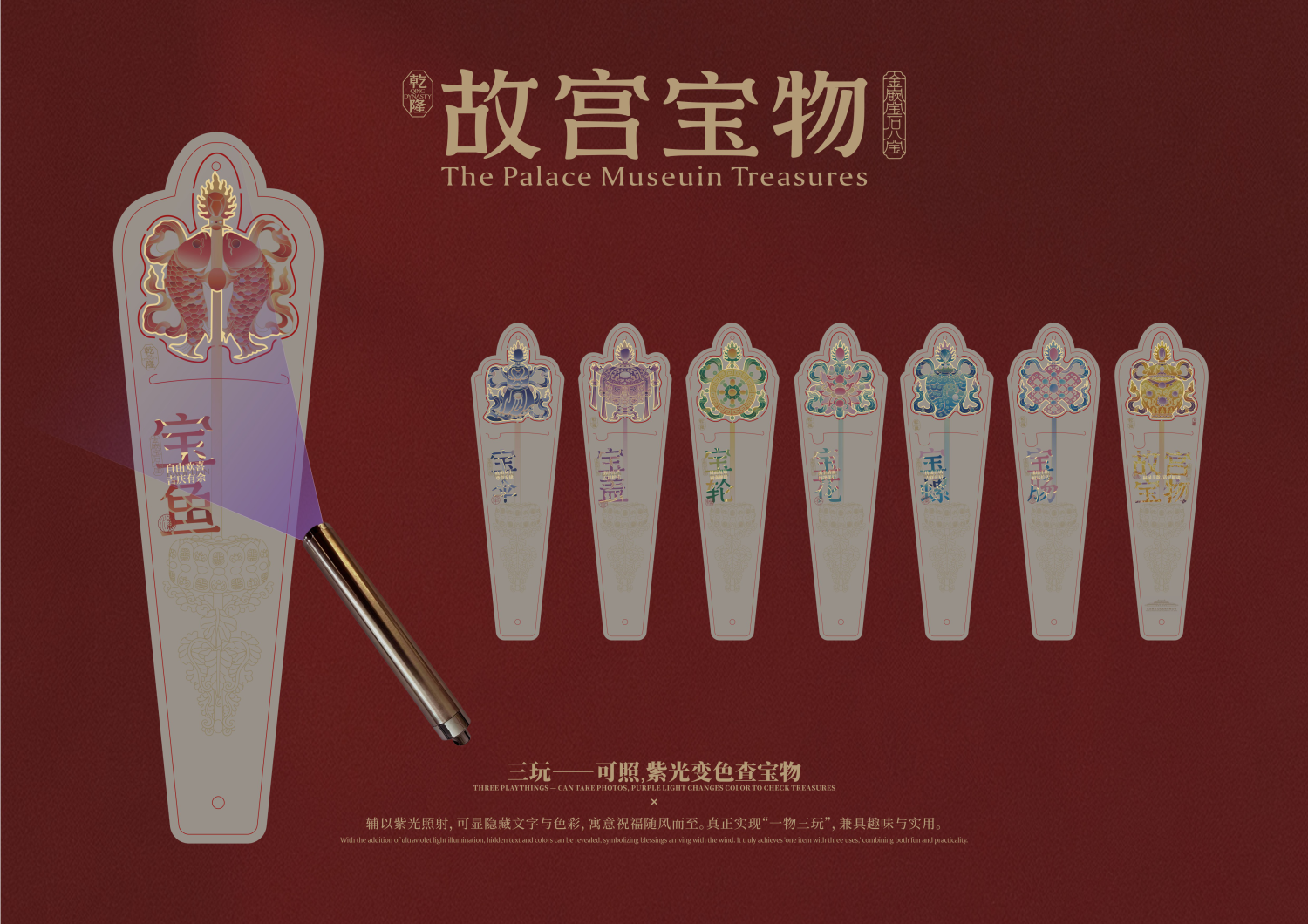 The fan surface uses an interlaced paper-carving structure, lightweight, secure, and refined. The detachable “Eight Treasures” illustrations can turn into bookmarks or pendants without affecting the fan’s function. Under UV light, concealed motifs emerge — symbolizing blessings carried by the wind.