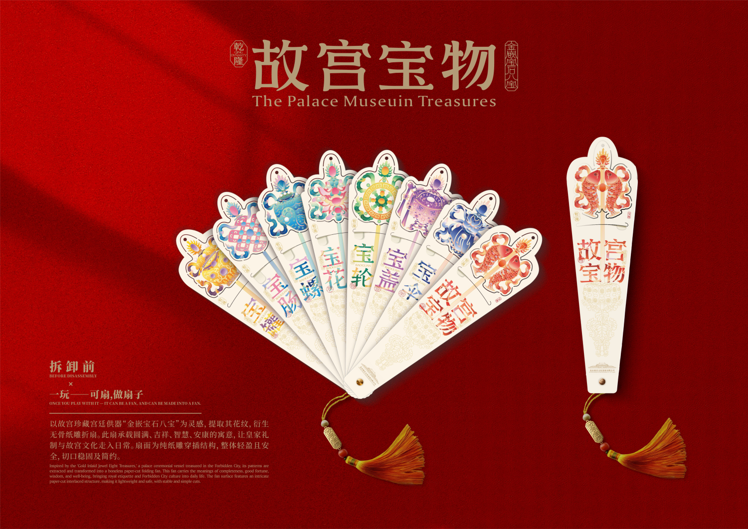 Inspired by the imperial court vessel “Eight Treasures Inlaid with Gold and Gemstones” from the Palace Museum, this fan extracts its ornate patterns and transforms them into a bone-free paper-carved folding fan. It embodies blessings of completeness, auspiciousness, wisdom, and well-being — bringing royal rituals and Forbidden City culture into daily life.