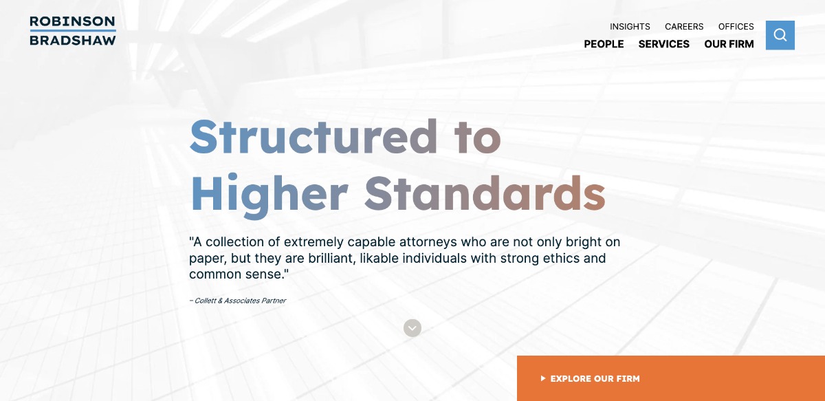 With over 170 attorneys, Robinson Bradshaw is known for its extraordinary track record of successful outcomes. The firm needed to update its online presence to reflect the cutting-edge nature of their practice, as well as the firm’s collegial culture, client-focused mindset, and forward-thinking attitude. Firmseek created state of the art imagery, infographics, and messaging to reposition and reinvigorate the firm's business development and recruiting efforts. The firm’s fully revamped website showcases their in-depth experience while making the site accessible, easy-to-navigate, and flexible for future growth.