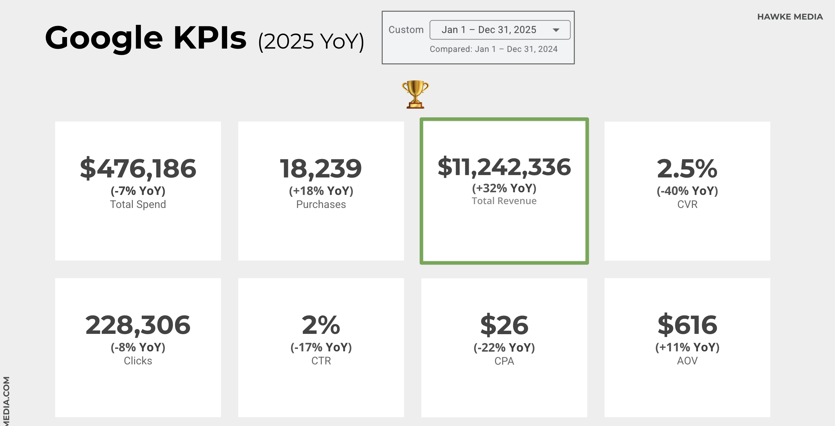 Rather than increasing spend to chase results, Hawke Media restructured the paid search strategy around efficiency, precision, and adaptability. On Google, the team reduced investment by 7% year-over-year while generating 32% more revenue. This resulted in a 22% decrease in cost per acquisition and an exceptional 2360% return on ad spend.