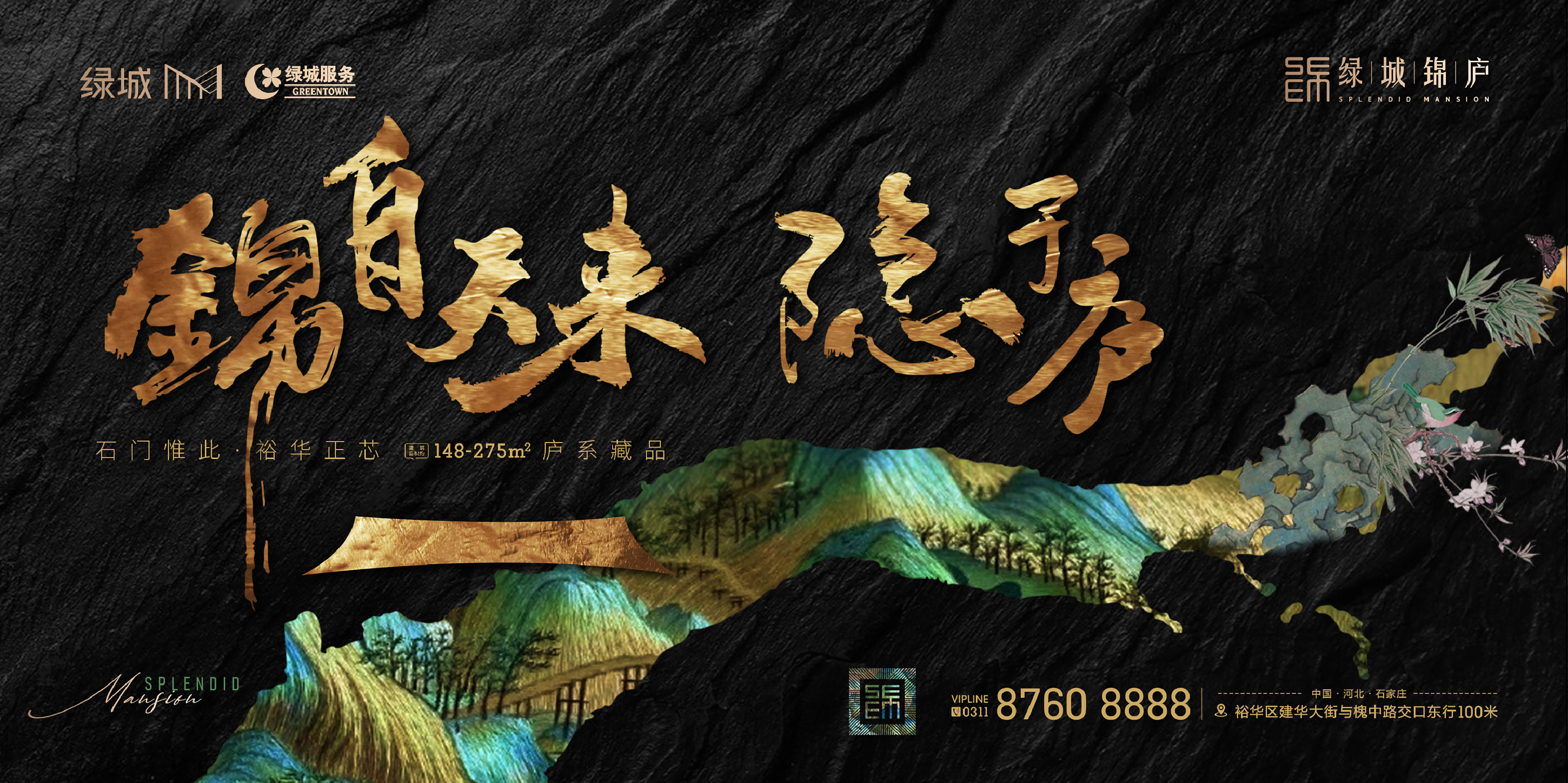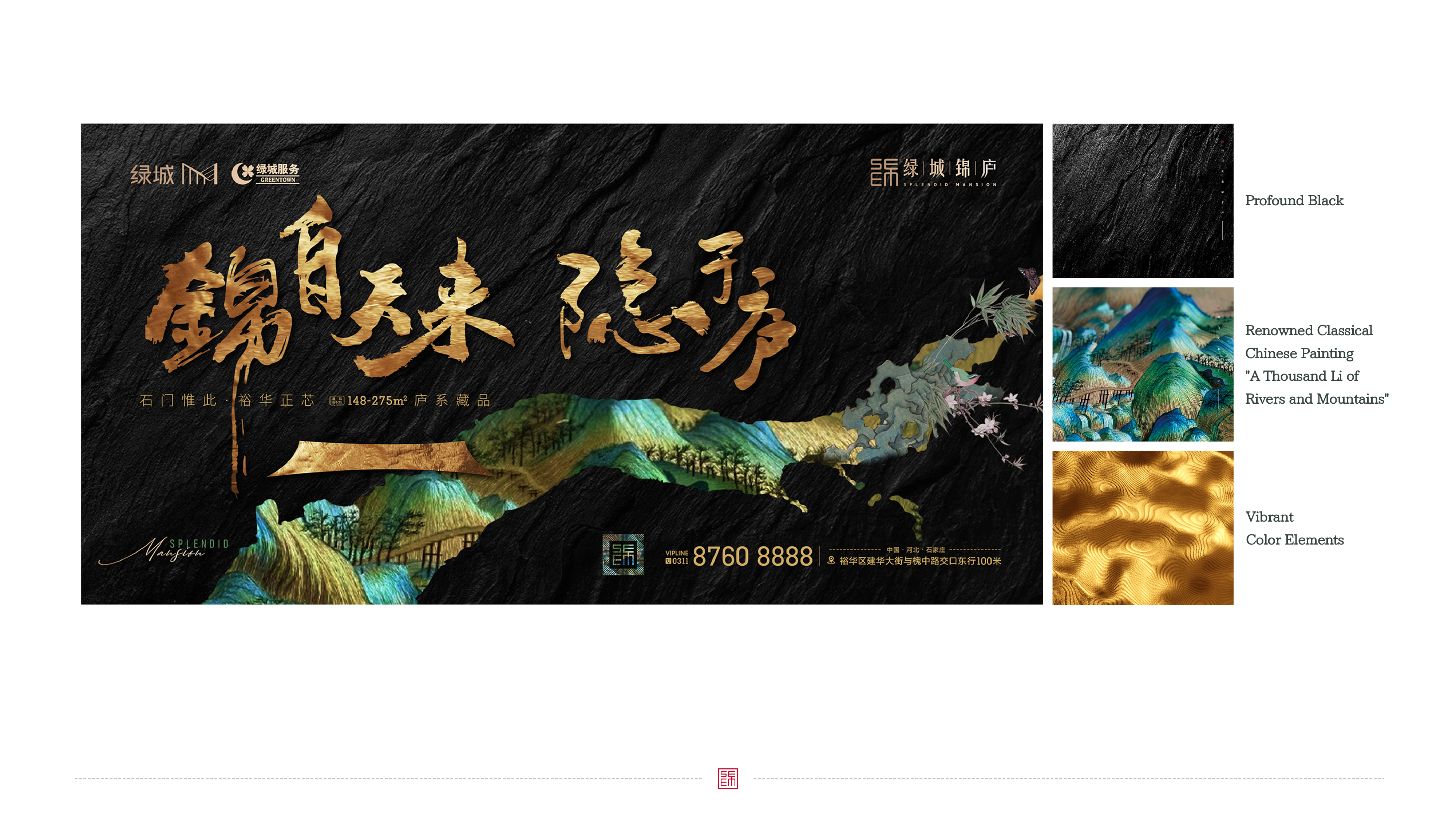 Dominated by the profound black, the primary poster features the renowned classical Chinese painting "A Thousand Li of Rivers and Mountains" as its background, blending with the essence of traditional culture. The strategic placement of vibrant color elements against profound black creates a notable visual contrast, significantly amplifying the sense of three-dimensionality. The design incorporates irregular strokes that echo the landscape features of the painting, alongside the seamless integration of structured eave patterns. This strikes a harmonious balance between vigor and grace, resulting in a visually rich and well-defined layered composition.