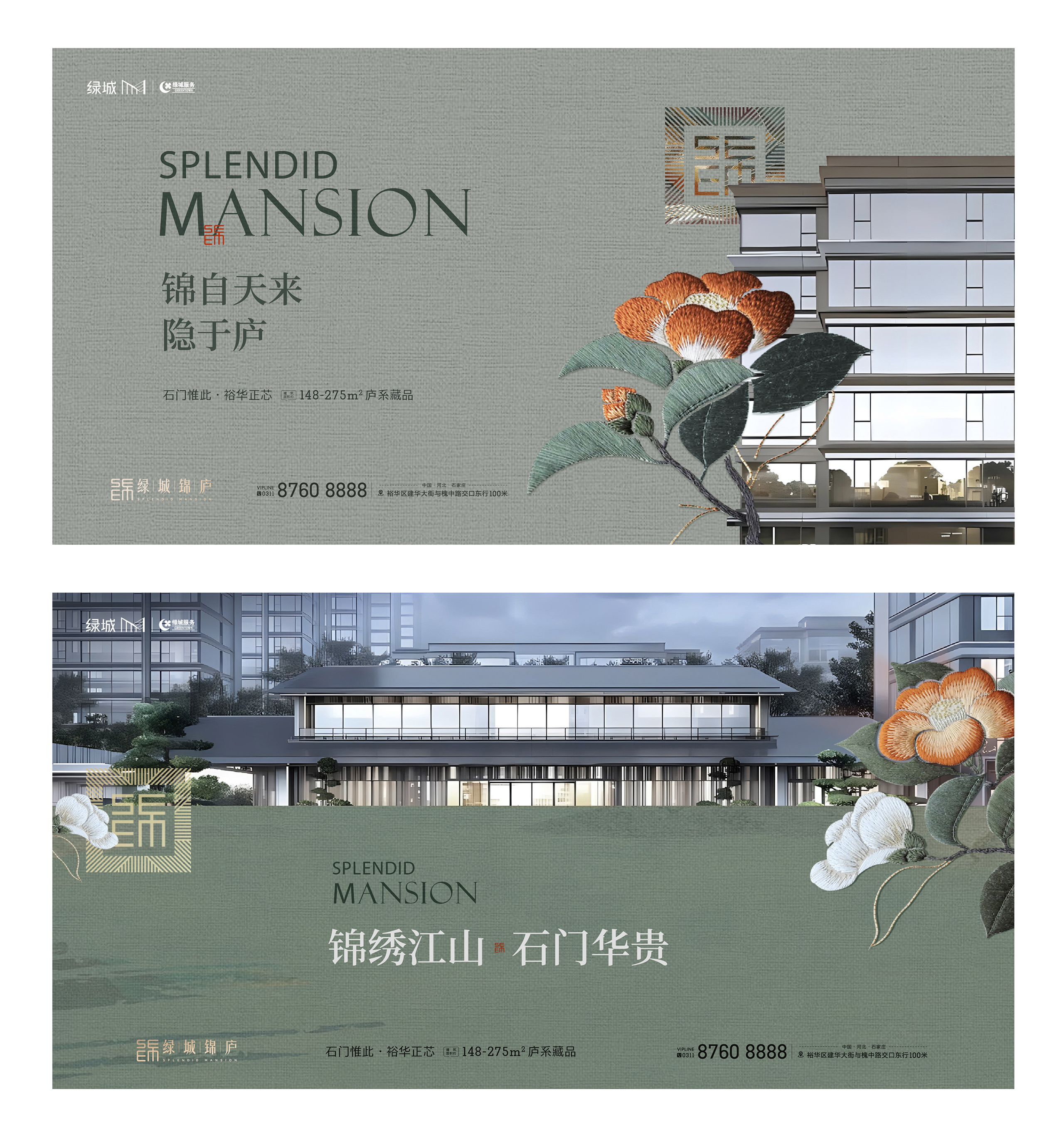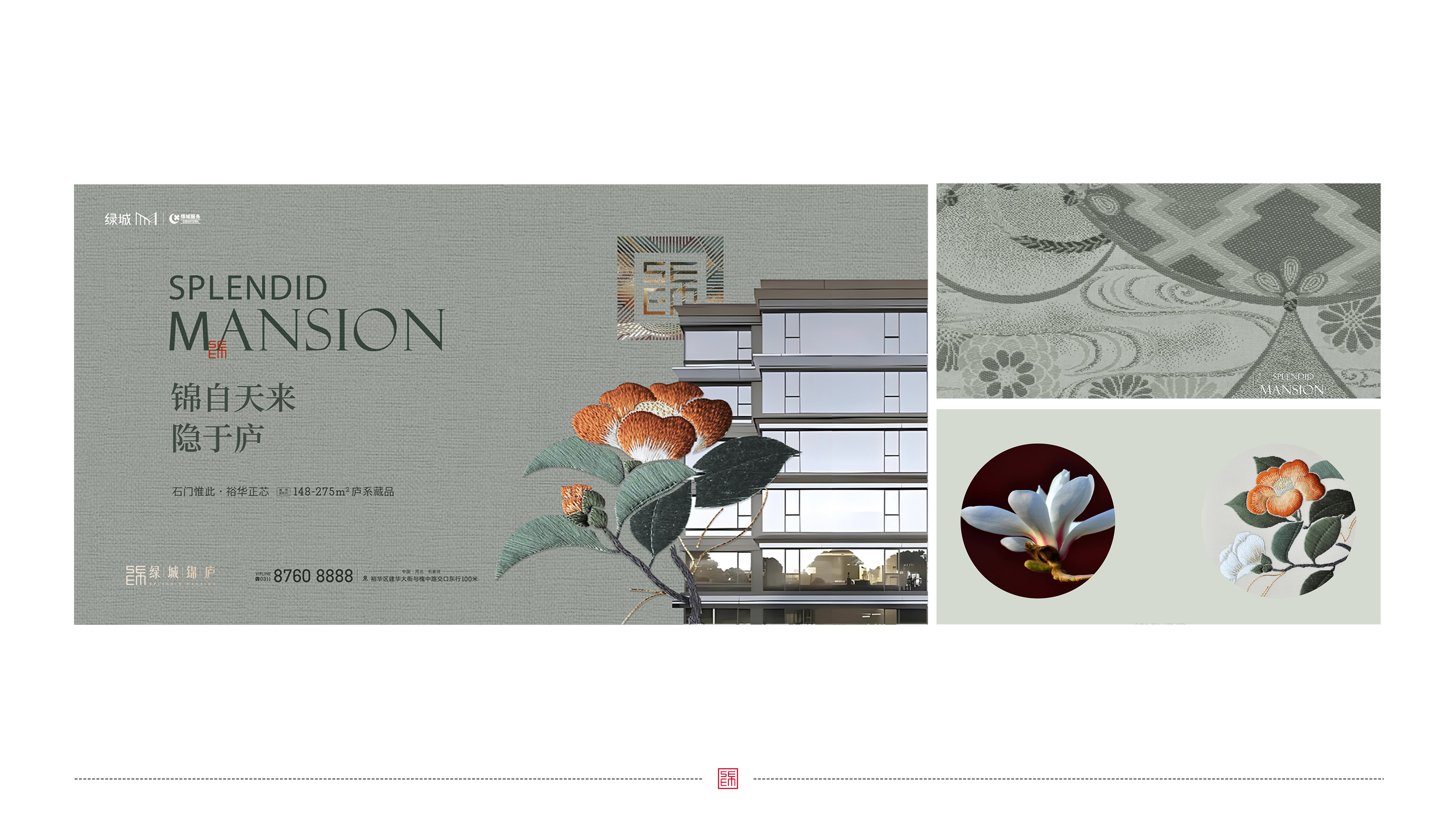 The project poster masterfully integrates the project facade with brocade details, employing a subtle fabric texture in the background to imbue the visual with a tactile dimension. Amidst the muted tones, vibrant embroidery motifs emerge with striking prominence, evoking "a single red flower in the midst of thick foliage." This contrast enriches the image's depth and amplifies its visual impact.