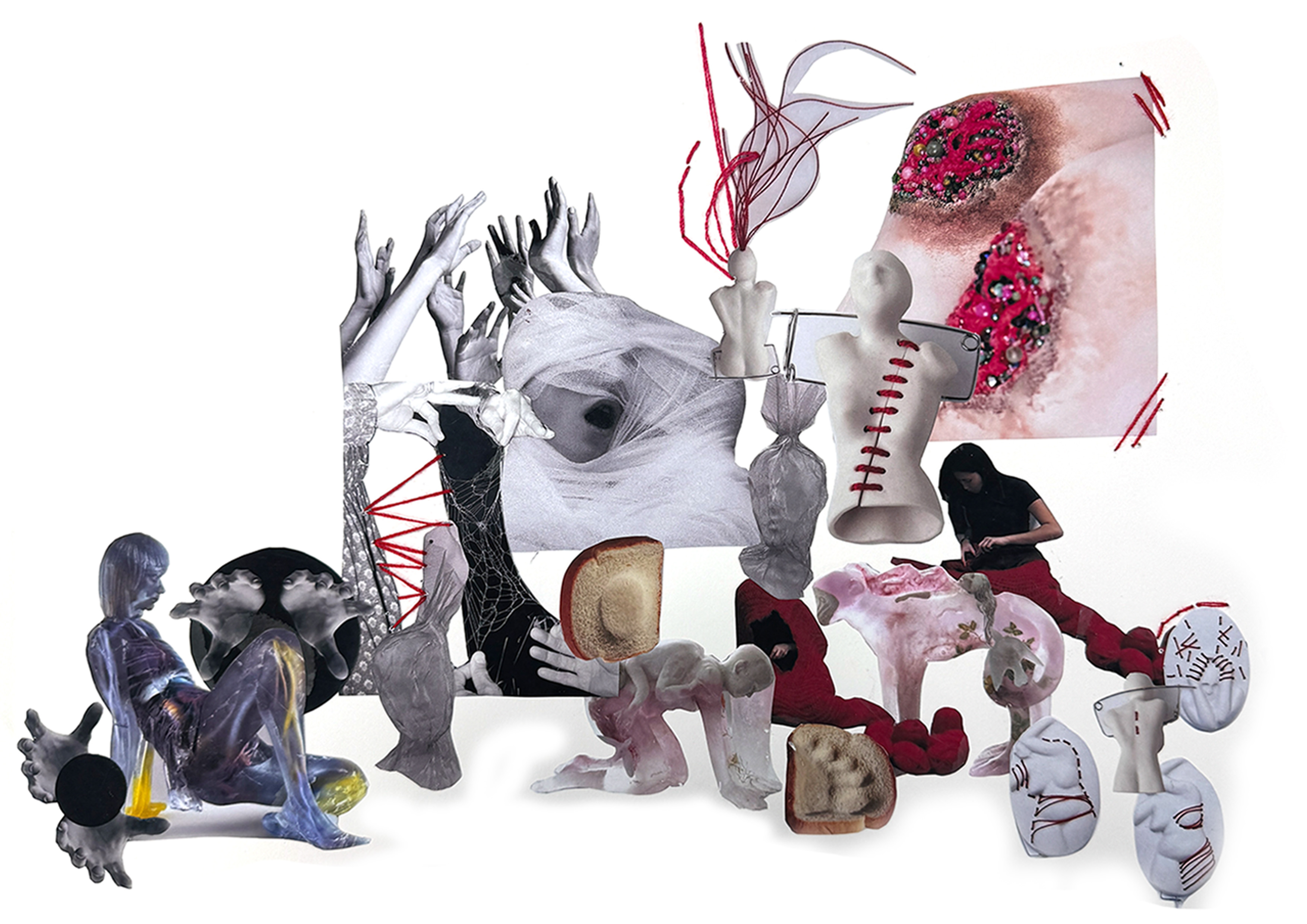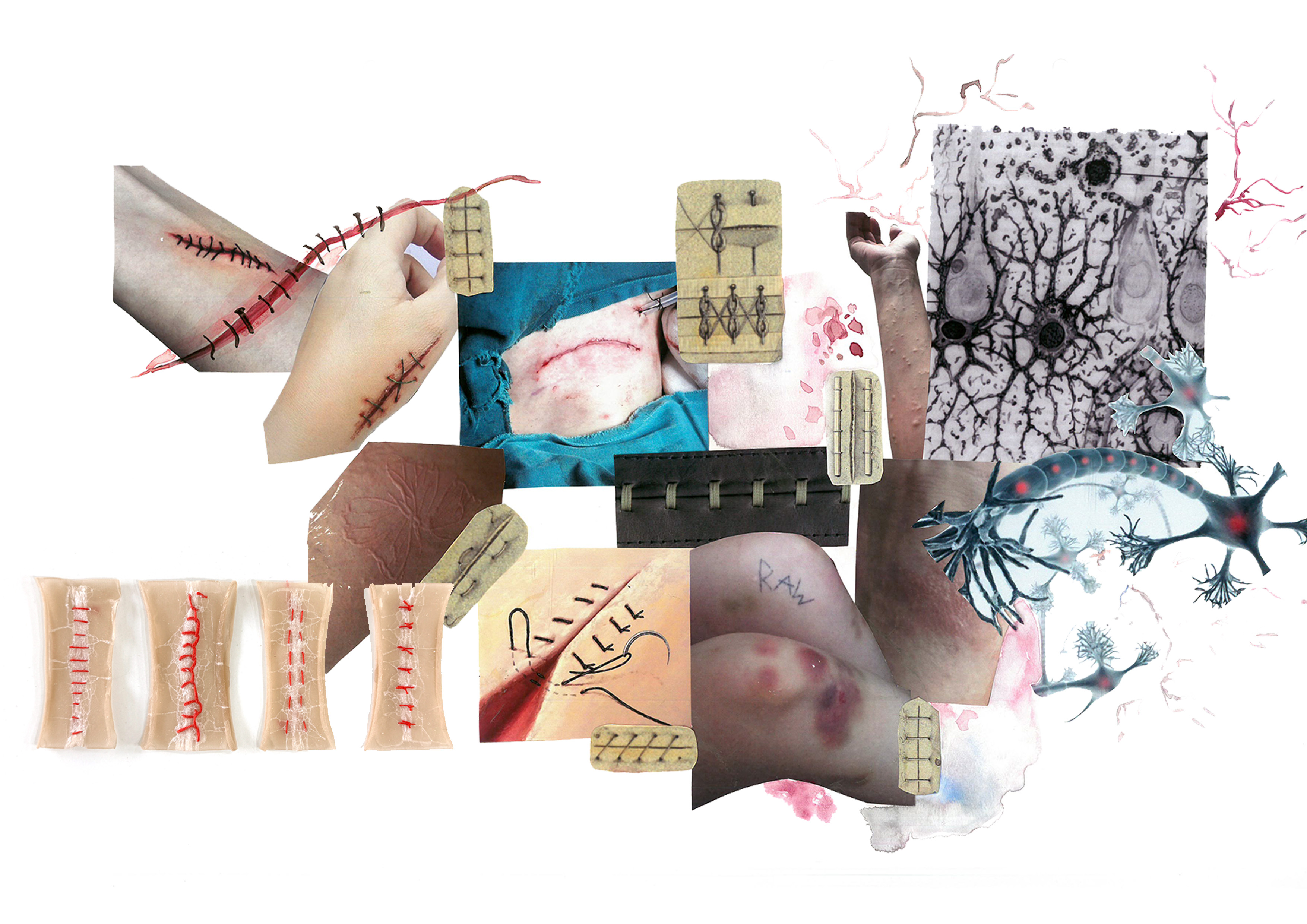 Inspired by emotional fluctuations and sensitive skin reactions, I used embroidery, wound sutures, and nerve transmission images to depict the experiences of highly sensitive people. Sutures inserted into wax-soaked fabric create a crack-like effect, while beads and lines simulate allergic skin reactions, showcasing touch and emotion.