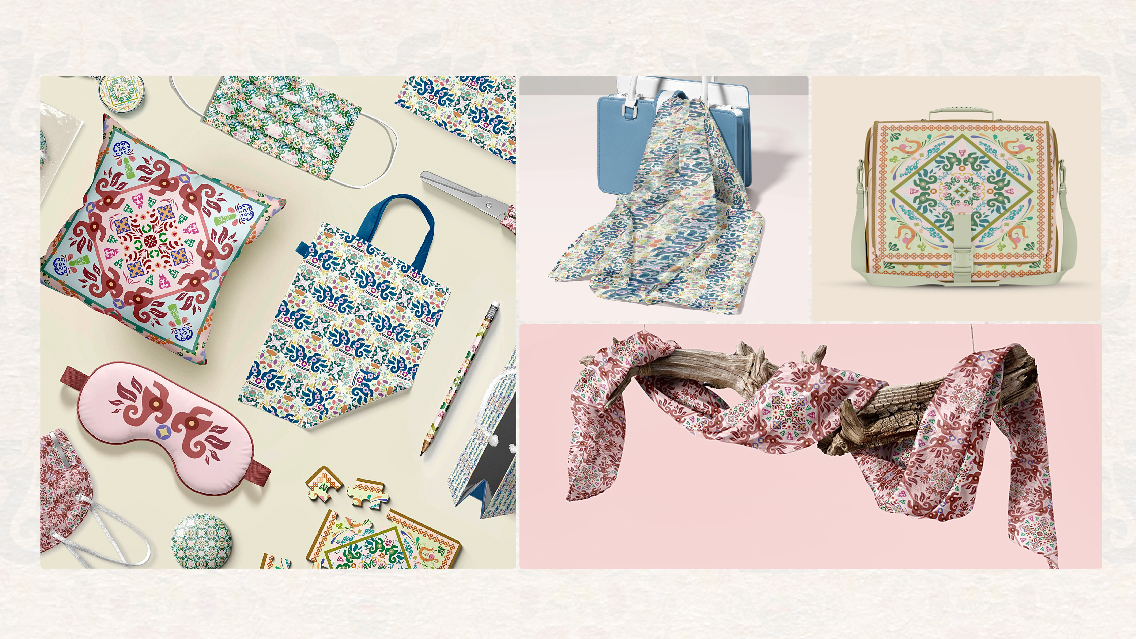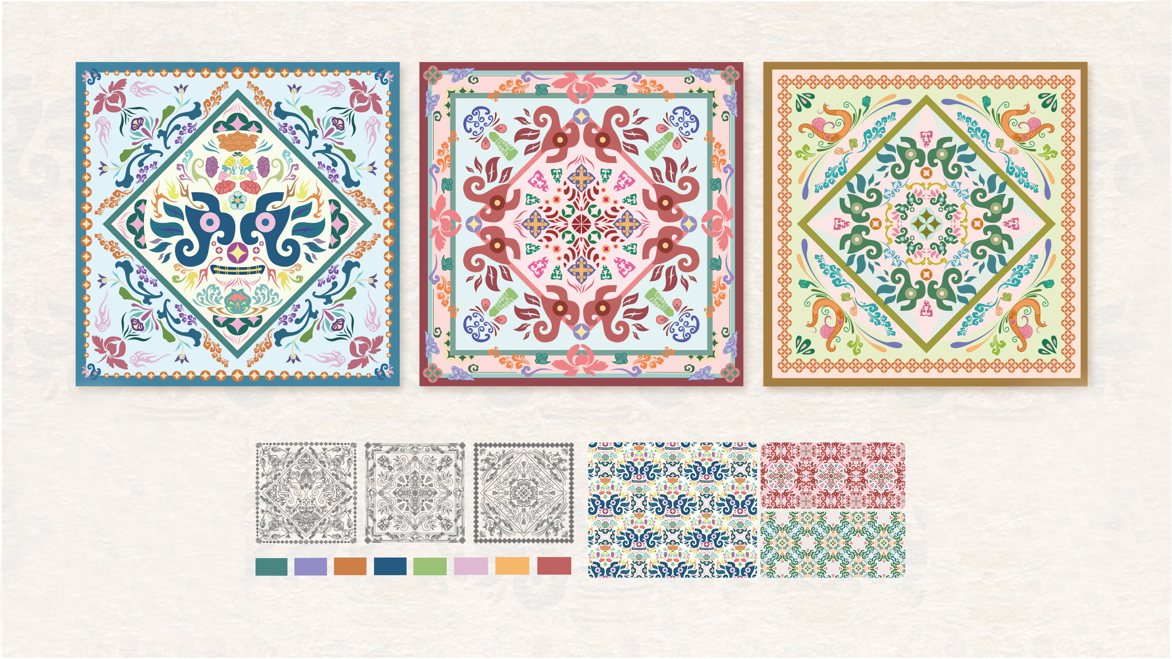 "Shu Jin Yun Shang" is an original series of pattern designs. I delved deep into the ancient Shu culture, drawing inspiration from the exquisite craftsmanship of thousand-year-old Shu brocade and the mysterious totems of the Sanxingdui civilization. The core of this series lies in deconstructing and reassembling these classic traditional symbols, imbuing them with new vitality through a modern design language. The result is a collection of unique visual patterns that possess both profound cultural heritage and a contemporary aesthetic. I selected the "square-holed coin pattern," symbolizing auspiciousness and wealth, as the foundational framework, integrating it with dynamic "cloud patterns." More significantly, highly representative elements such as the Sanxingdui "beast-face patterns" and "phoenix patterns," along with Chengdu's city flower, the "hibiscus," have been innovatively combined. These seemingly independent elements, through meticulous design, form a new, harmonious, and unified pattern system rich in narrative, exhibiting a unique visual dynamism. Each pattern combination carries profound cultural symbolism and emotional connections. The square-holed coin pattern signifies completeness and good fortune; cloud patterns symbolize lofty aspirations and auspiciousness; phoenix and beast-face patterns convey the mystery and vitality of the ancient Shu civilization; and the hibiscus flower represents the elegance and prosperity of Chengdu. These innovatively designed patterns are not just aesthetic visual presentations but also vivid narrations of the thousand-year-old cultural stories of the Shu region. This series of patterns is an innovative interpretation of traditional cultural symbols within a contemporary design context. Its charm lies not only in the reinterpretation of individual elements but also in the harmonious coexistence and revitalized combination of diverse cultural symbols. These meticulously designed patterns possess excellent scalability and adaptability, suitable for a wide range of applications including silk scarves, home textiles, fashion accessories, and various cultural and creative products, thereby infusing different carriers with a unique cultural temperament and artistic beauty.