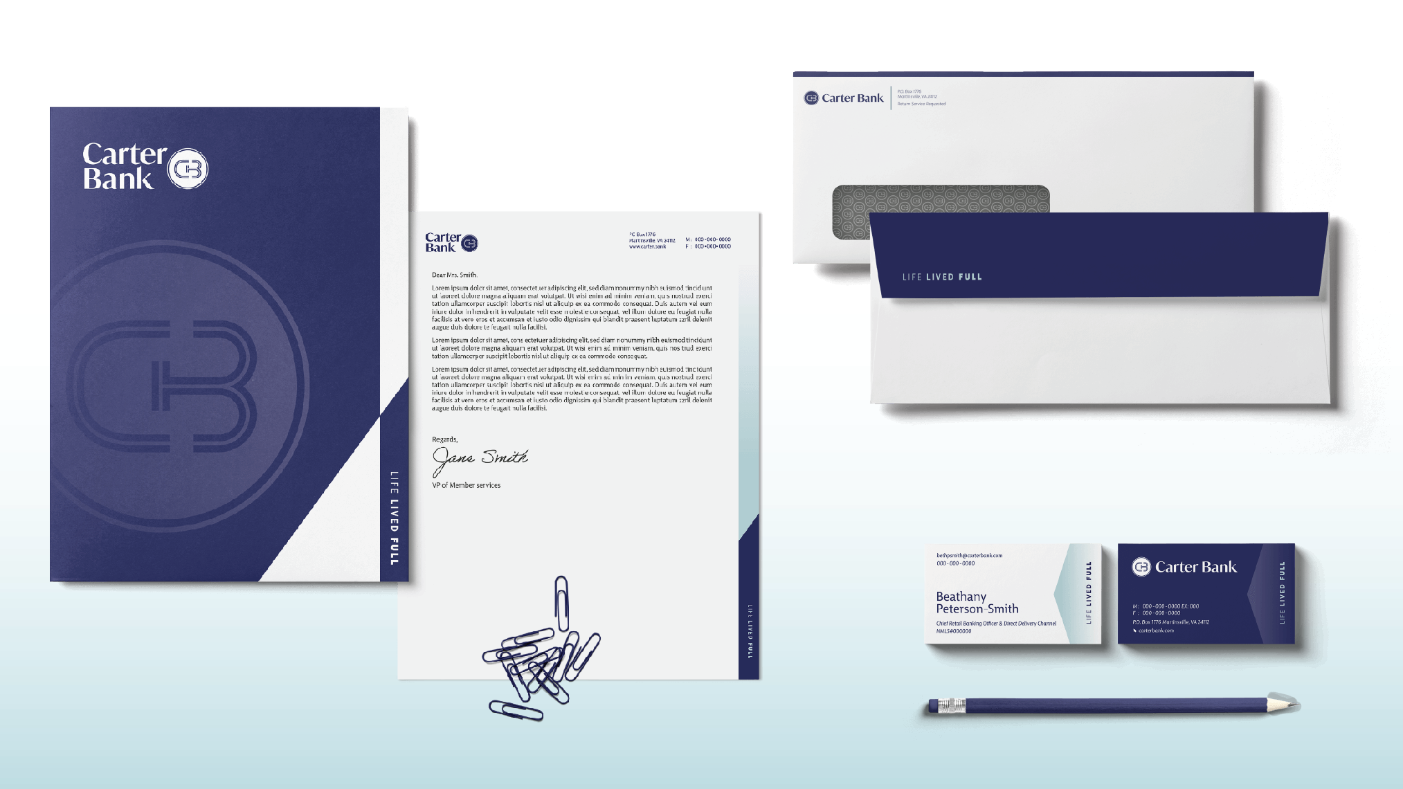 Visually, the new identity strikes a balance between tradition and progress. A custom wordmark with interlocking letterforms reflects strength and connection. The color palette blends warmth and optimism. Typography and layout systems prioritize clarity and accessibility. Every brand element, from branch signage to business cards, was rebuilt to reflect Carter Bank’s values of trust, humility, and partnership.