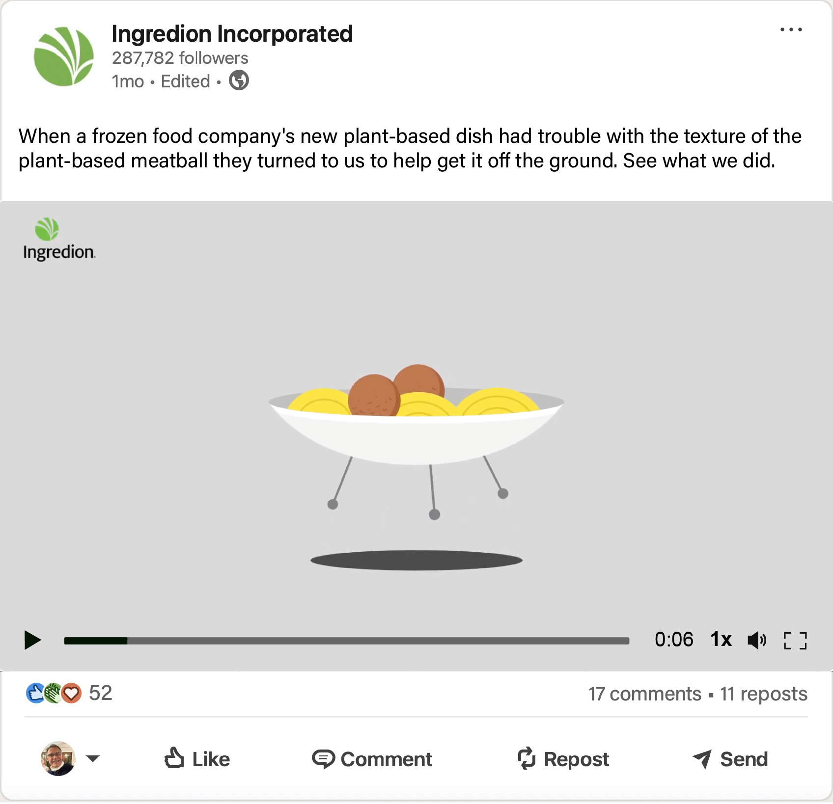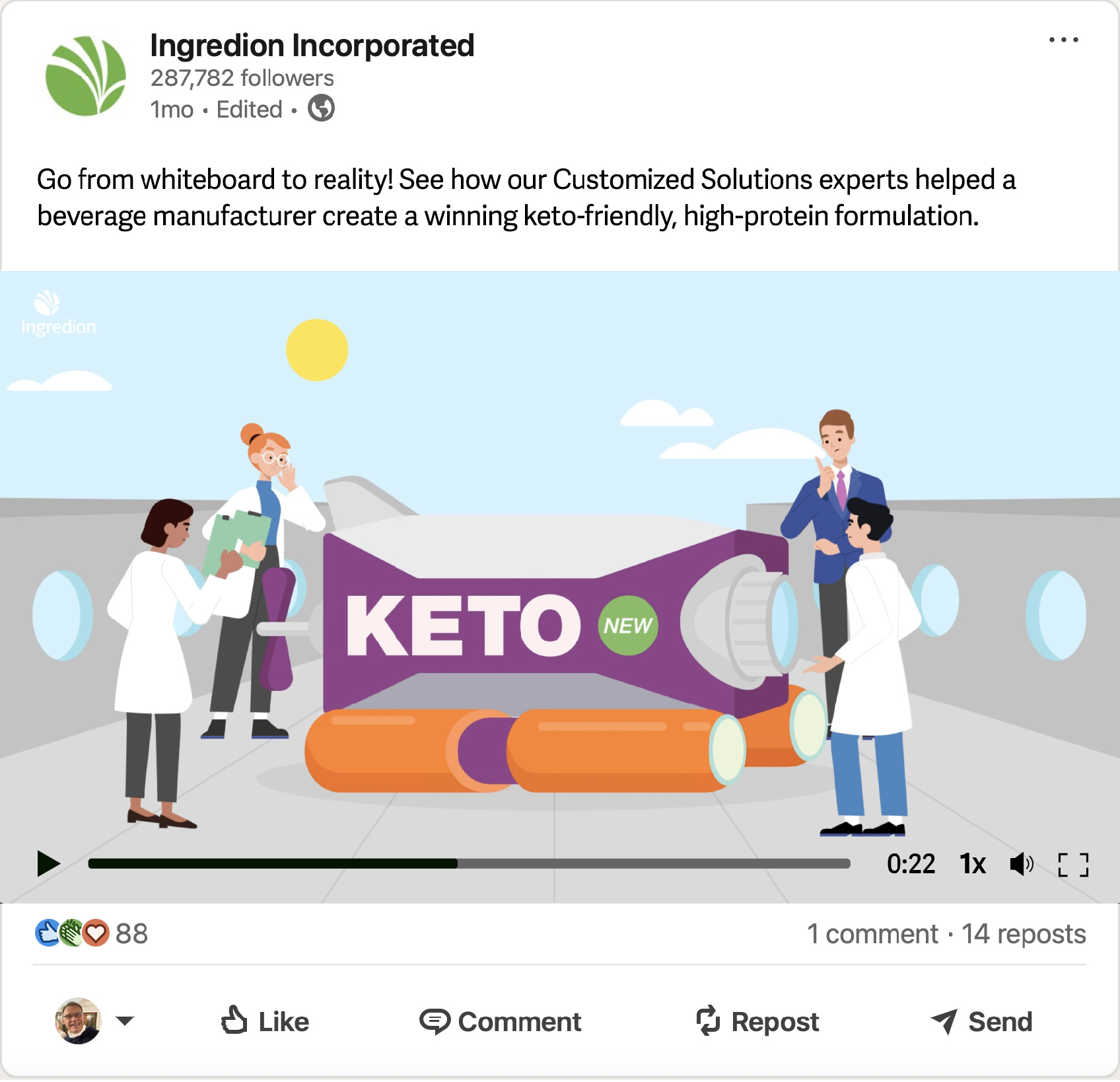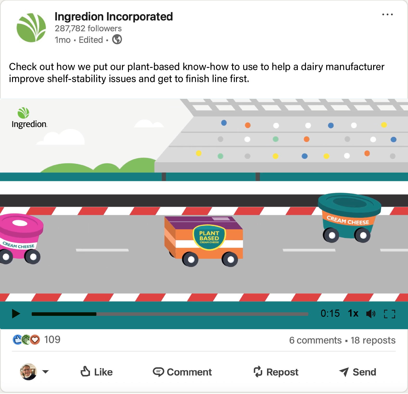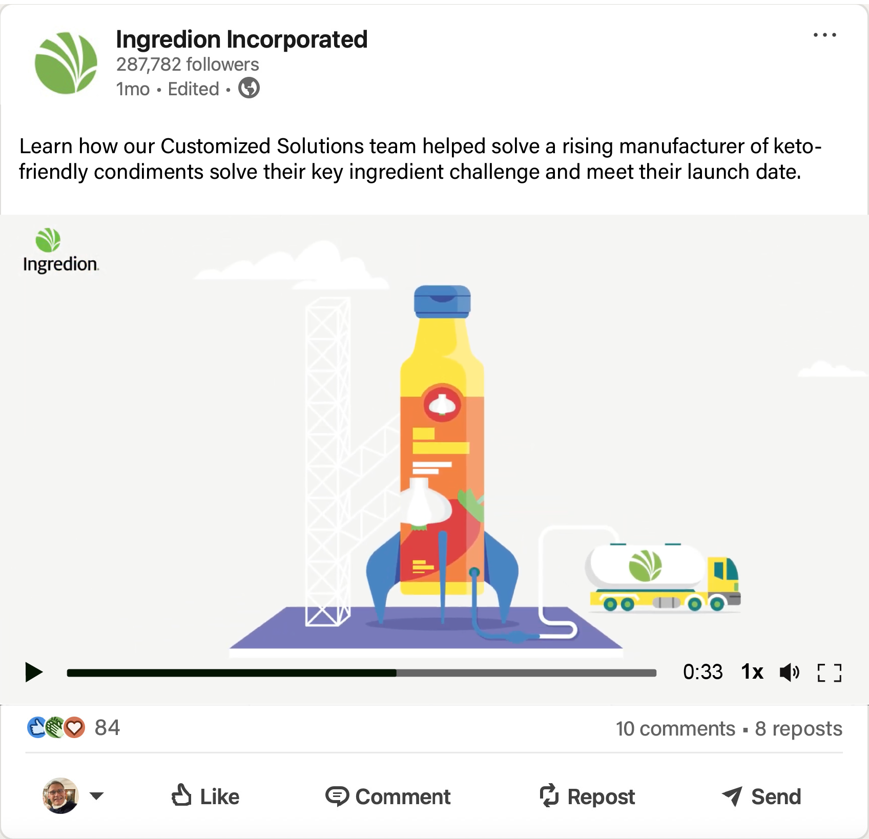 To echo Ingredion’s commitment to innovation, we utilized video storytelling to showcase Ingredion’s past collaborations with food and beverage manufacturers, rather than a traditional downloadable PDF case study. Each 60-second animated video highlighted the challenge the manufacturer faced and how Ingredion’s team of experts helped solve the formulation challenge, reduce the time to market and improve sales. The campaign was promoted through a series of emails and sponsored LinkedIn posts.
