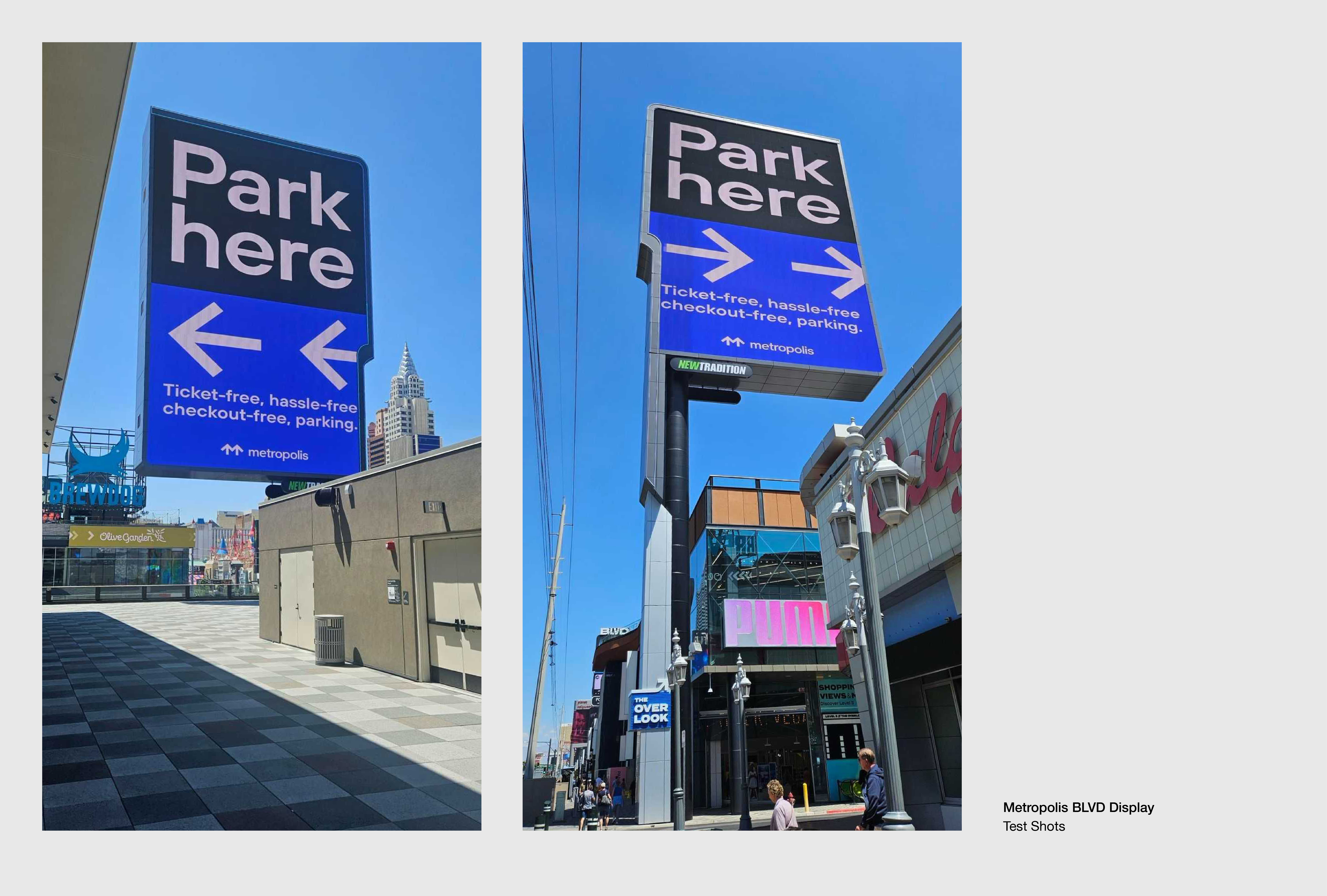 Metropolis BLVD Display is a monumental dynamic signage system redefining wayfinding in the heart of Las Vegas. Designed as a bold urban intervention, the installation features animated directional arrows and fluid transitions that intuitively guide drivers to parking destinations while creating a seamless flow within the city’s bustling environment. Its minimal yet powerful visual language reinforces Metropolis’ identity and, with its striking scale and kinetic visuals, captures attention across the urban landscape, transforming functional signage into an iconic digital landmark that resonates with the city’s fast-paced energy and vibrant character.