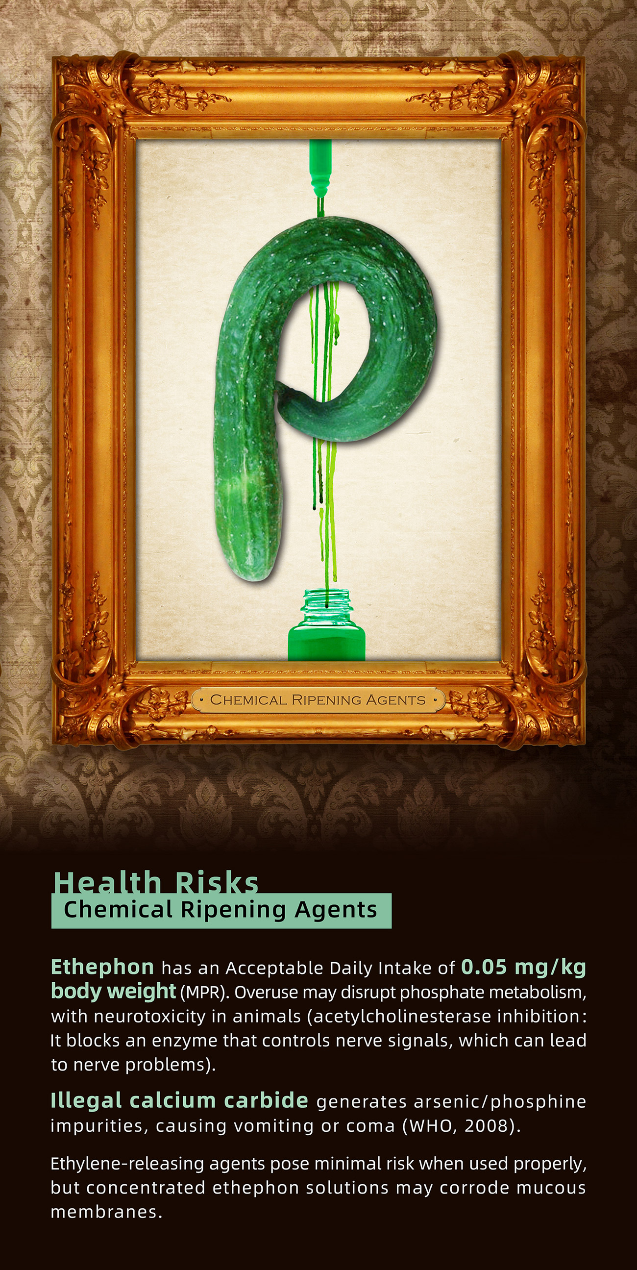 This public service poster, featuring a "STOP" sign meticulously composed of fruits and vegetables, employs a powerful visual language to expose the underlying risks of the "appearance-first" mindset in modern food consumption. It aims to spark public concern and critical reflection on the issue of food safety.