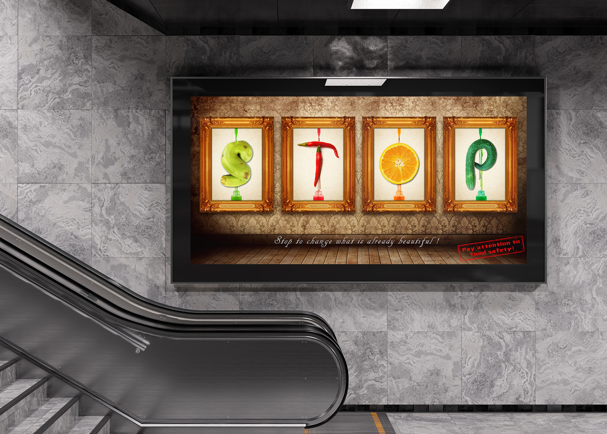 To counter this, the design leverages the world's most universally recognized visual command: the "STOP" sign. It delivers a stark warning by constructing this symbol from richly-colored, alluring produce, creating a powerful contrast between "beauty" and "danger." This seemingly attractive yet inherently risky visual paradox immediately provokes the viewer's curiosity and vigilance, compelling them to re-examine their own consumption habits.