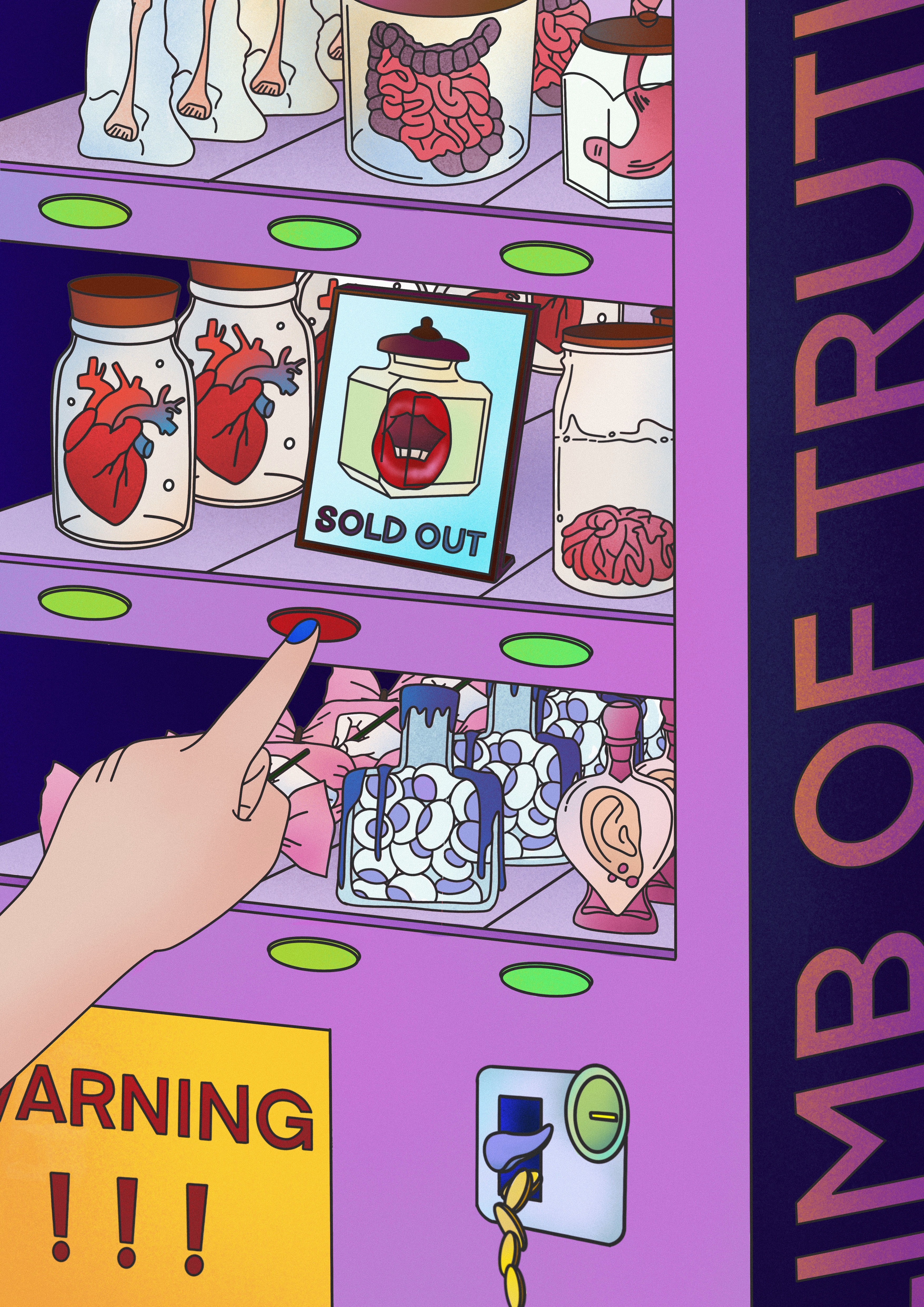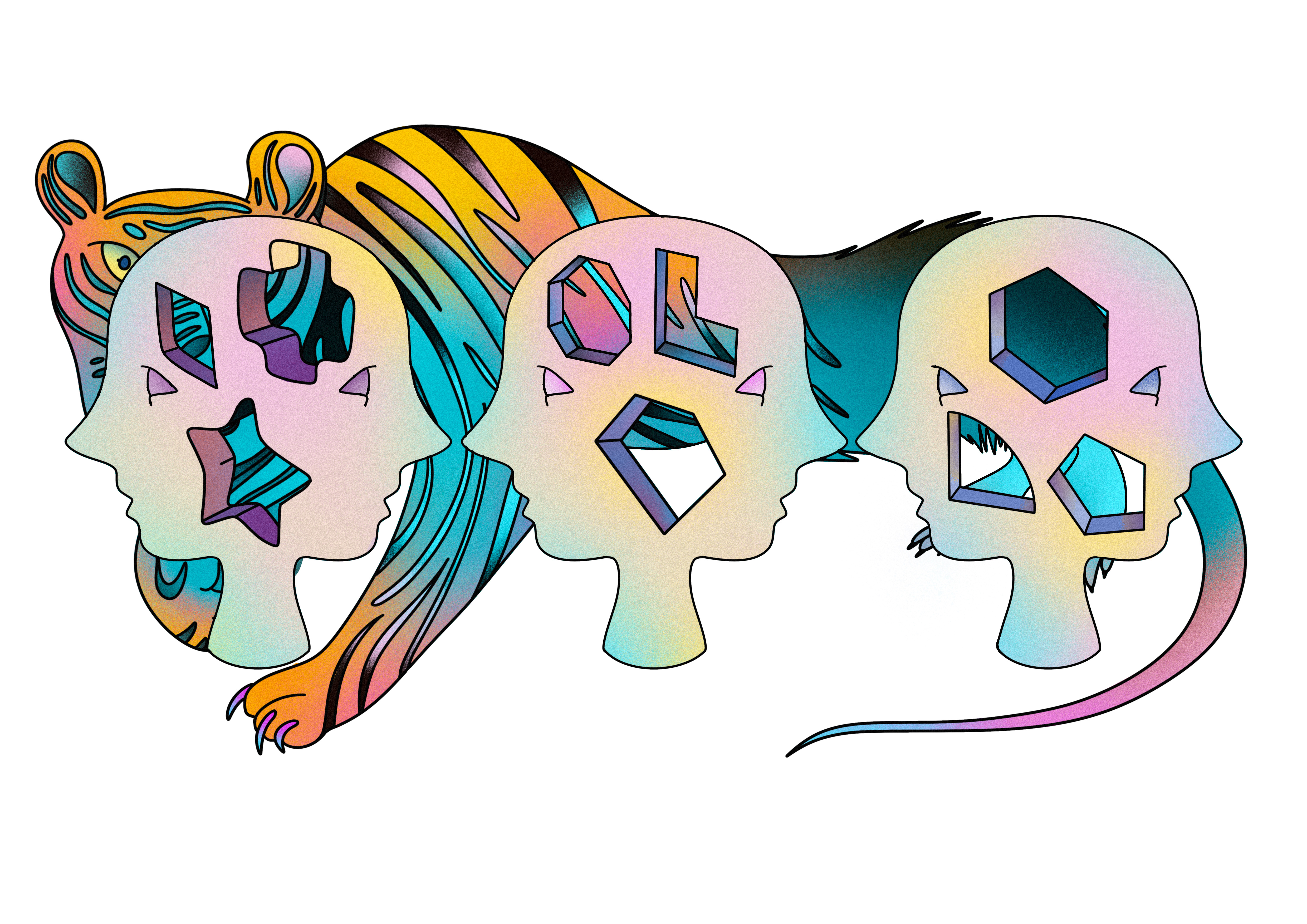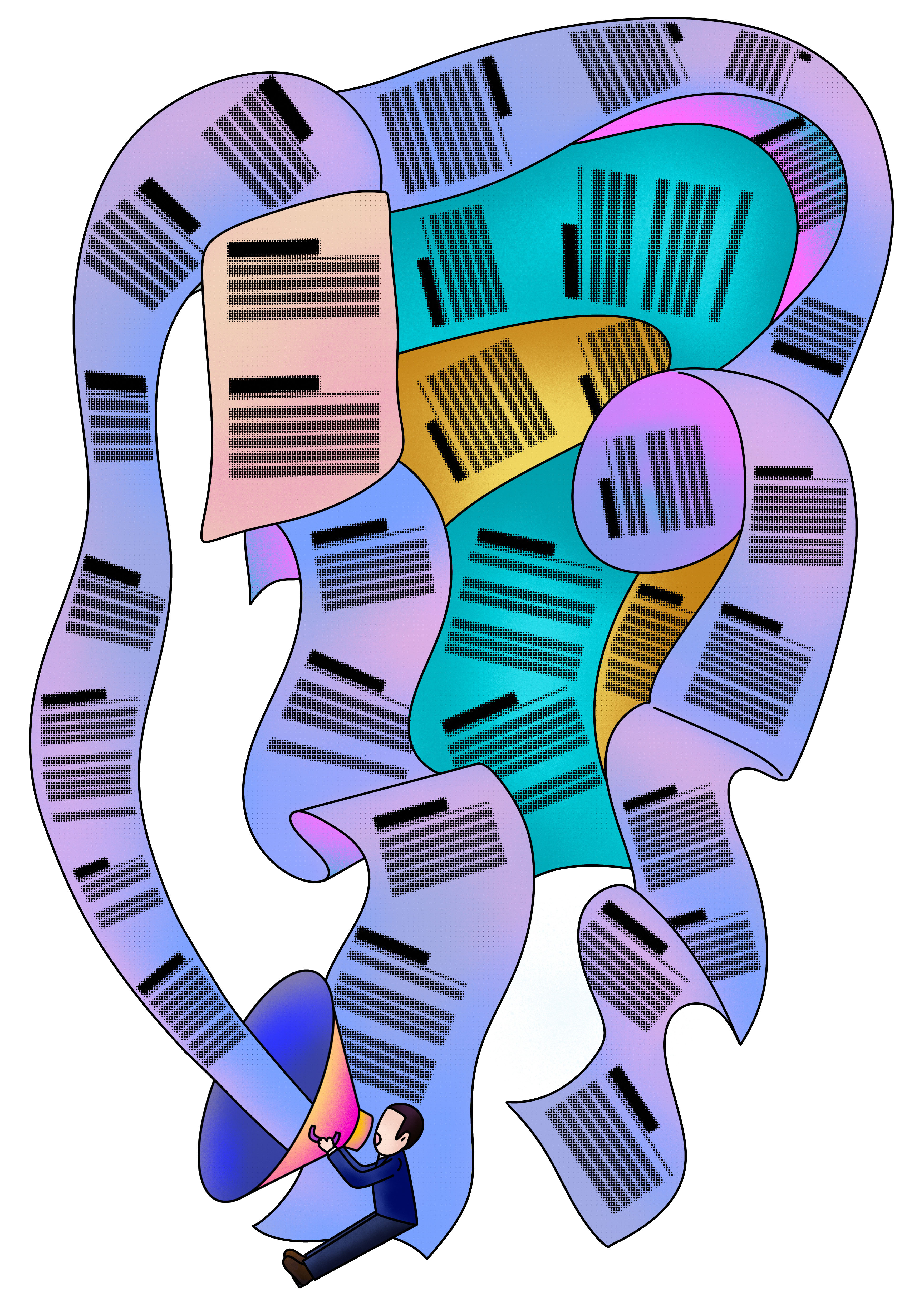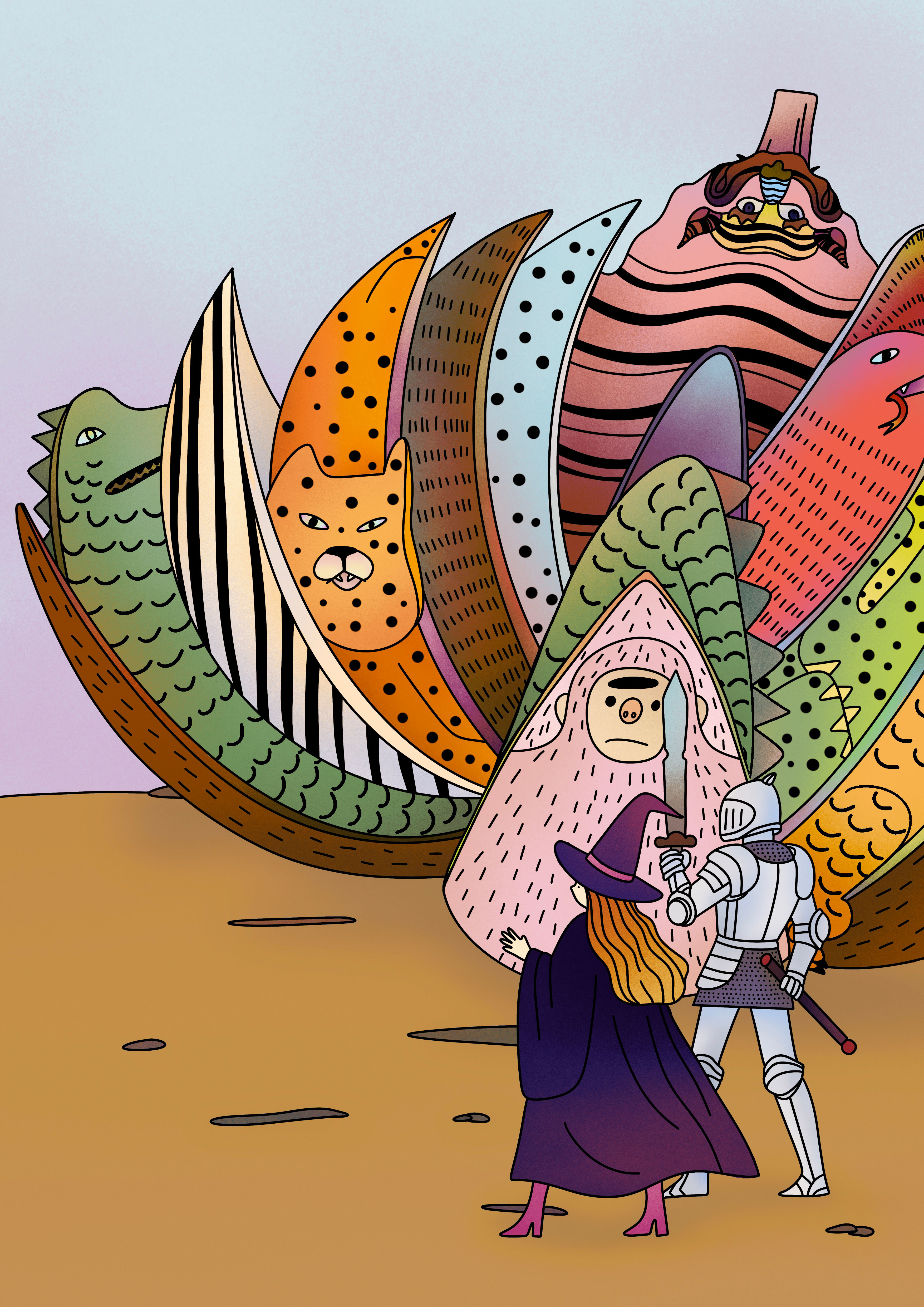 This series, Neglected Boundaries, begins with emotional fissures and subtle silences in daily life, questioning how individuals preserve authenticity and difference within grand narratives and public norms. Using hand-drawn lines, color blocks, and scenes where the figurative and abstract intertwine, it expresses unnamed emotions and a longing for multiple interpretations. The Elephant in the Room turns leaders’ bureaucratic language into airborne elephants, reflecting on how authority enforces singular readings; The Onion-like Truth depicts the endless, layered search for truth; The Truth’s Body-Part Vending Cabinet imagines truth as a shelf commodity, mirroring fervor for lies and embellishment; Three Men Make a Mouse shrinks a tiger into a mouse, satirizing distortion through repeated retelling. Here, art is both expression and an ongoing act of self-writing and resistance.