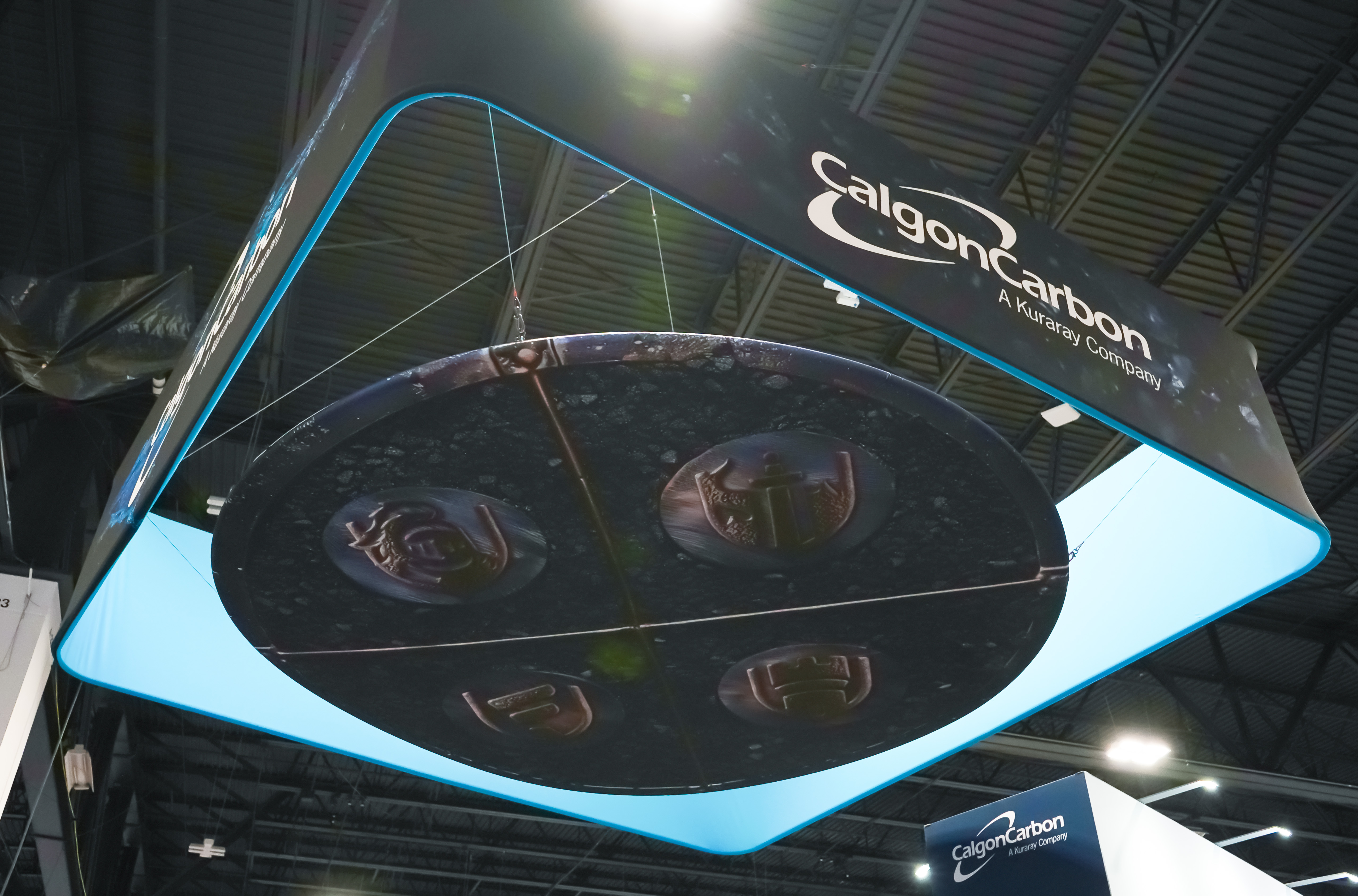 The booth featured a striking suspended ceiling element in Calgon Carbon's signature blue, incorporating branded medallions displaying their four core service pillars. The sophisticated color palette of deep blue, cyan accents, and clean whites reinforced brand recognition across the exhibition floor.